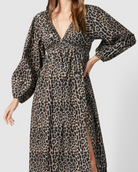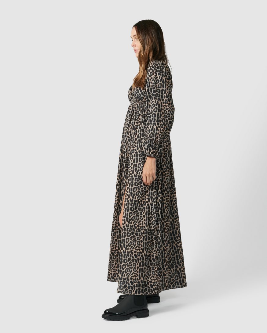 The Oslo is a stand out dress, perfect for those Winter evenings. In an iconic Leopard print with flowy long sleeves, a deep v- neckline and a gorgeous mid-thigh slit, this piece is one you'll love forever!