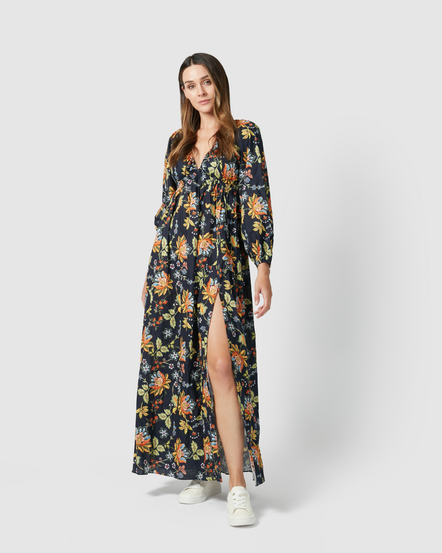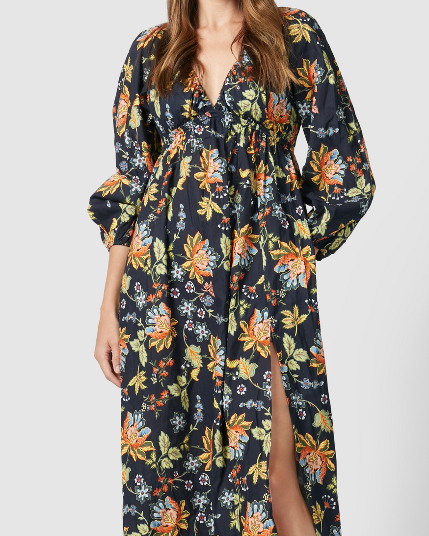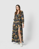 The Oslo is a stand out dress, perfect for those Winter evenings. In an bold Navy Floral print with flowy long sleeves, a deep v- neckline and a gorgeous mid-thigh slit, this piece is one you'll love forever!