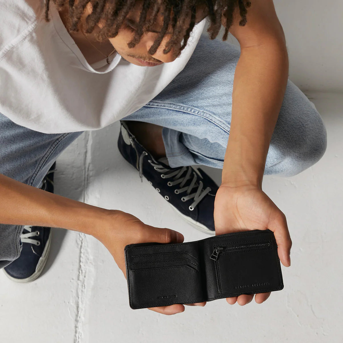 Not that we're proponents of bulk in ones pocket, but should you be looking for a wallet that carries everything whilst maintaining its cool - Leonards your guy. Designed so you can have access to your cash, coins and most frequent cards on opening. There's also another compartment under the snap button for additional (less used) cards and ID space.