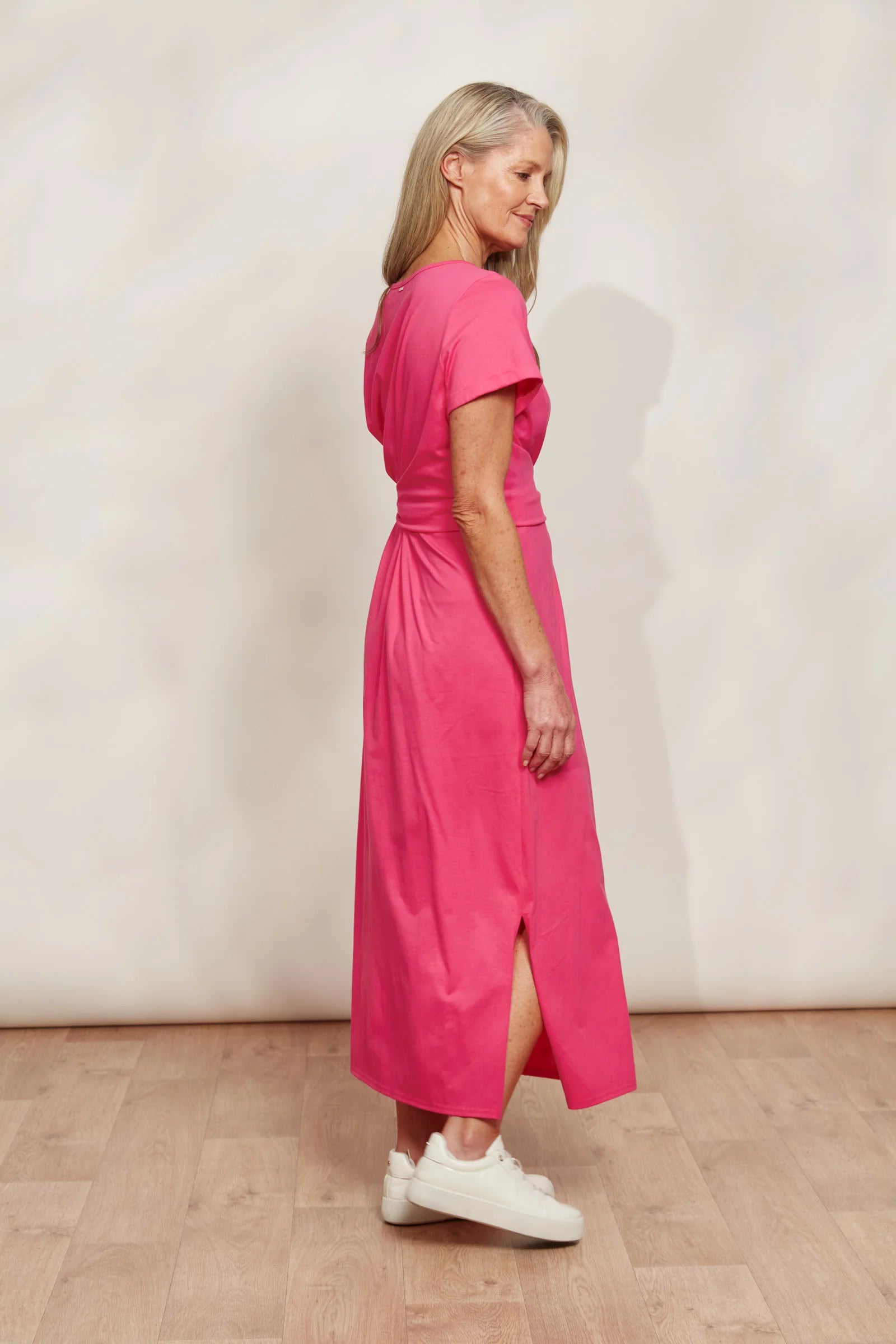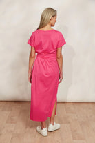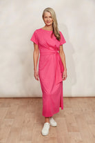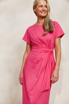 Say goodbye to morning outfit stress—this throw-on-and-go midi-dress makes getting dressed a breeze. Its mock wrap design, complete with a self-fabric tie at the waist, adds a touch of effortless chic to your look. Made with a stretchy cotton construction, short sleeves and a midi-length featuring high-side vents, it's a comfortable and stylish choice for all-day wear. Whether you pair it with sneakers or slides, you'll always feel put together in this dress.