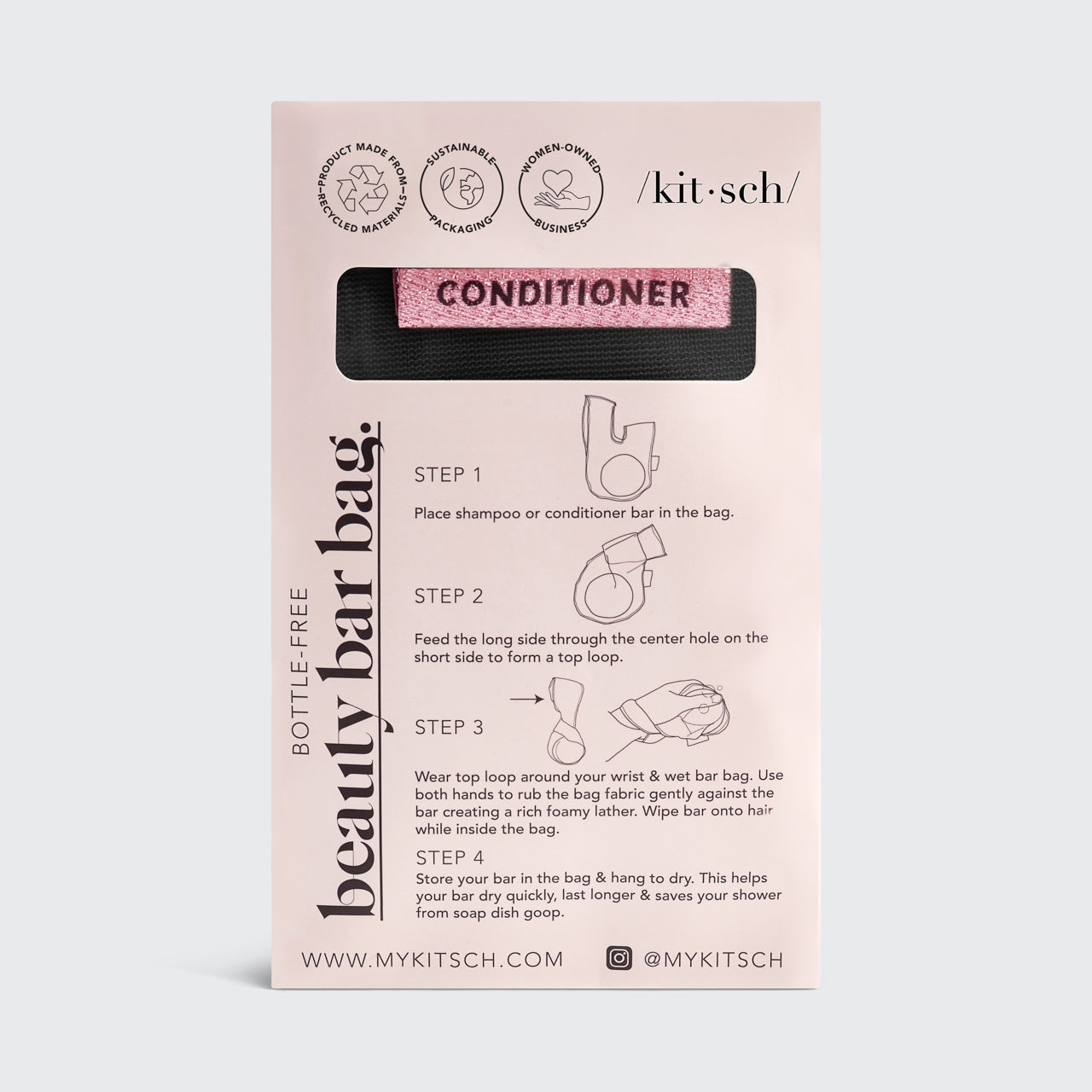 Mesh fabric creates a thick, foamy lather for luxurious washing. Preserves the life of your bar. Hangs neatly allowing 360° airflow to dry your bars quickly. Made of sustainable rPET. "Shampoo" and "Conditioner" tag identifiers so you never mix up your bars! 𝐂𝐚𝐫𝐞 𝐈𝐧𝐬𝐭𝐫𝐮𝐜𝐭𝐢𝐨𝐧𝐬 • Machine washable • Hang to dry