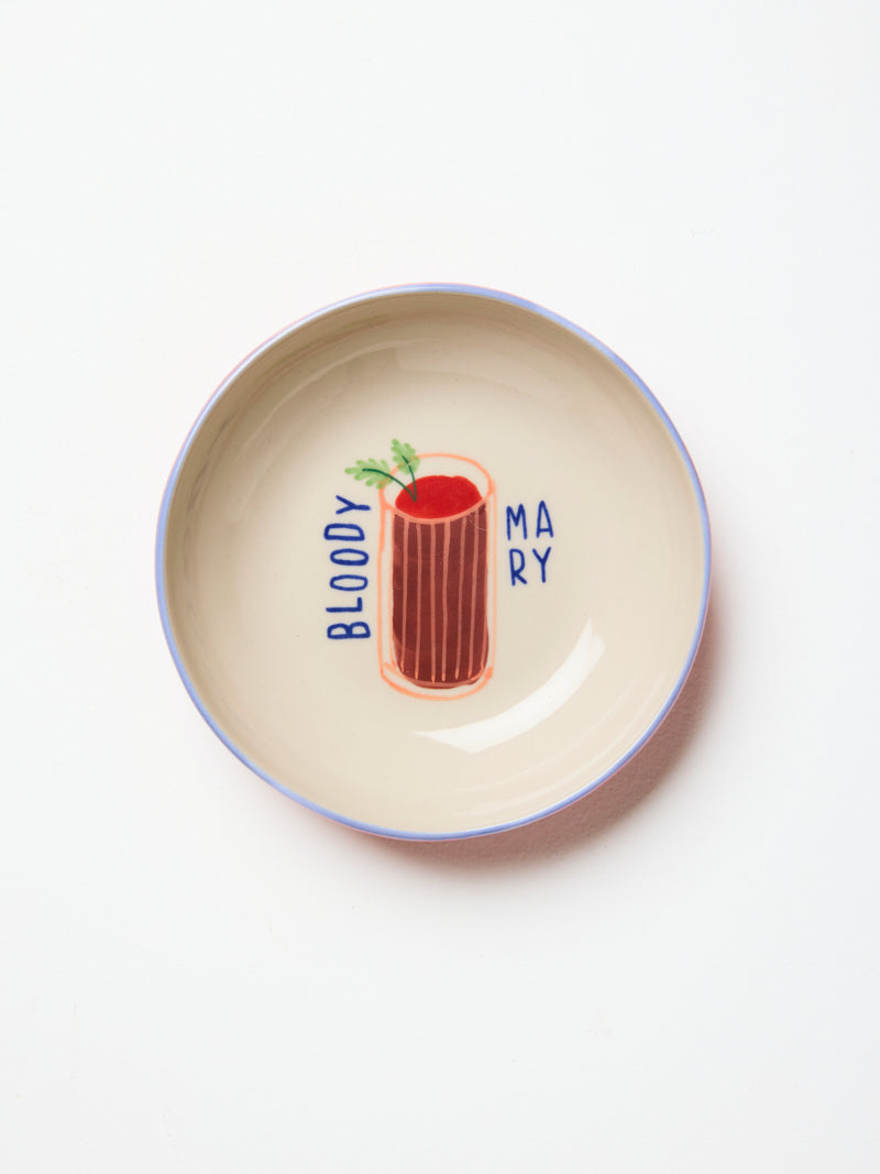 A little bit spicy and full of charm. This Bloody Mary snack bowl features a sky blue rim and tomato-red base - a playful cocktail motif in the centre. Ideal for celery sticks, anchovy olives or anything salty. Also: highly giftable