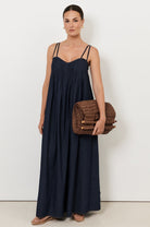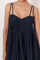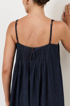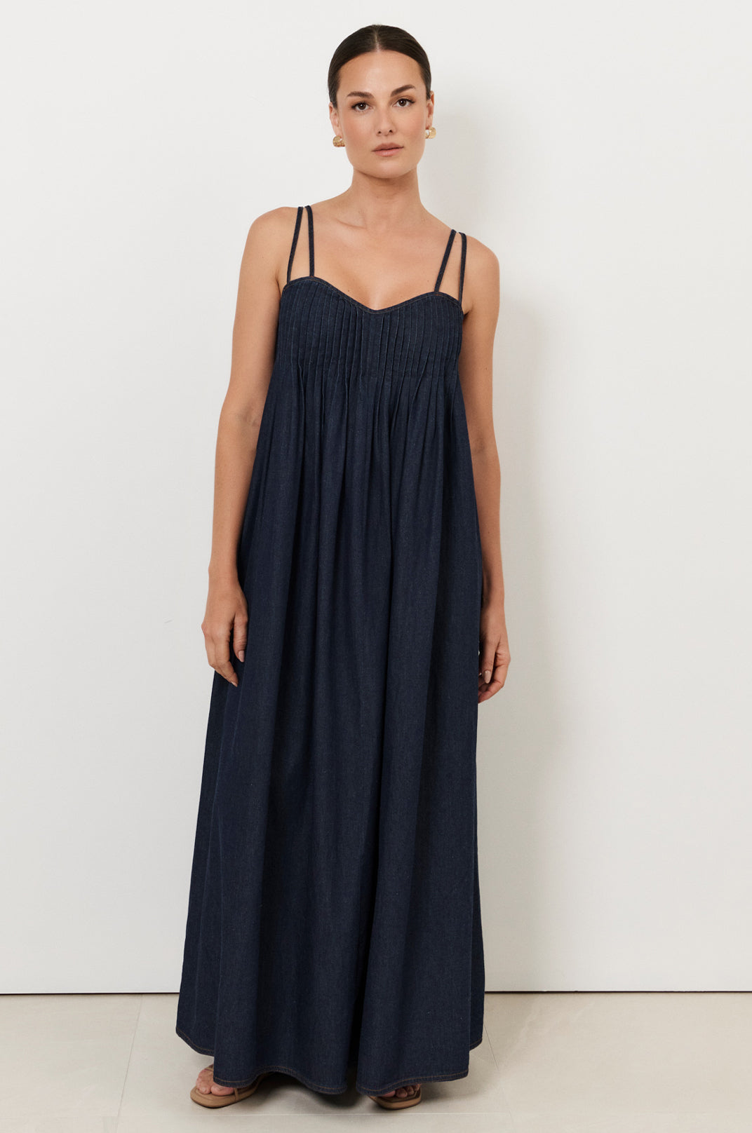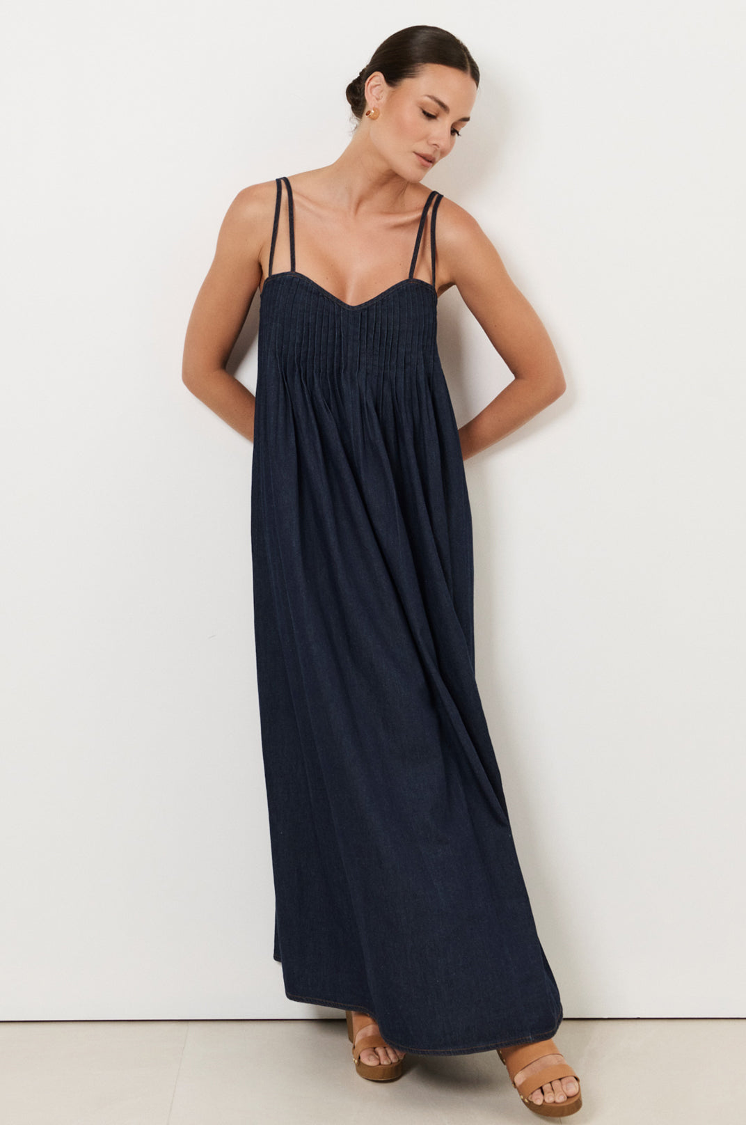The Indra Lightweight Denim Dress is a relaxed, feminine silhouette. It features a sweetheart neckline, adjustable straps, and delicate pintuck detailing, finished with contrast stitching and a button-and-loop back closure.