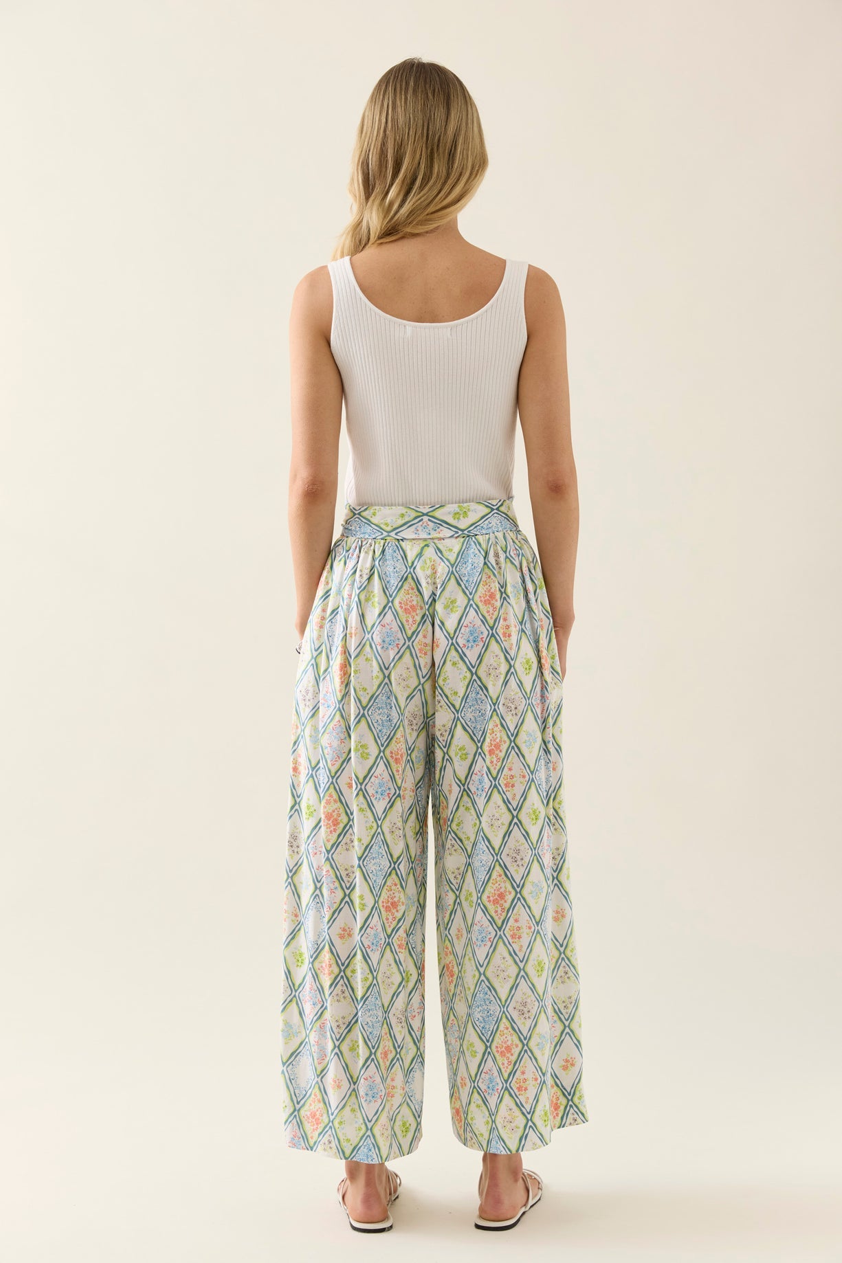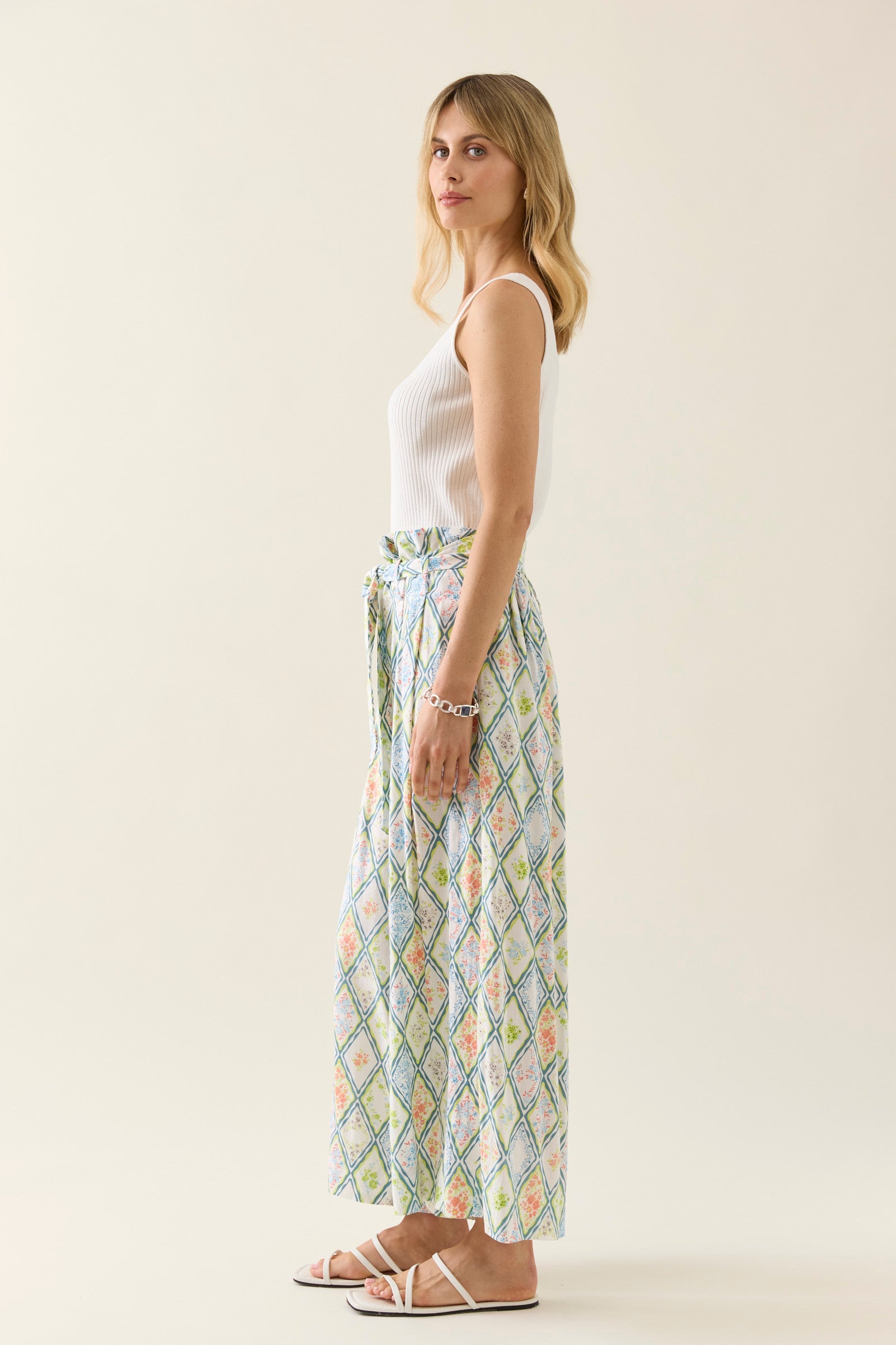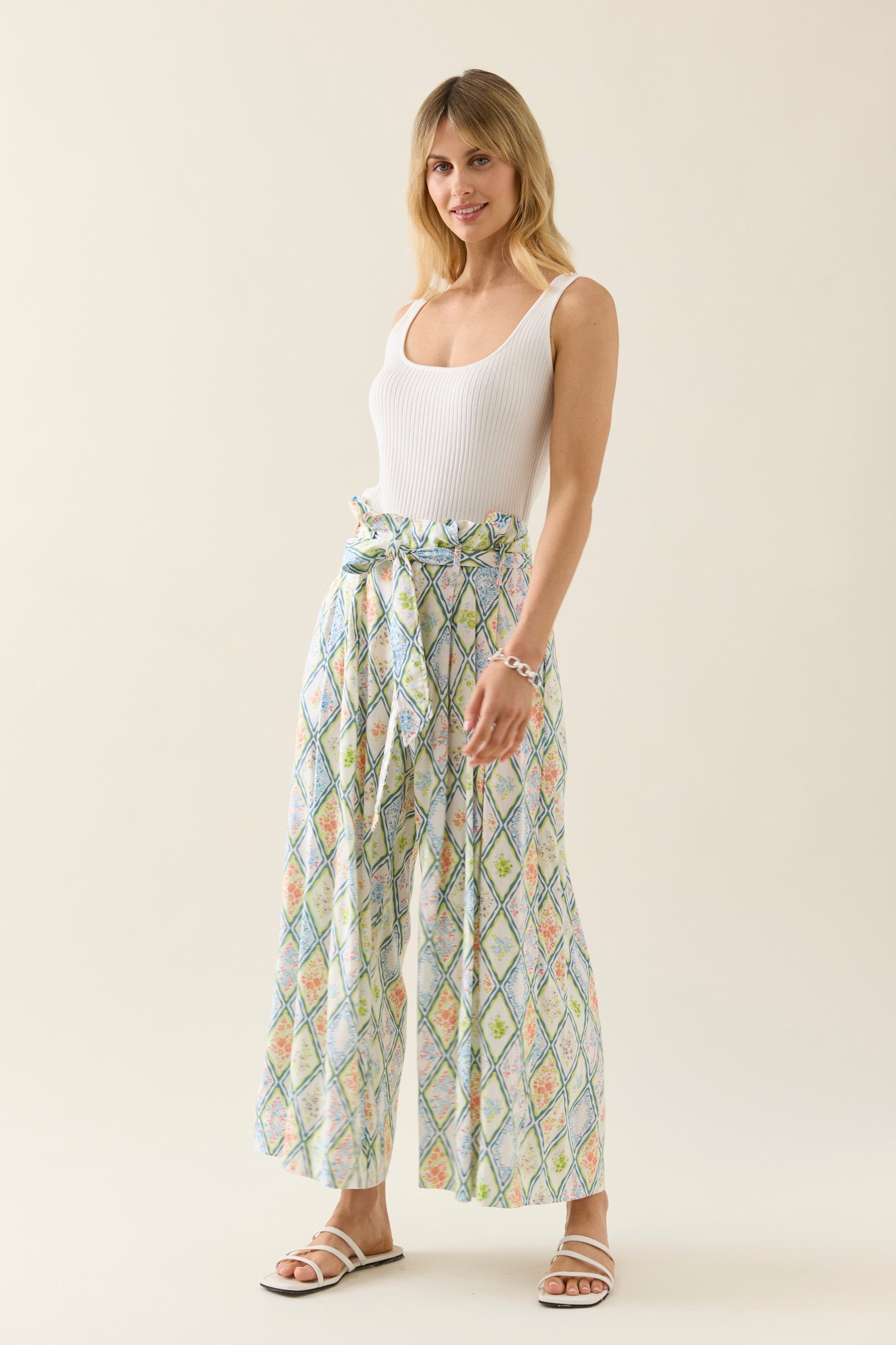 A softly structured cropped pant in a breathable linen blend. Designed with a high paperbag waist, wide leg, and self-fabric belt. Four front pleats create shape, while the elasticated back waistband ensures a comfortable fit. Available in an exclusive Tile colourway.