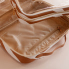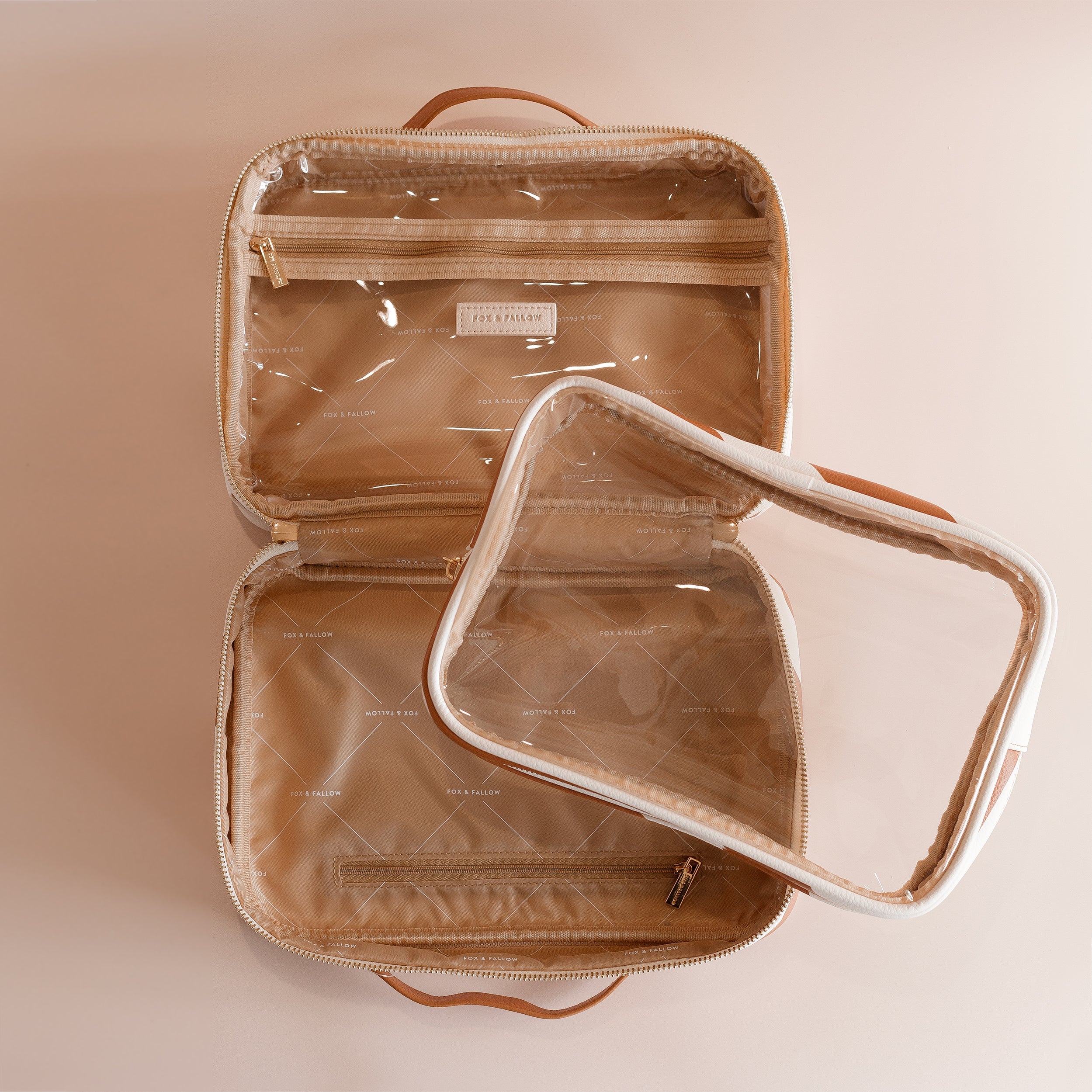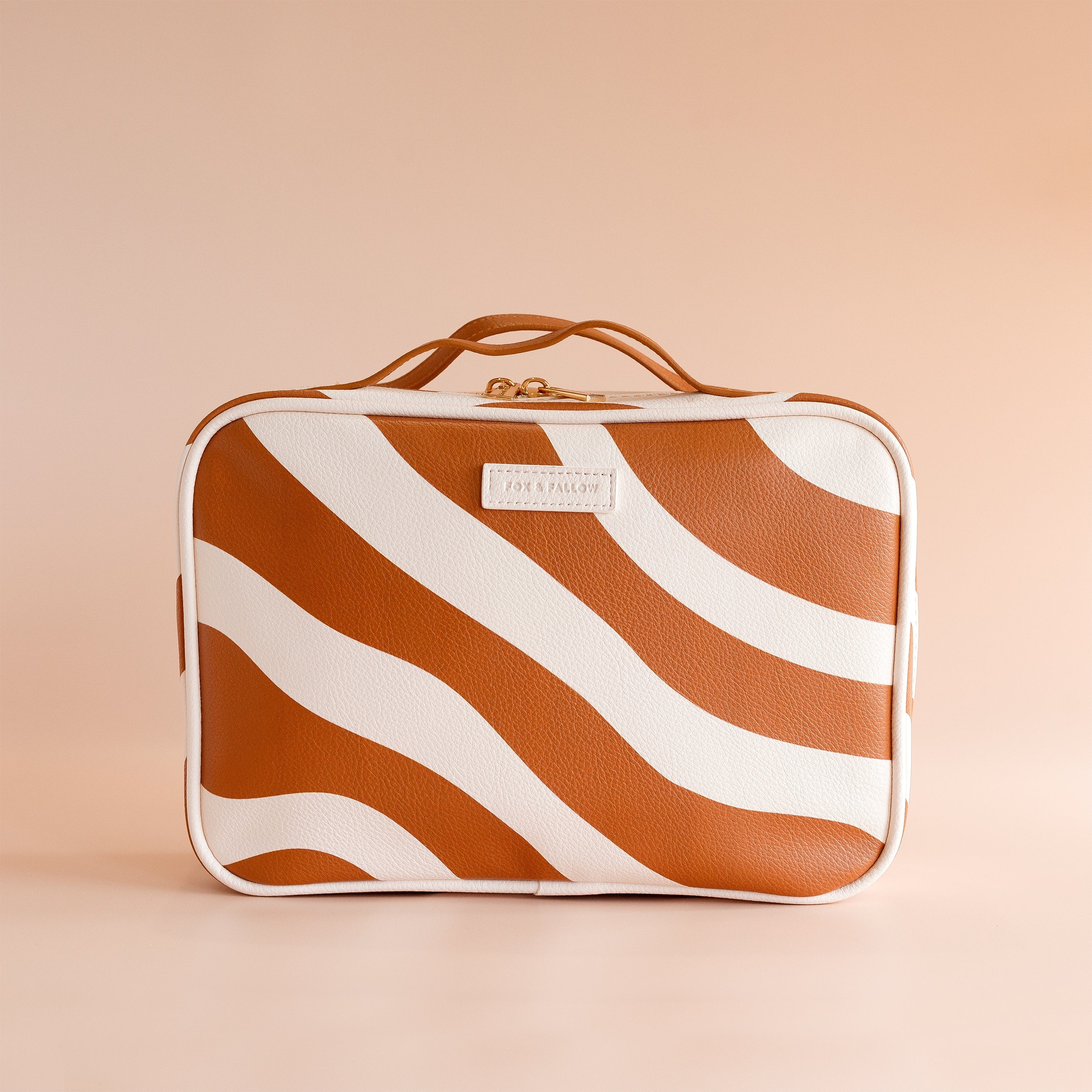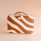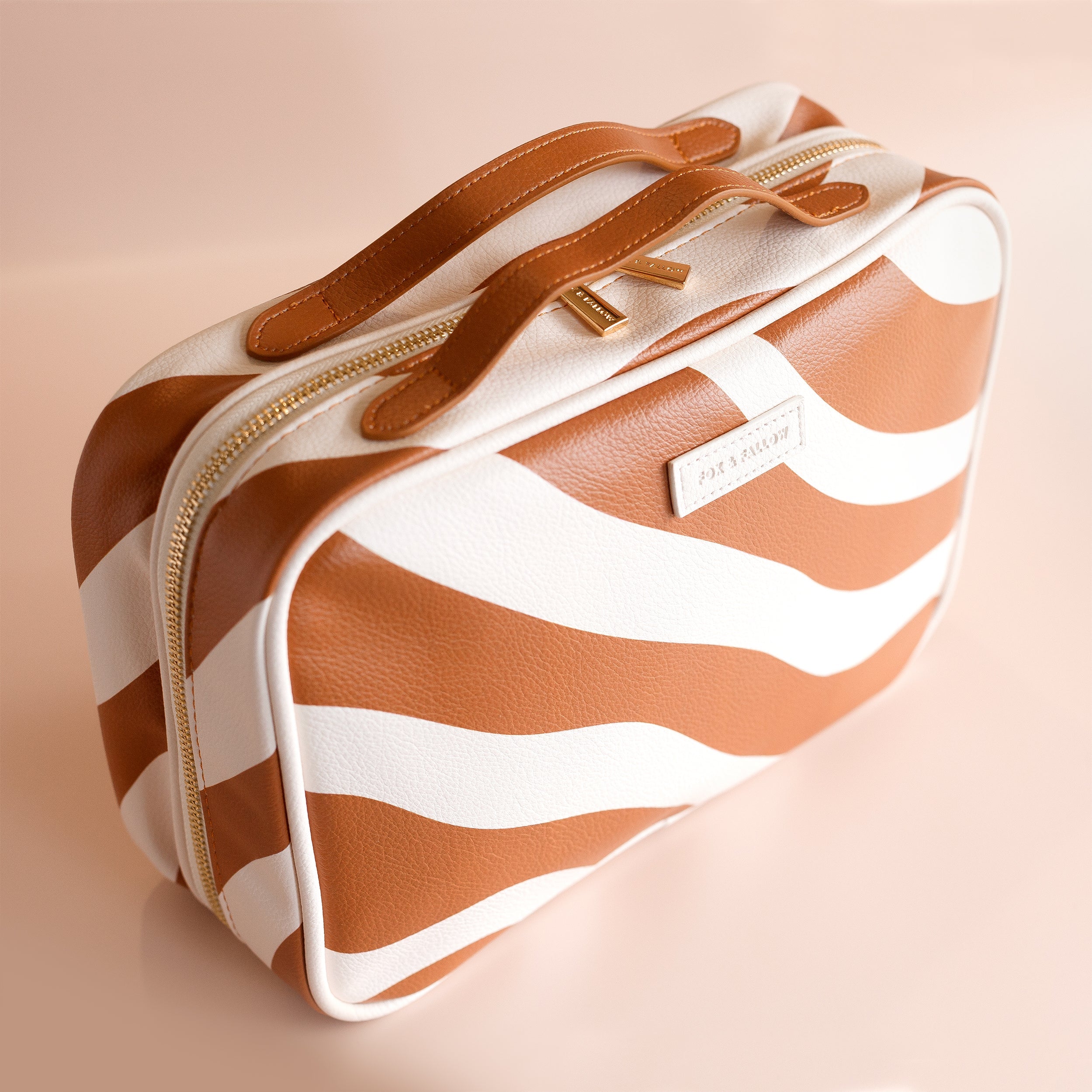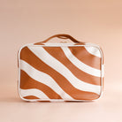 Introducing the coolest cosmetic bags you've ever seen! Crafted from super soft, yet durable luxury pebble vegan leather it's easy to keep clean - simply wipe down with a damp cloth. The monogrammed tan lining is designed to hide make up or spills but also makes it easy to find all your things. Large: 27 x 19 x 9cm. Pebble vegan leather with a tan lining. Internal zip pocket. Bonus removable clear bag. Gold hardware. Two handles and two zippers for easy access. Packaged with a diecut gold foiled swing tag. Designed in Australia, made ethically in China.