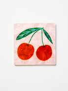 Sweet and shiny. This hand painted cherries tile is a love letter to fun, colour, and a little bit of mischief. Painted on luminous capiz shell with rich red and deep green tones We love this combined with one of the text phrases in this series.