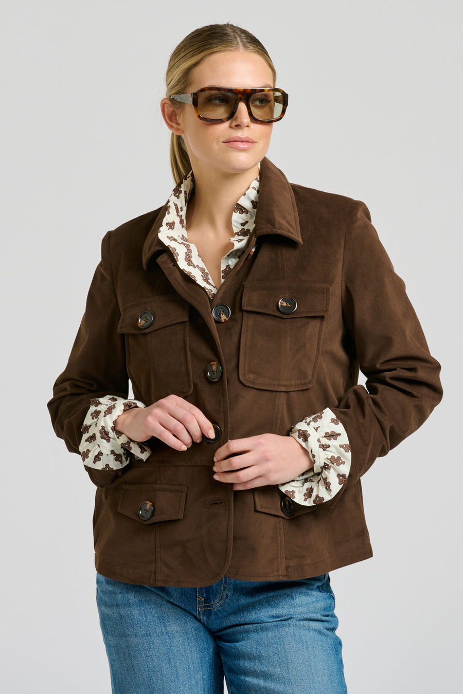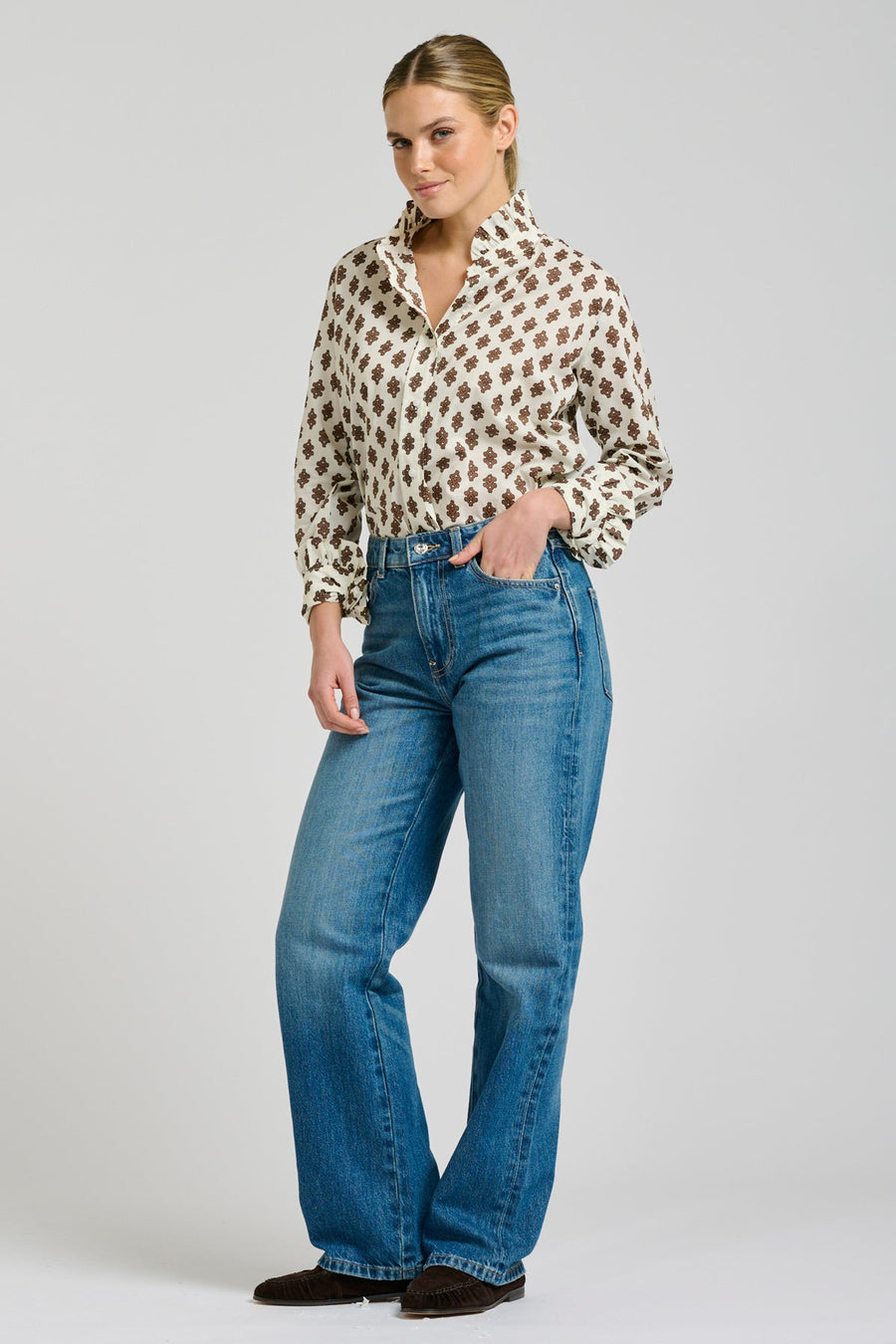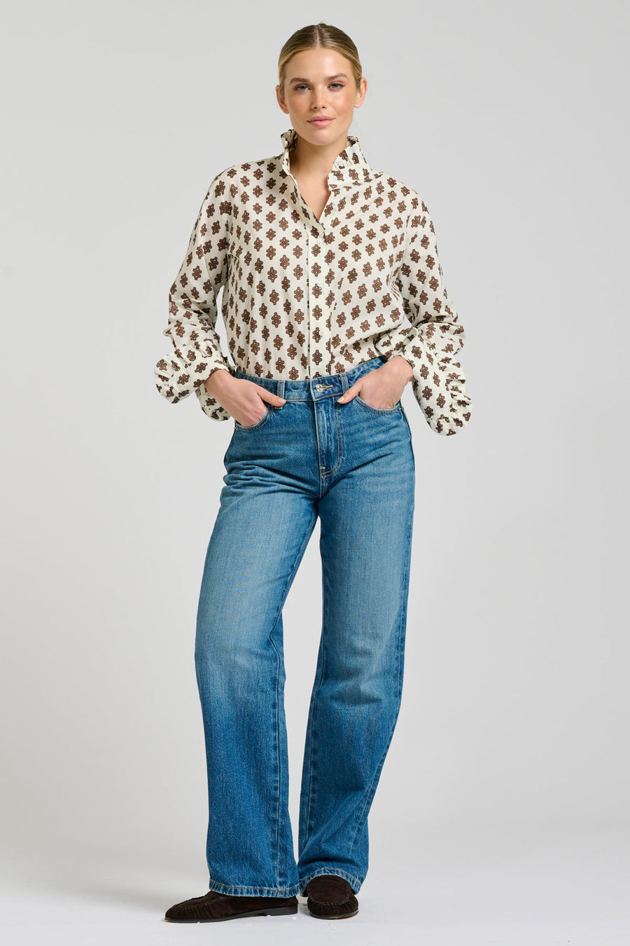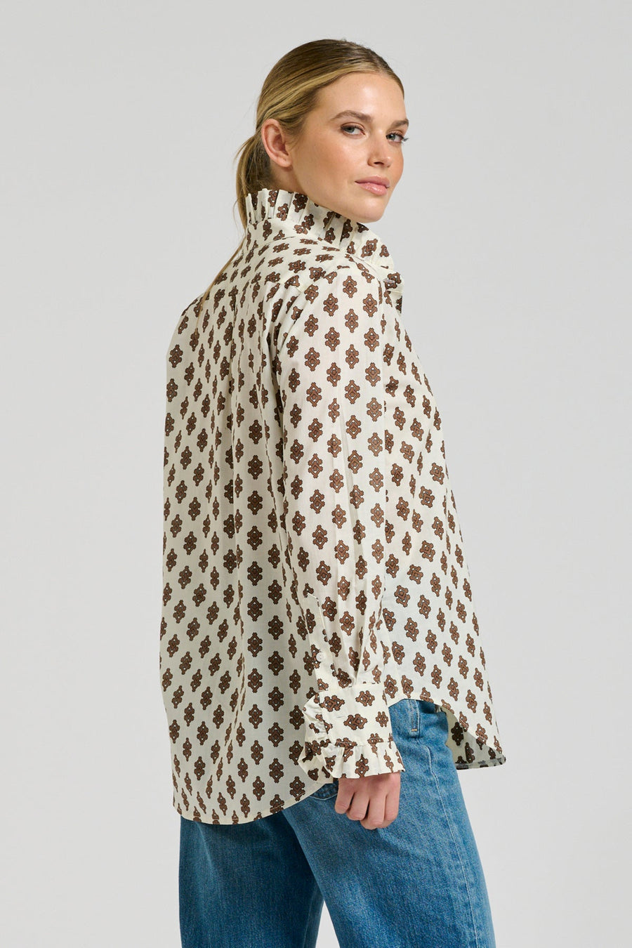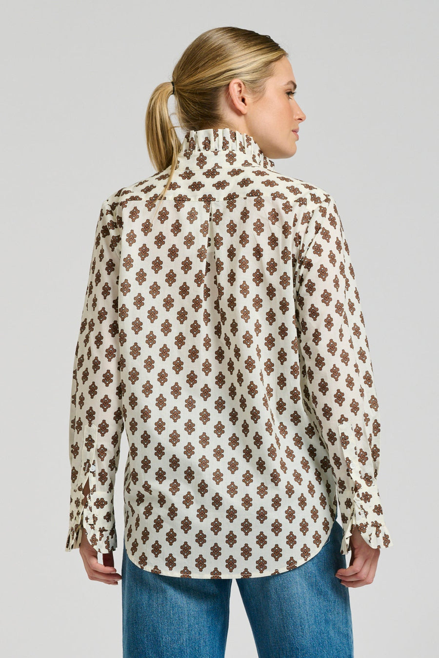 Olivia is a feminine silhouette. Featuring a stunning stand ruffle collar that instantly elevates. Olivia isa classic style cut in a stunning cotton poplin featuring a double diamond geometric print.