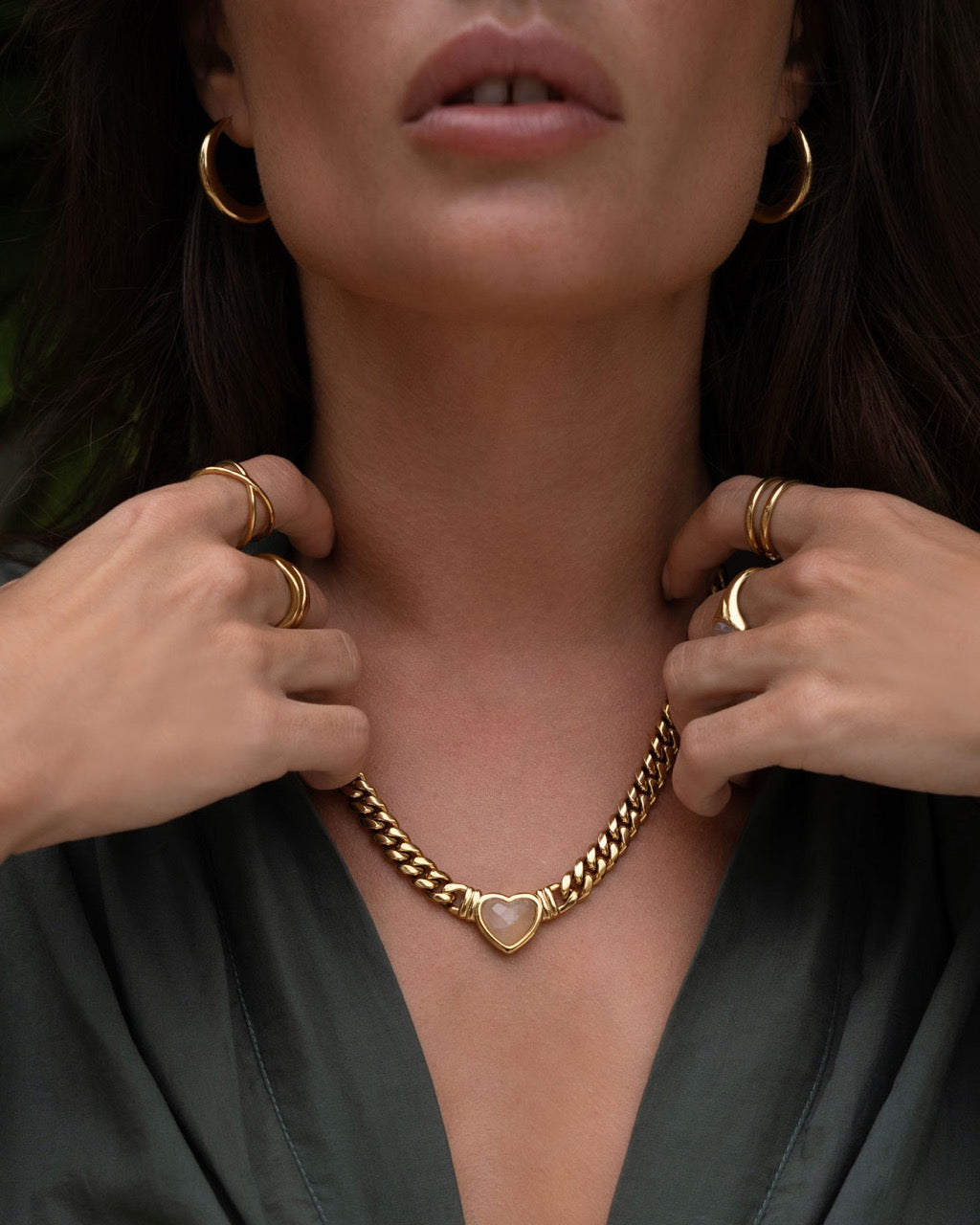 Love is always in the air when you're wearing the Valentine Necklace, a beautiful statement chain featuring a bespoke rose quartz heart pendant, it's truly one of a kind! This chunky chain screams luxury, and is the perfect gift for a special someone, whether it be for Valentine's Day, a special occasion, or just because you love them!
