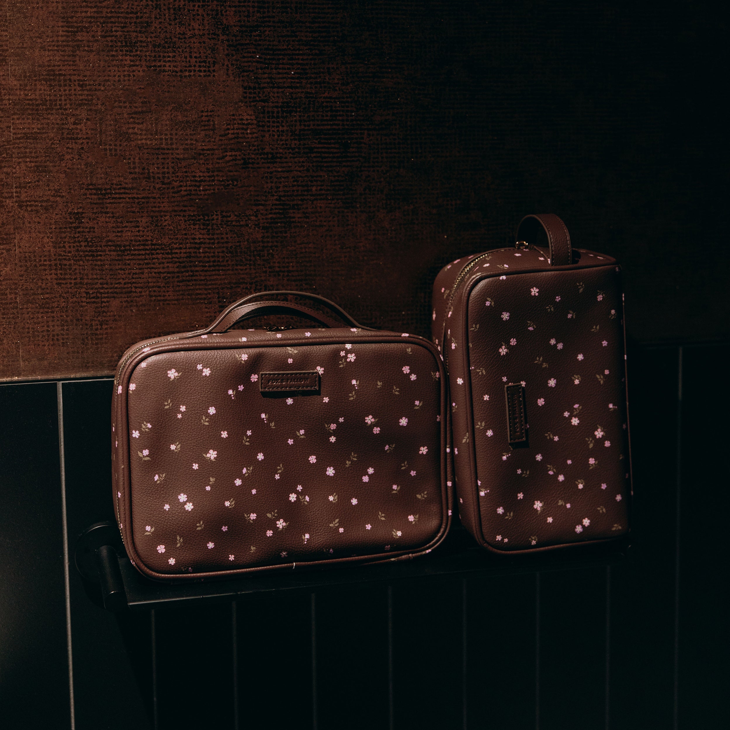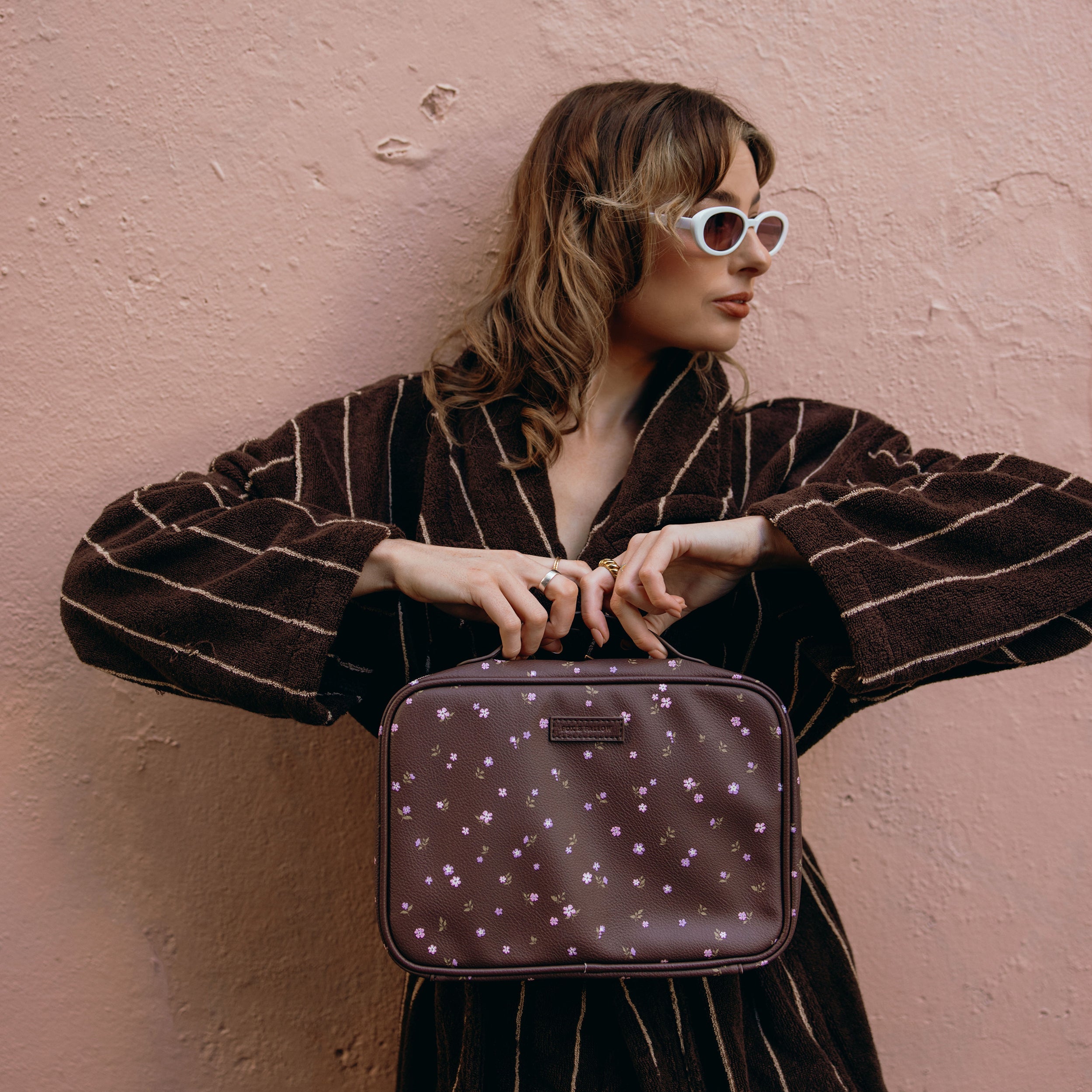 Introducing the coolest cosmetic bags you've ever seen! Crafted from super soft, yet durable luxury pebble vegan leather it's easy to keep clean - simply wipe down with a damp cloth. The monogrammed tan lining is designed to hide make up or spills but also makes it easy to find all your things. Large: 27 x 19 x 9cm. Pebble vegan leather with a tan lining. Internal zip pocket. Bonus removable clear bag. Gold hardware. Two handles and two zippers for easy access. Packaged with a diecut gold foiled swing tag. Designed in Australia, made ethically in China.