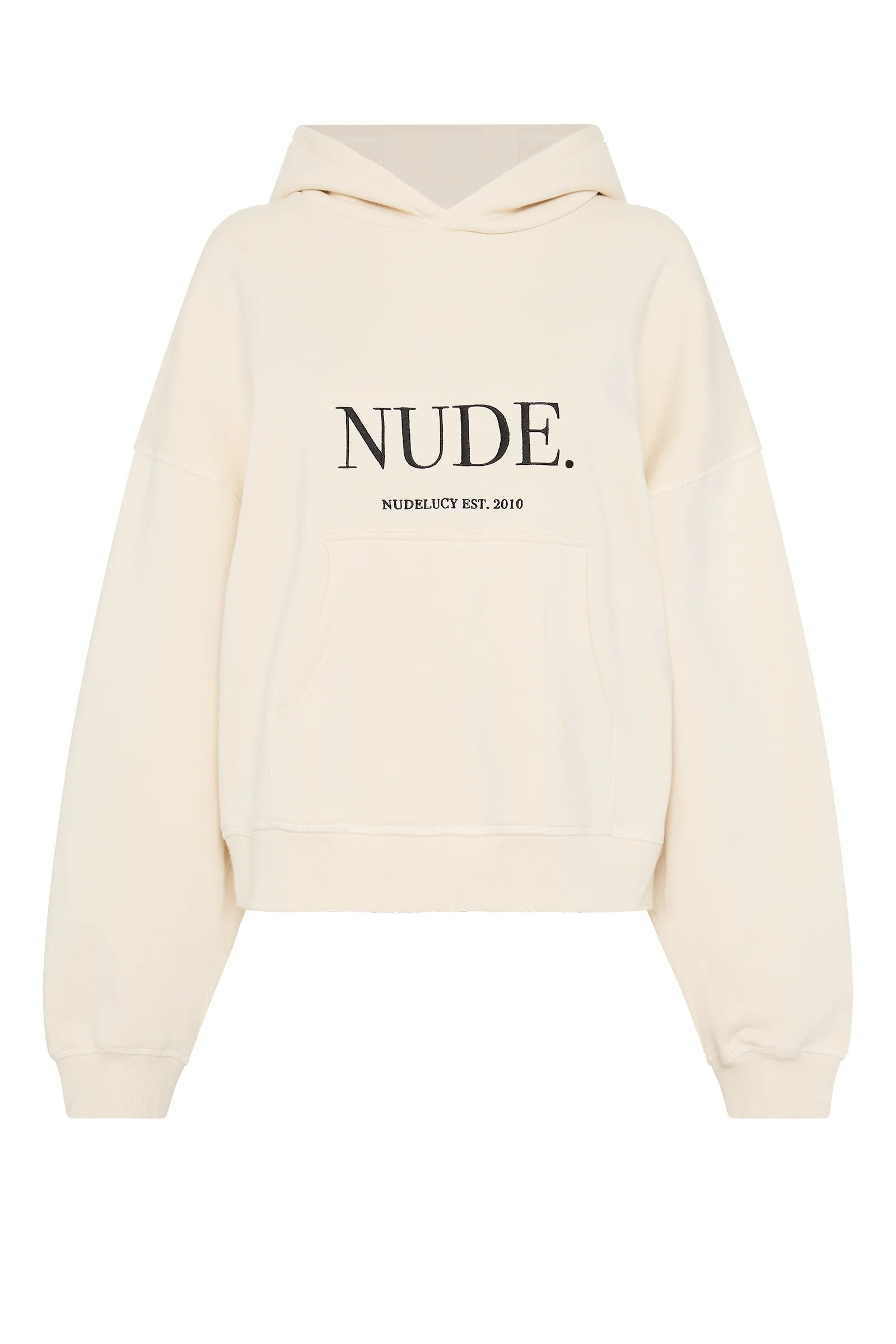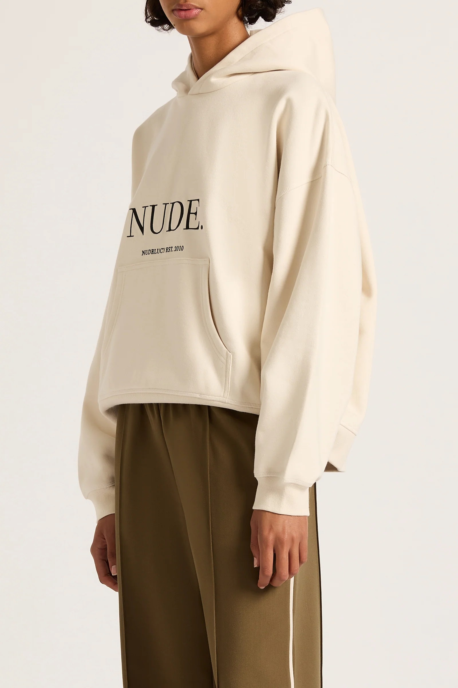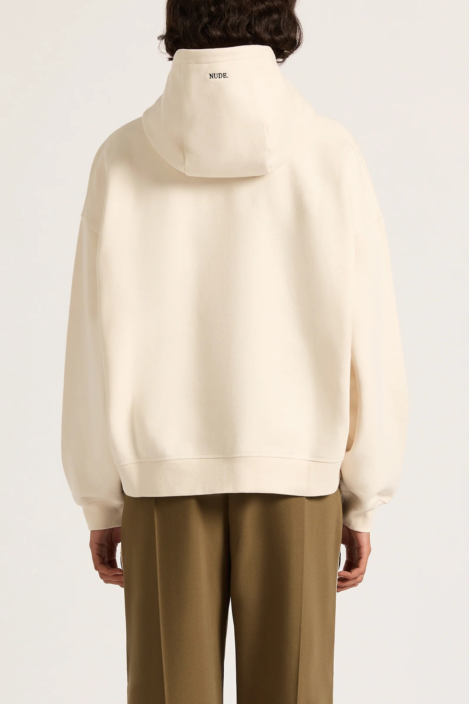 The Nude. Hoodie is made in our signature fleece fabrication which has a smooth, soft hand feel. The silhouette is oversized with drop shoulders and long sleeves. Features include embroidered Nude on front and hoodie, a fully lined hood and ribbed cuffs and hem. - Signature fleece fabrication
