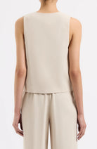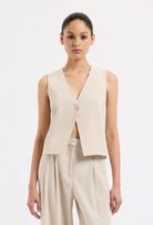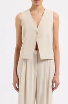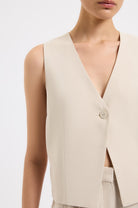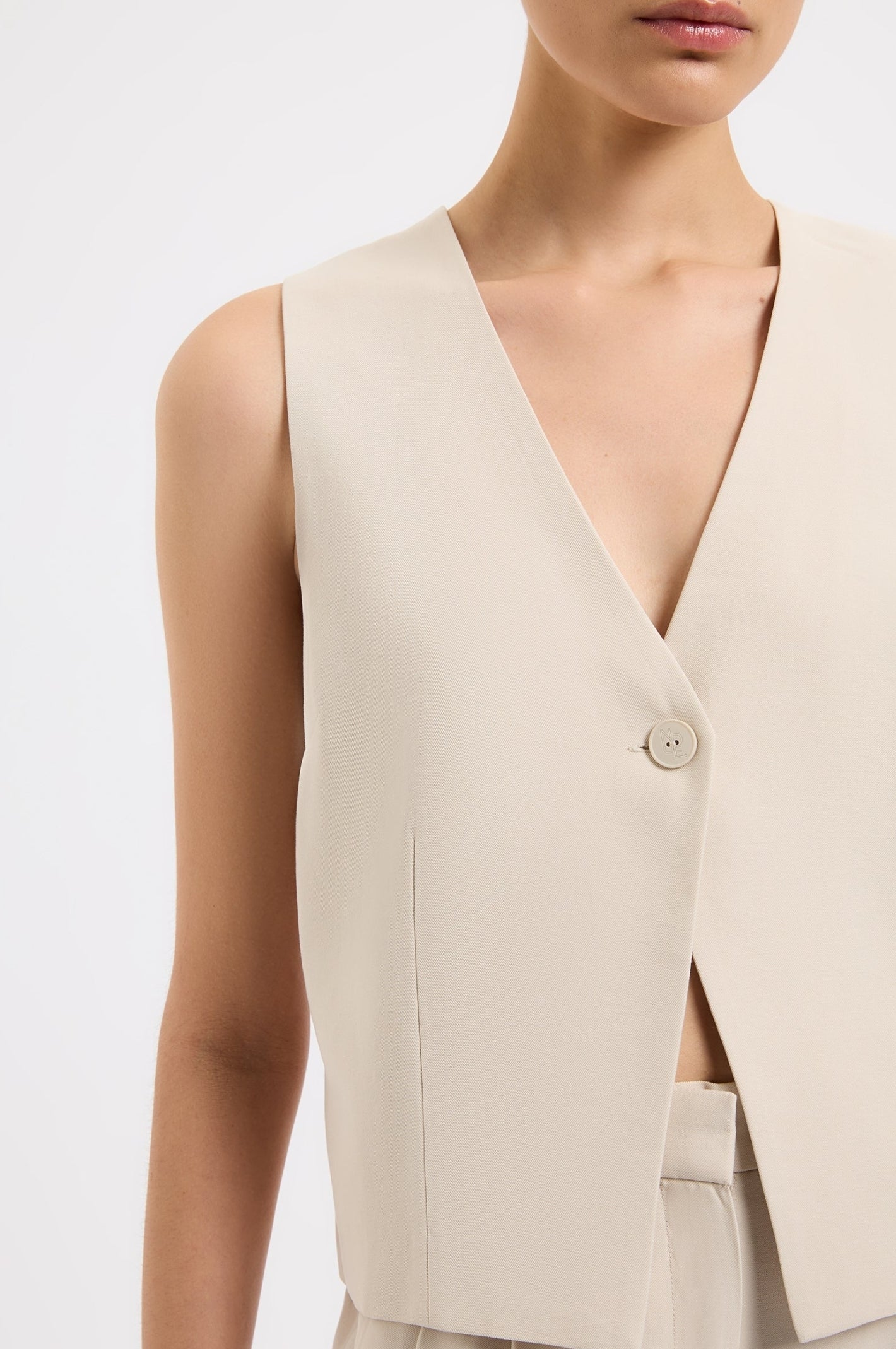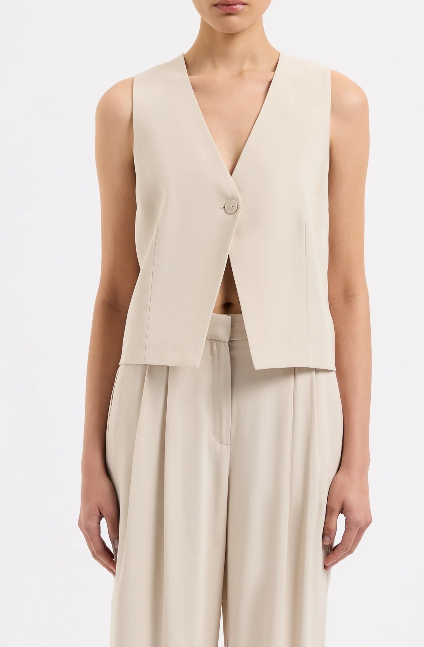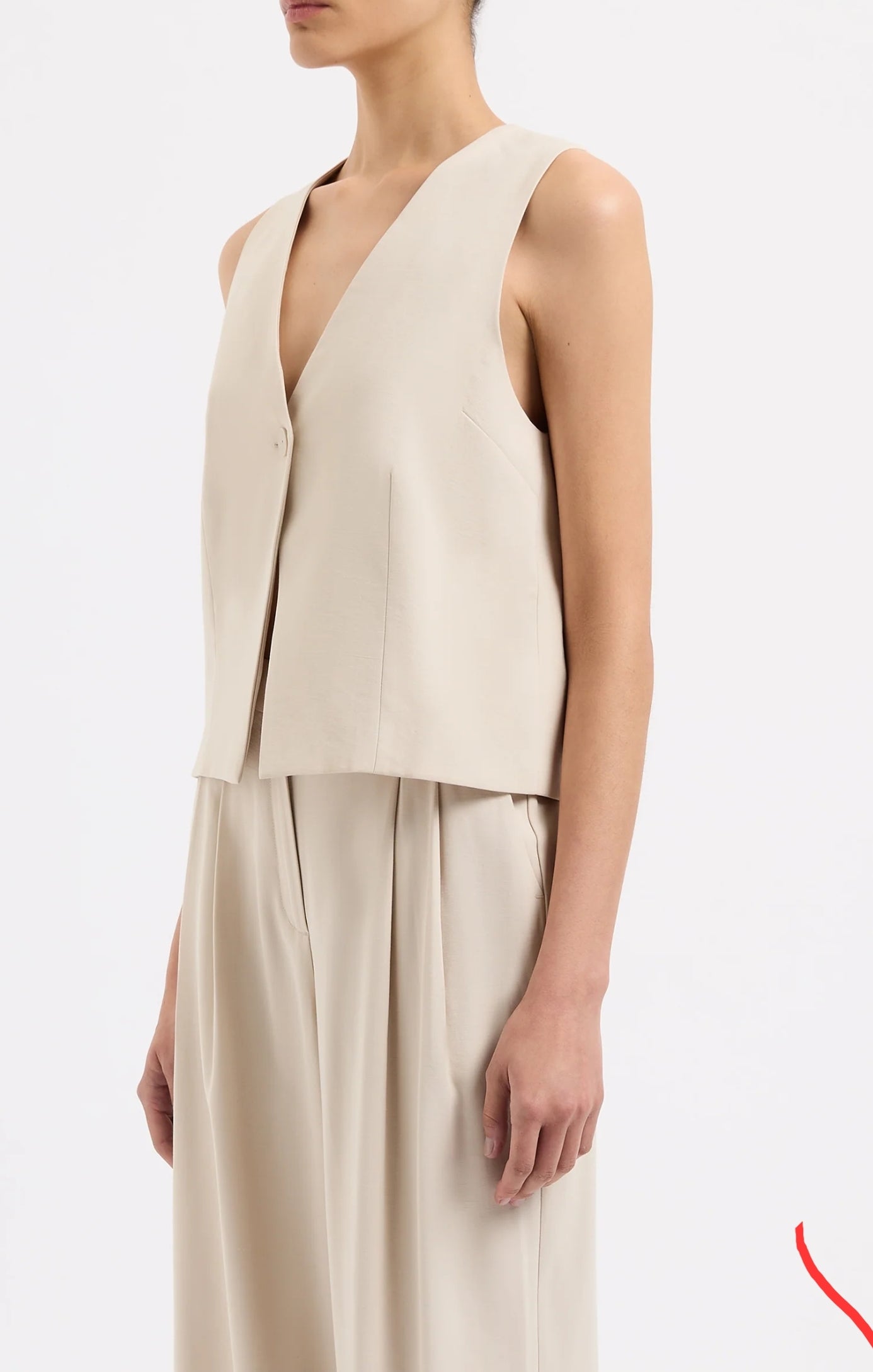 The Petra Vest is made in a lightweight rayon fabrication that has a twill texture and soft hand feel. The silhouette is tailored and slim fitting with a button front opening. Featured include a v neckline and branded buttons. The vest is fully lined.