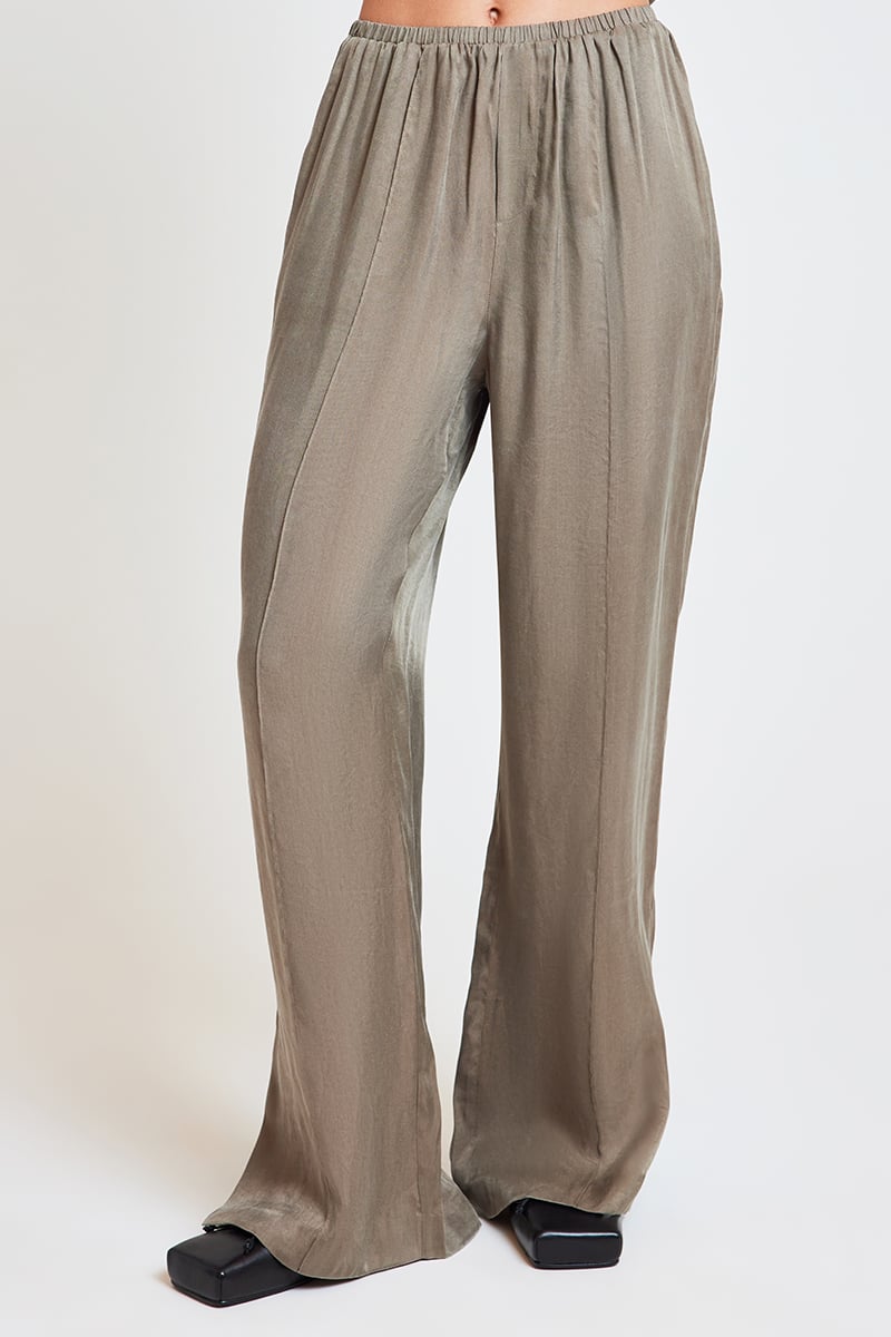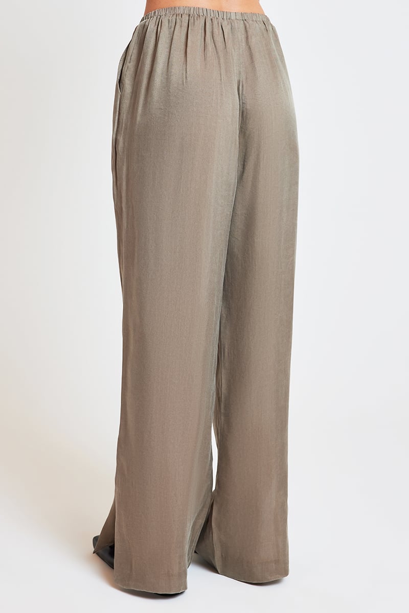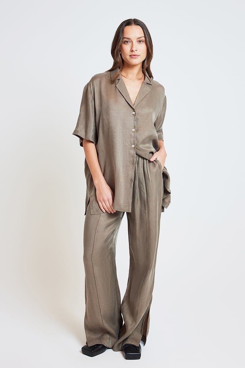 refined elegance in a sleek silhouette. The Seshni Tencel Pant from Nude Lucy is crafted from a Tencel blend fabrication offering a soft, sueded hand feel. Features include an elasticated waistband, relaxed wide leg and splits at hem. Style with the matching Seshni Tencel Shirt.