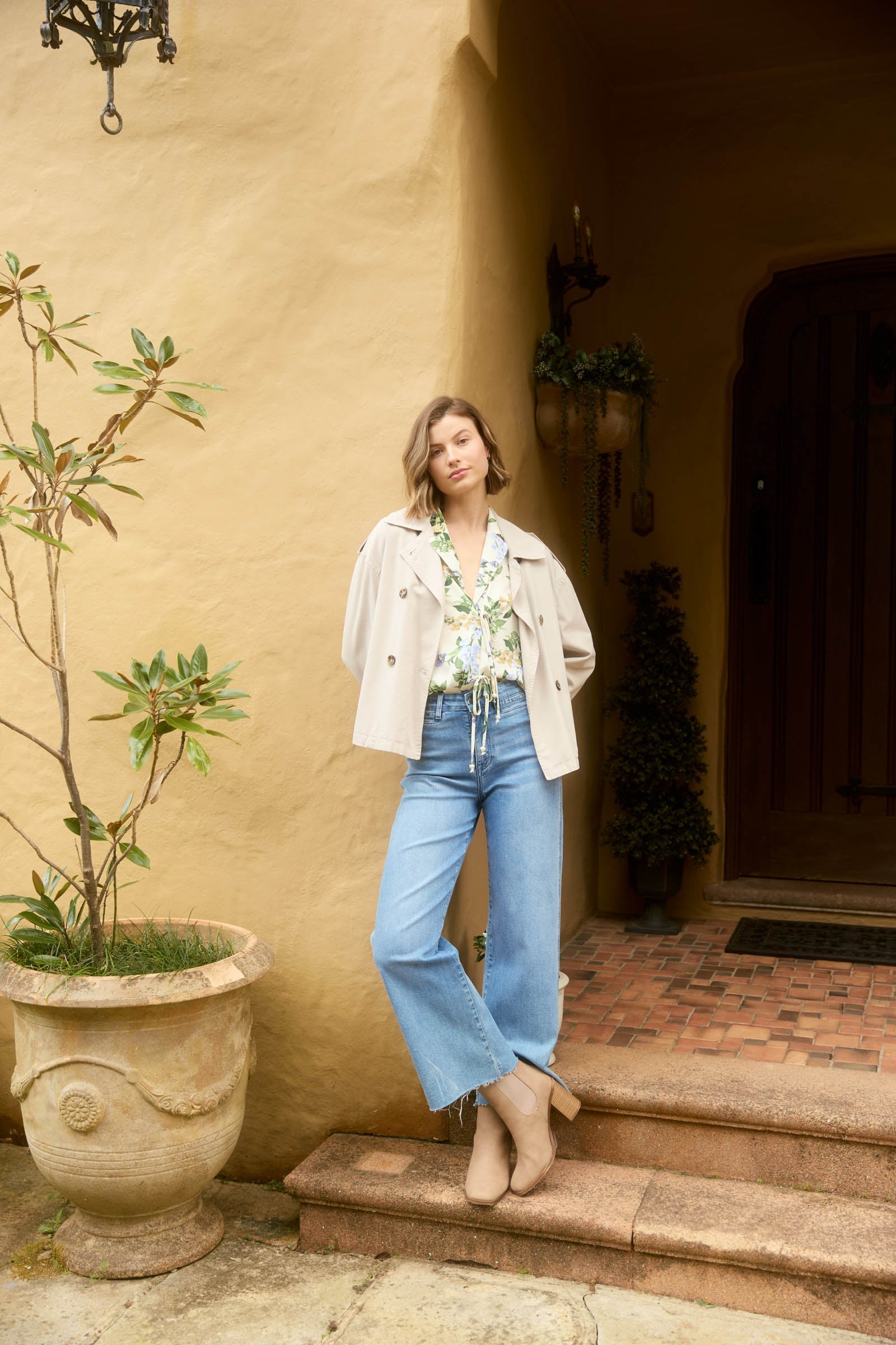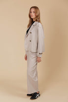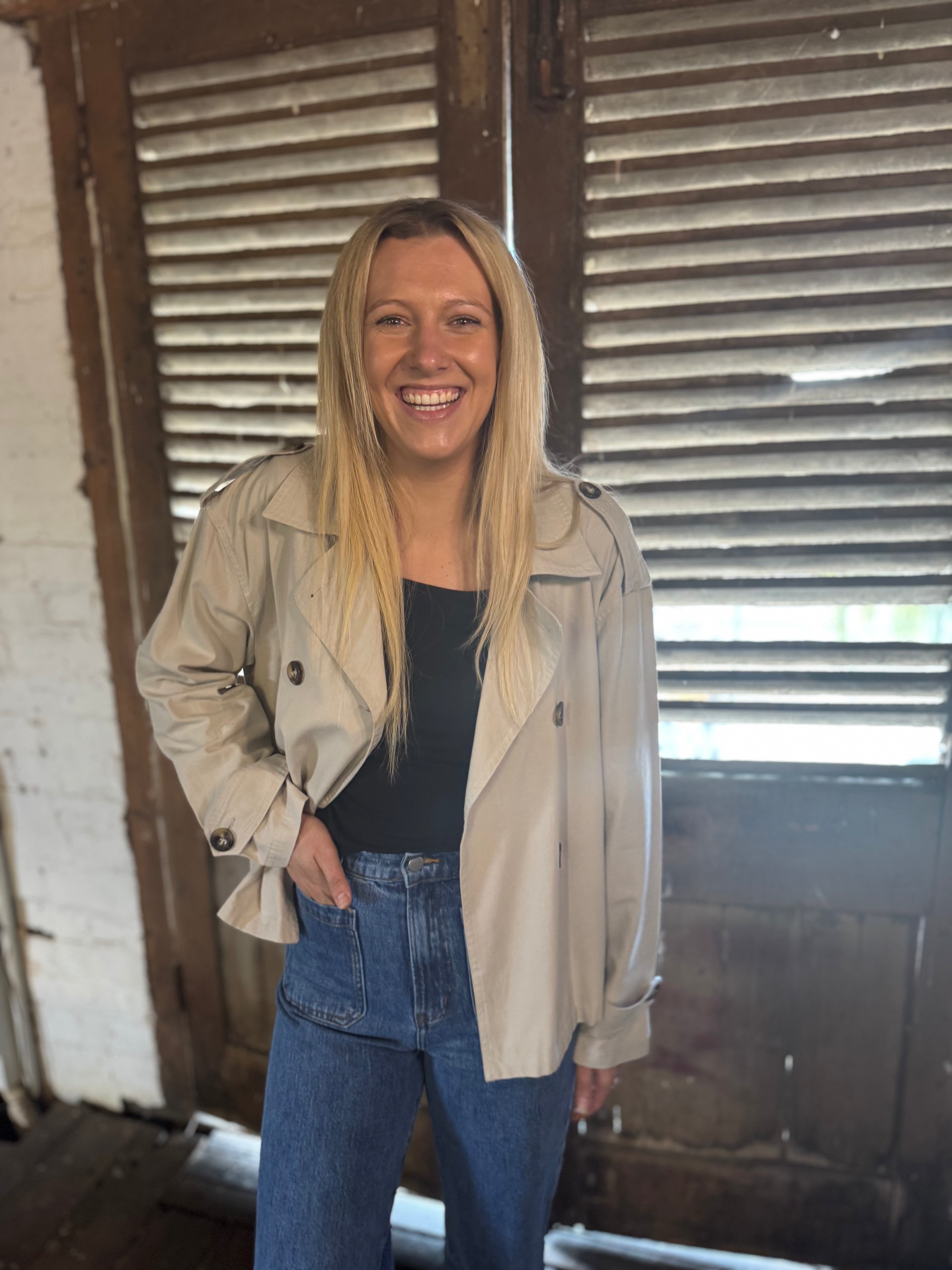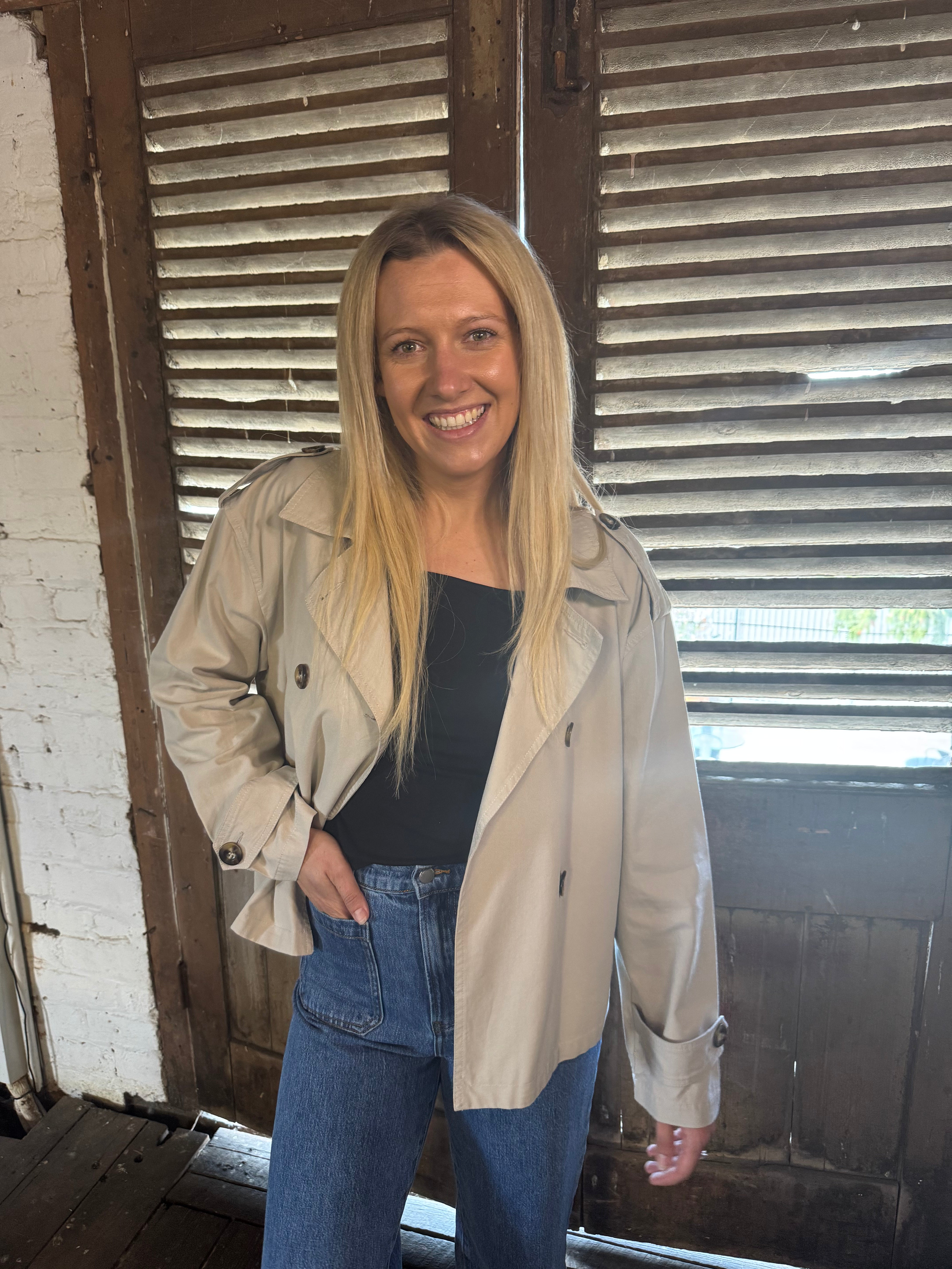 The Freya Crop Trench is the jacket your wardrobe has been waiting for. With its cool, boxy cropped design and quality cotton fabric, this trench adds a fresh twist to your outerwear collection. Featuring a double-breasted style, it's the perfect piece to throw on over any outfit for a quick, stylish look. Pair it with a knit top, jeans, boots, and a hat for a chic, city-ready vibe.
