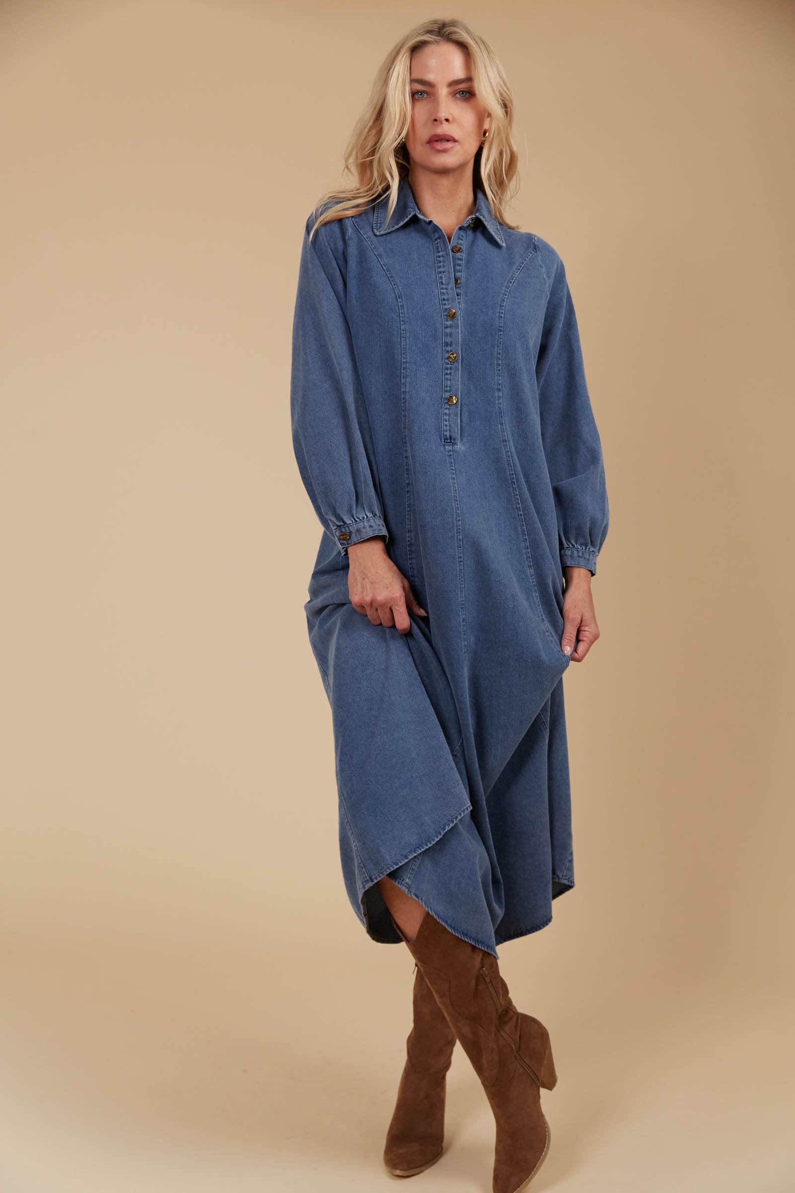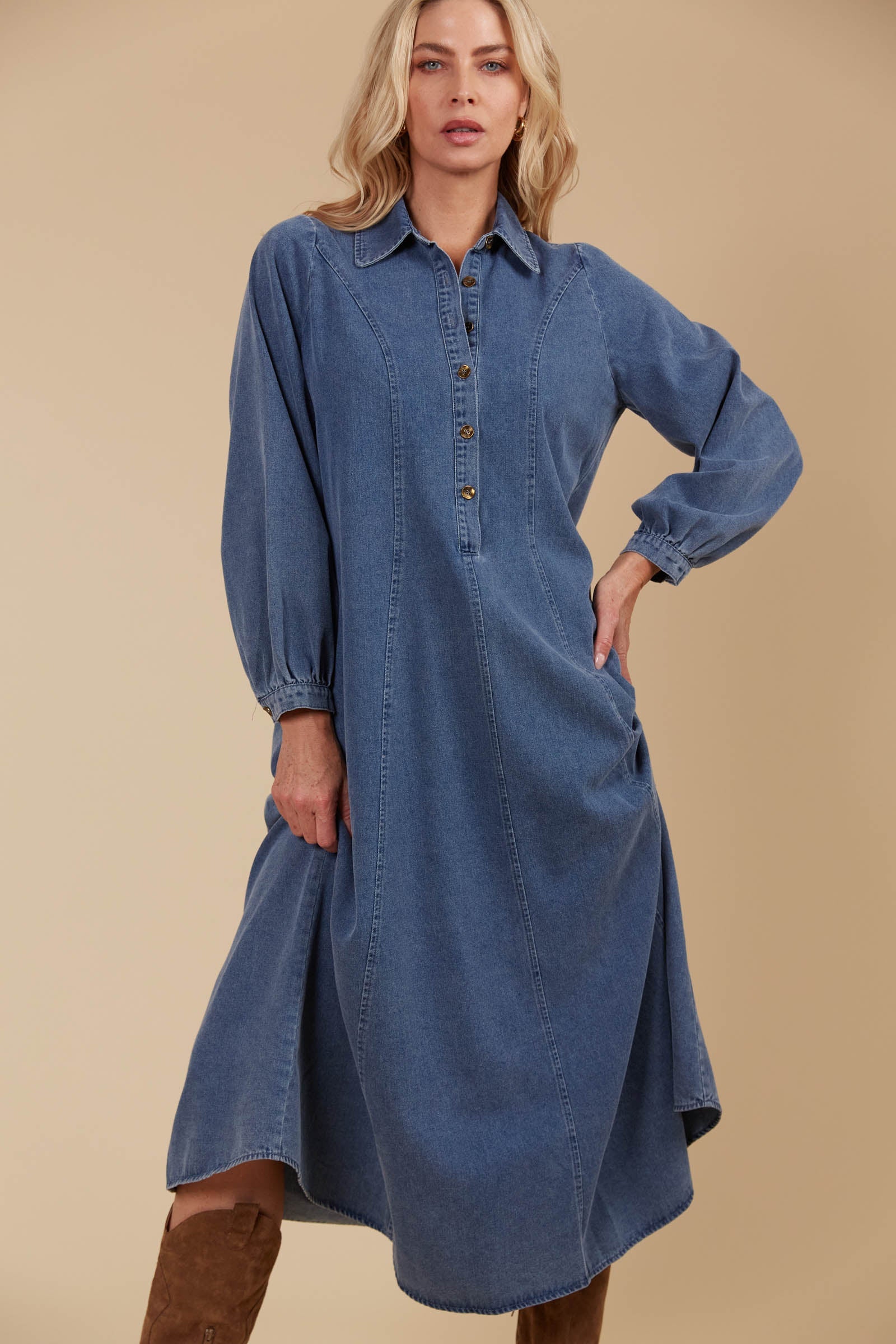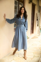 A true wardrobe essential, the Freya Dress offers a luxurious texture and a midi-length that can be styled in many ways. With a collar, a popover placket, and a removable self-fabric belt that shapes the figure, this dress exudes classic charm. Style it with gold accents and suede boots for a sophisticated finish, or opt for a kitten heel to add a touch of elegance to the look.