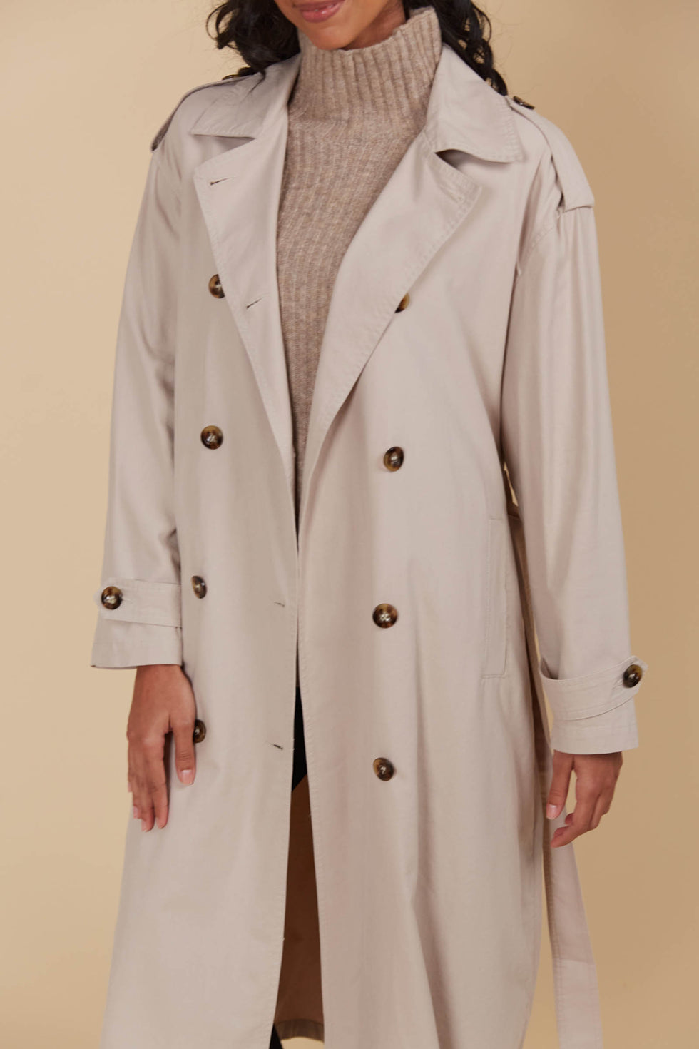 A classic trench coat is a forever piece in any wardrobe, and the Freya Trench Coat is no exception. Crafted from premium cotton, it combines chic style with lightweight durability, making it essential for the cooler months. The generously boxy fit is ideal for layering, while its functional details provide warmth and practicality. Whether worn over a sophisticated dress or a relaxed outfit, this coat ensures a poised and well-curated appearance.