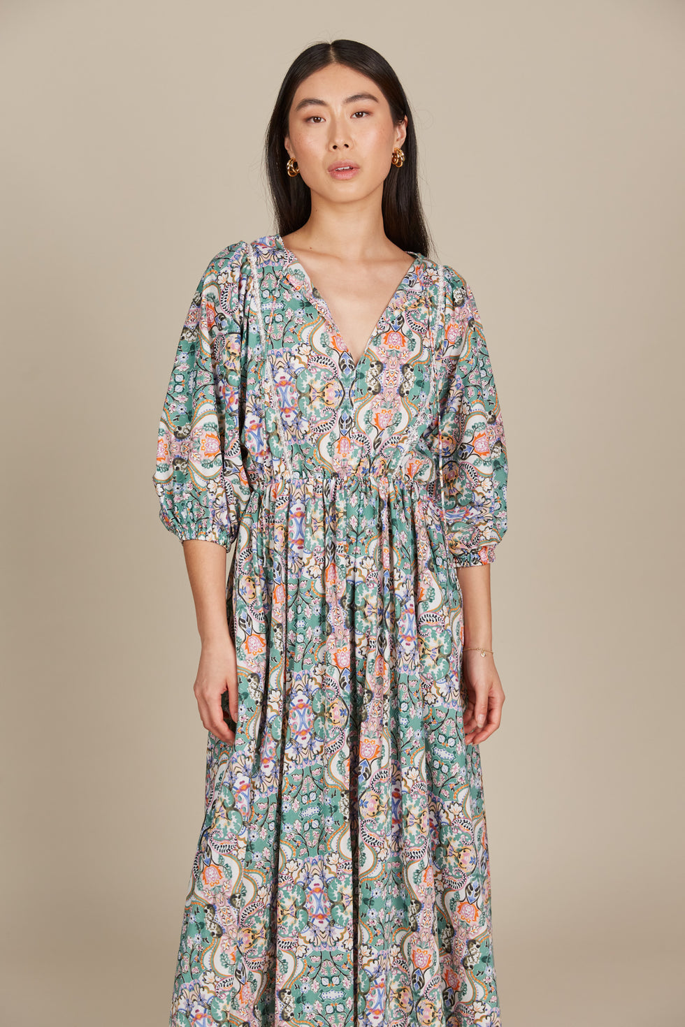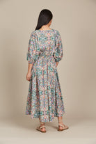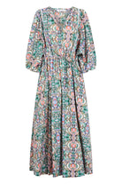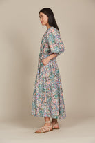 From the desk to the dinner table, the Remi Maxi offers versatility and elegance in 100% cotton. The modern and feminine profile features a V-neck with a self-tie, elbow-length balloon sleeves, an elastic waist, and a flowing skirt. Lace details add a lovely contrast to the bodice. Pair it with ballet flats for a chic workday look, then switch to strappy heels and glam accessories for an evening out.