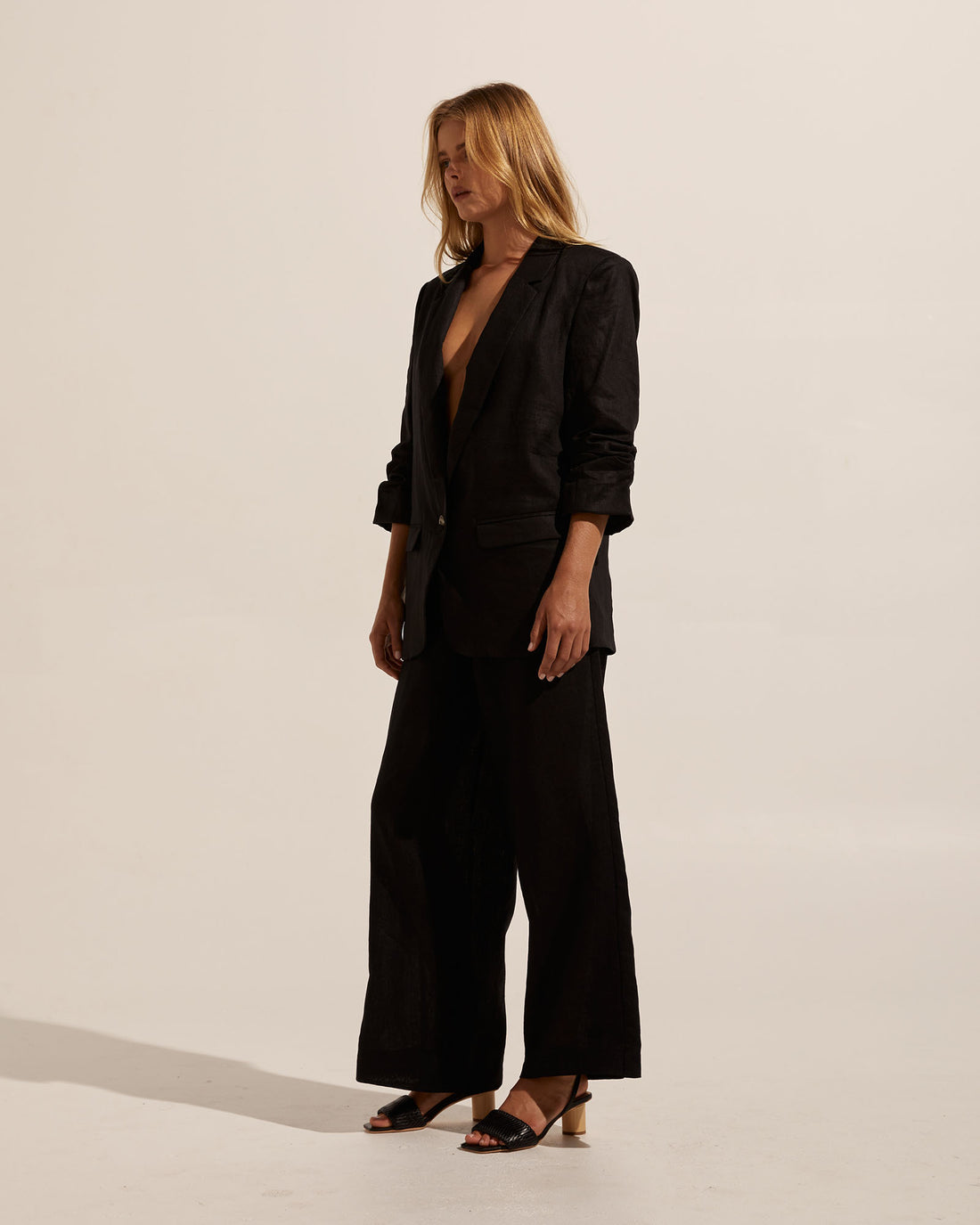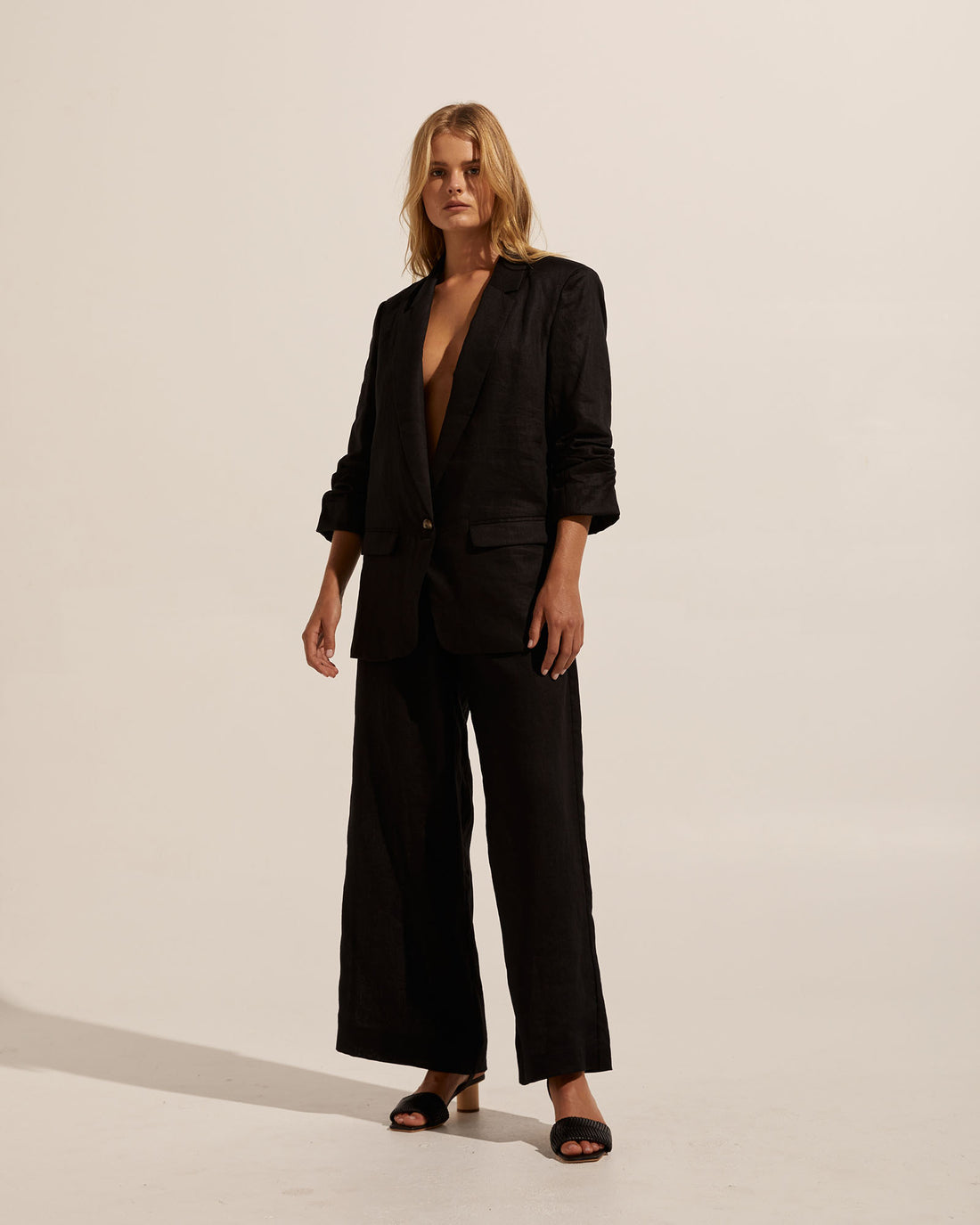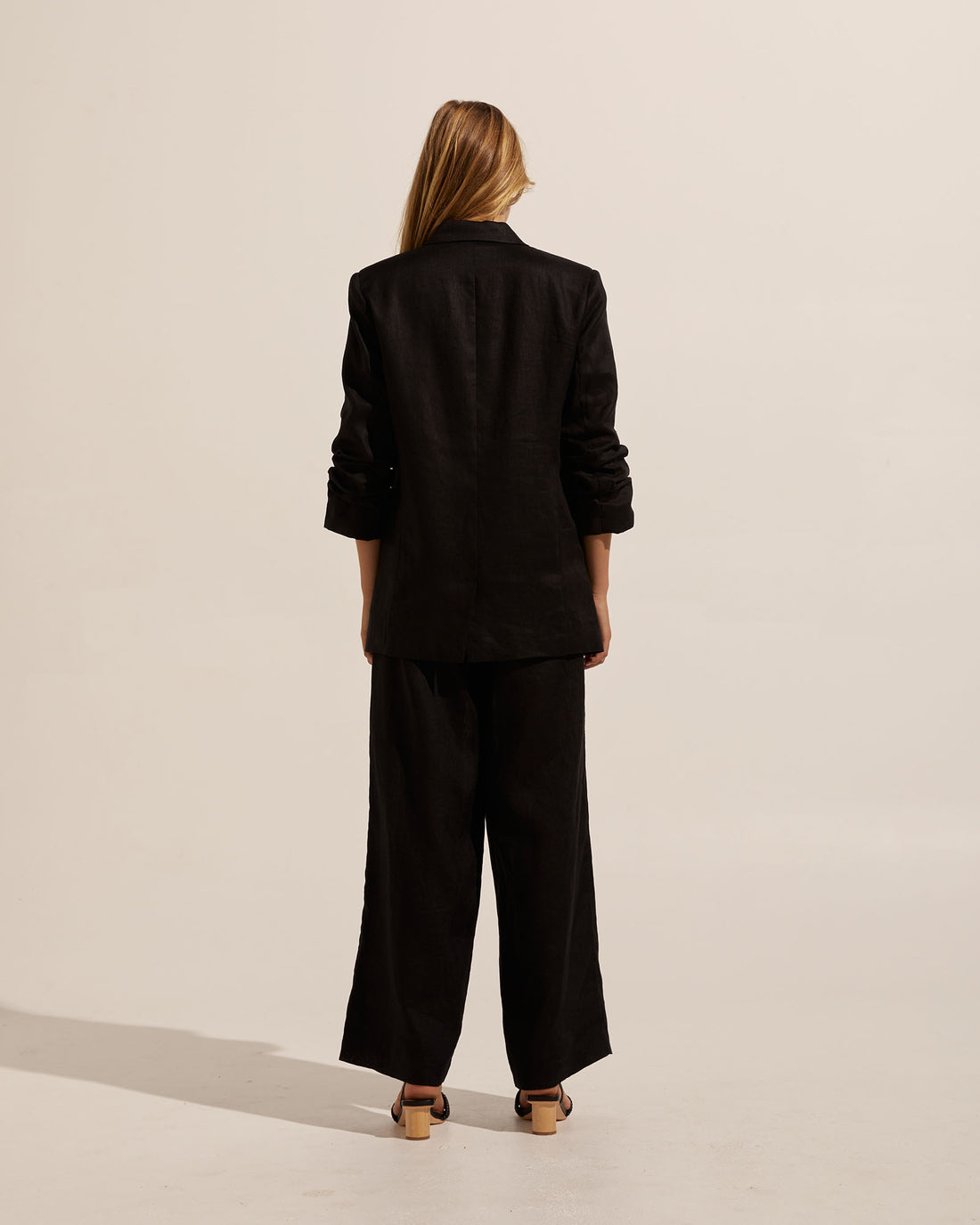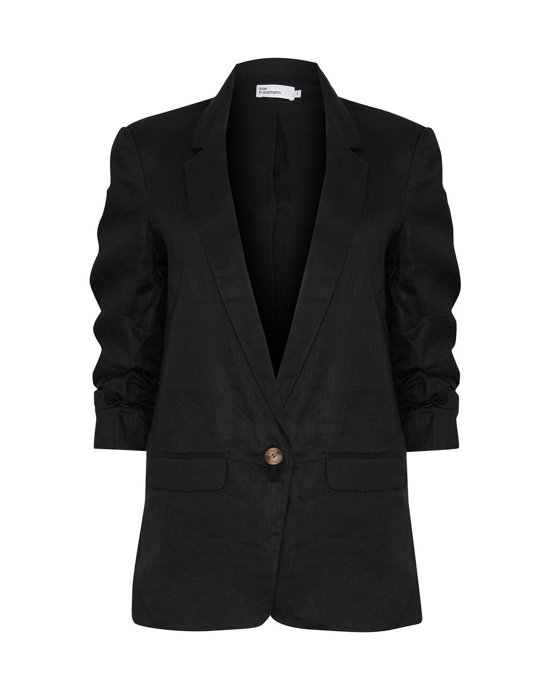lightly structured jacket is the perfect solution for effortless yet elevated spring dressing. this piece adds polish and edge to both dresses and pants. a ¾ ruched sleeve has a relaxed, slightly undone feel. the prevail is an update on our best -selling jacket the entitle with the added benefit of a center button to secure the front labels. a go-to style for spring or summer and the perfect travel companion. see product details below.