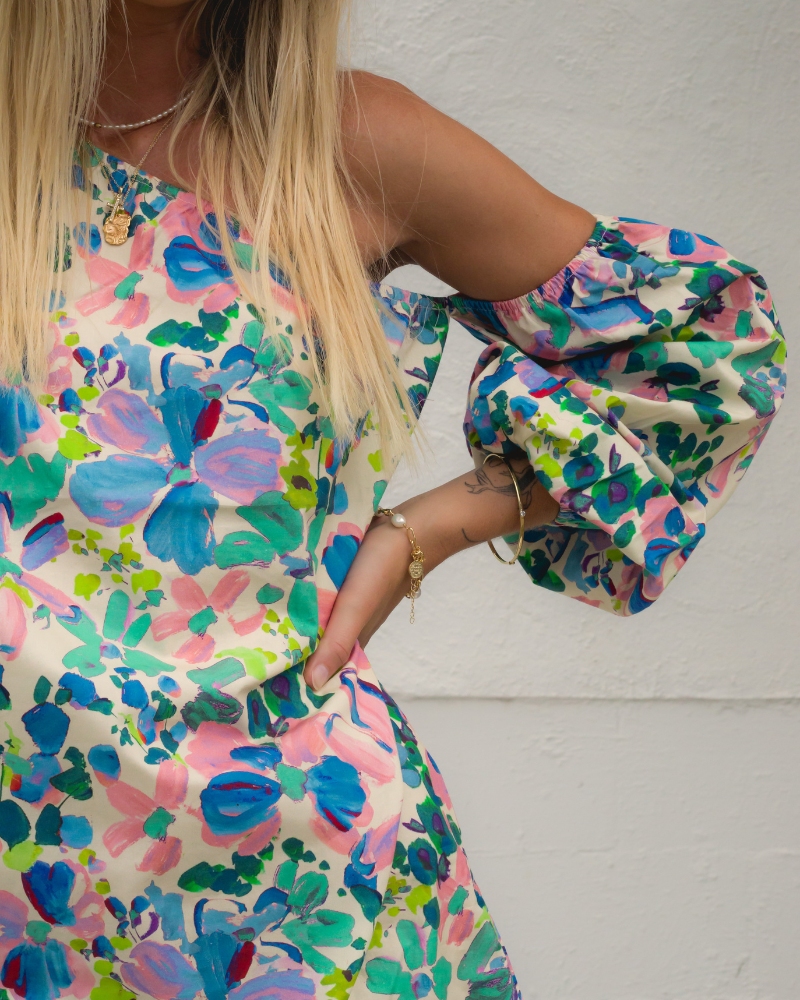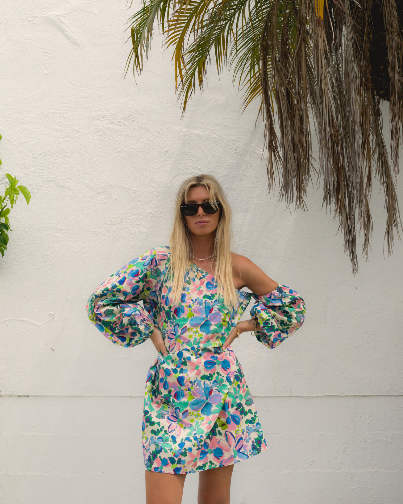 Embrace your fierce and fashionable side with the Rome Dress in Posey! This stylish mini dress boasts an asymmetrical neckline, along with an off-the-shoulder style and charming puff sleeves, delivering a bold and sassy look that's perfect for any occasion.