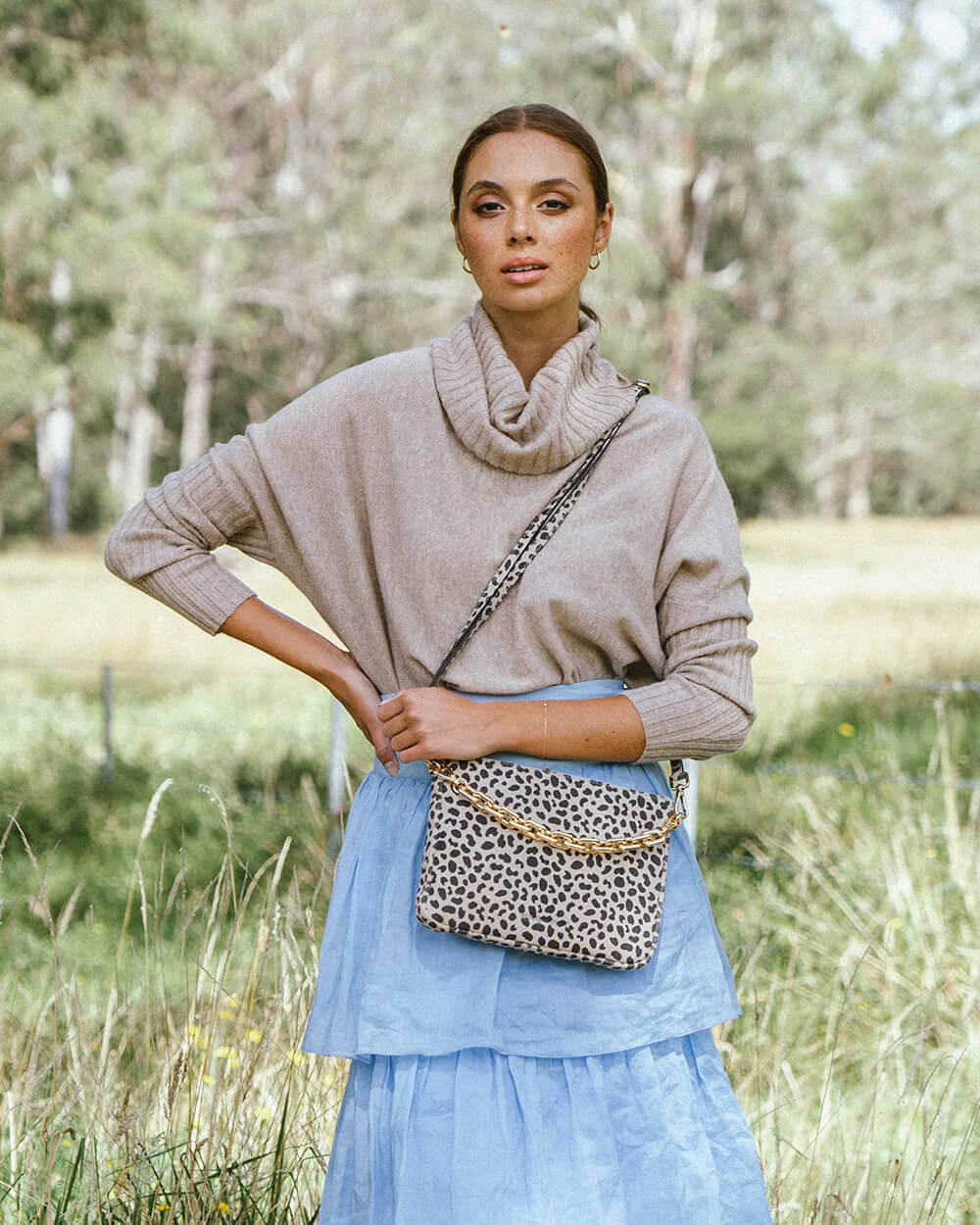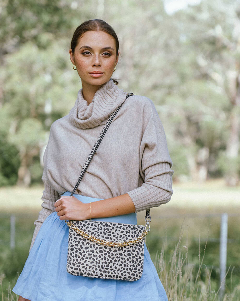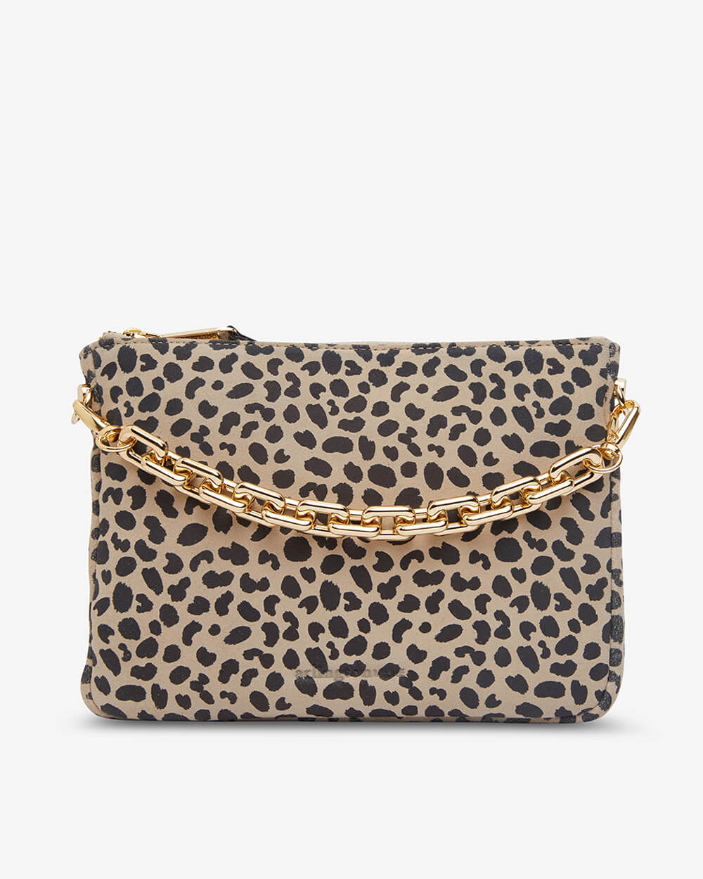 The Arlington Milne Samantha Crossbody in Black is crafted from premium leather and features a decorative front chain detail. Samantha can be carried clutch style or worn using the long shoulder strap. The top zipper opens to reveal Arlington Milnes signature hot pink lining, a zipper pocket, and an open top slip pocket, both with leather trim.