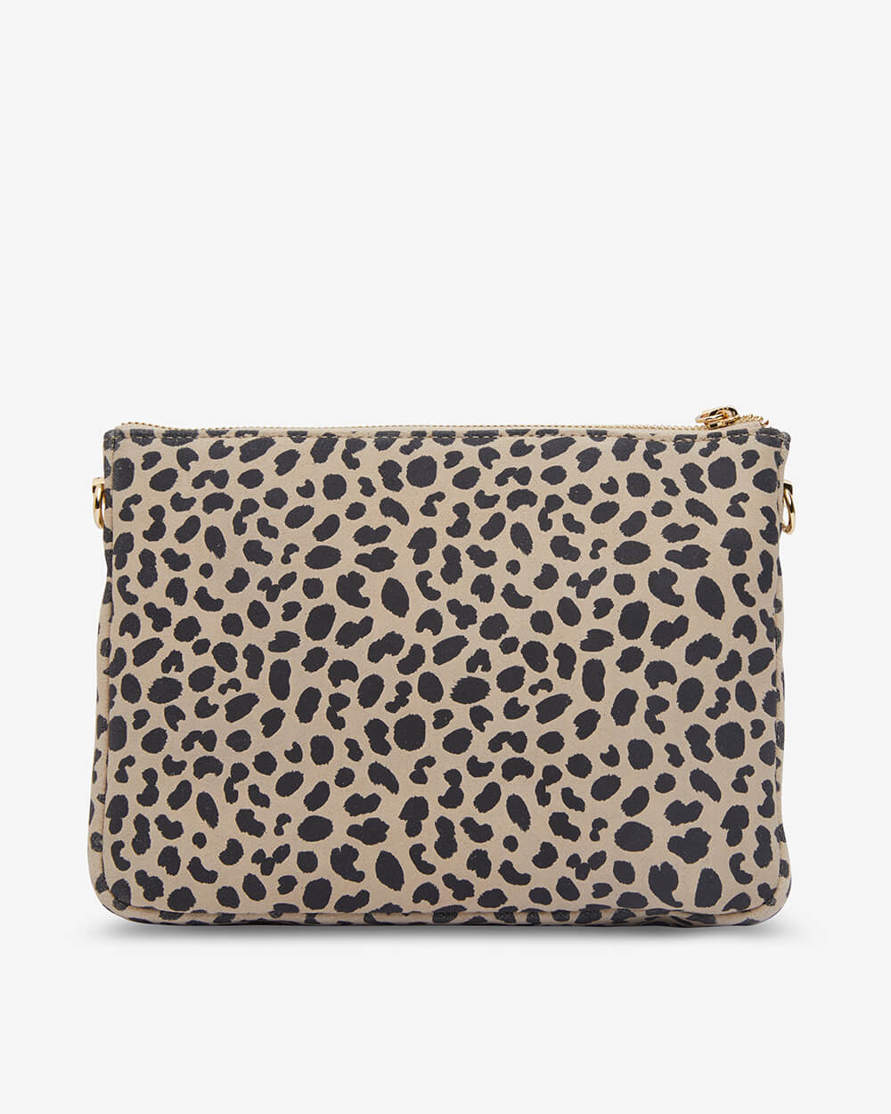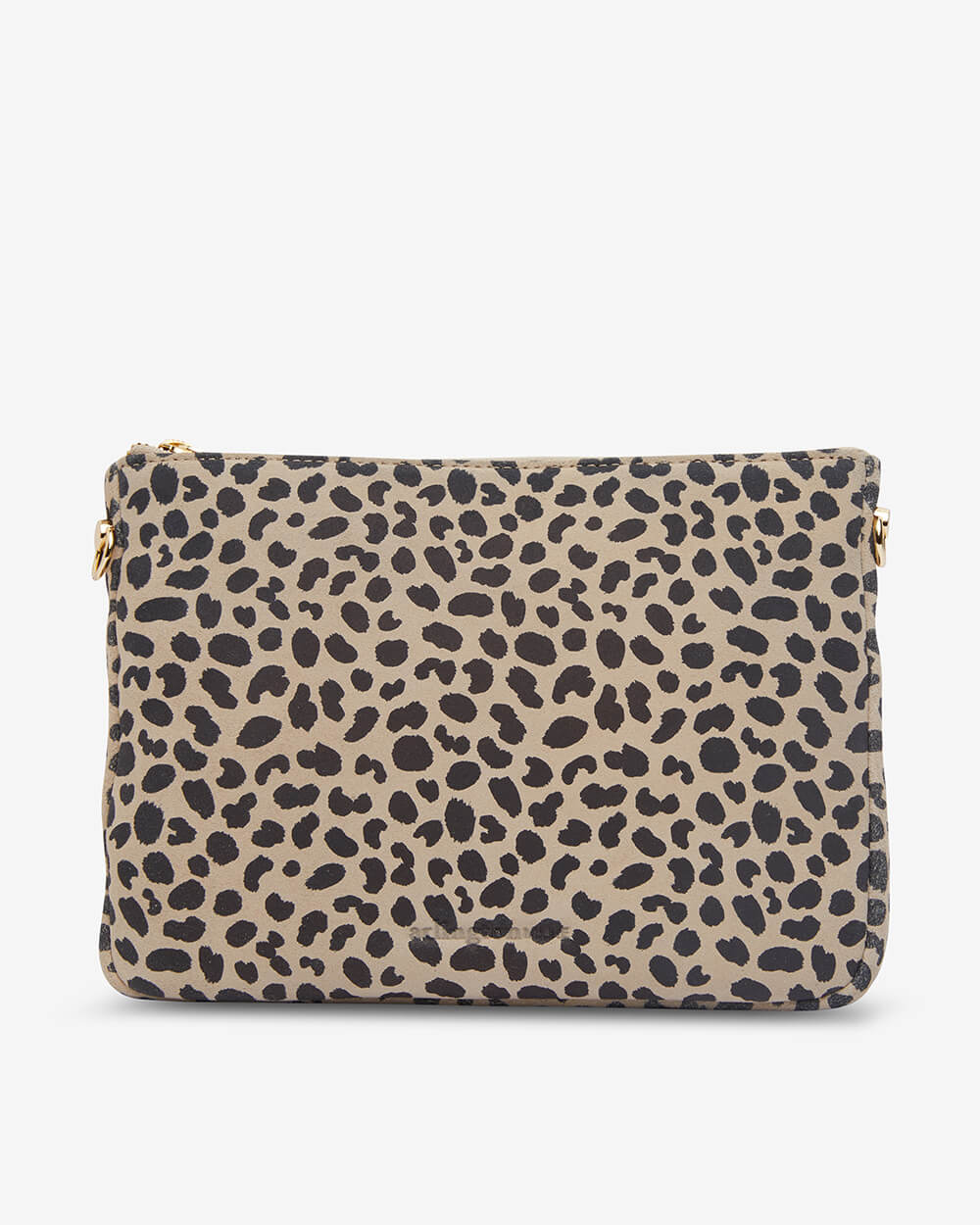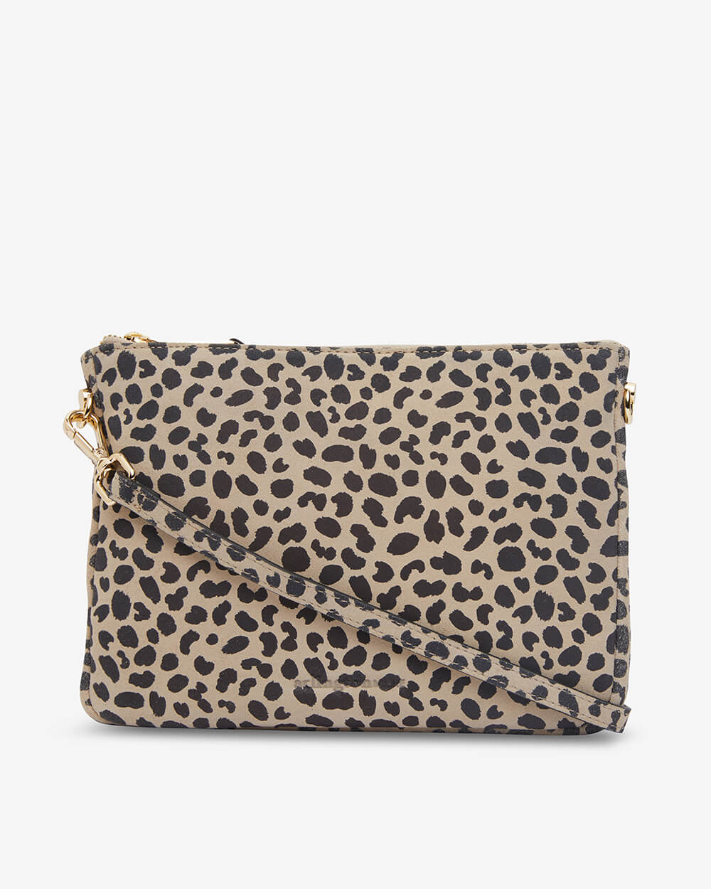 Internals: Zipper pocket, and open top slip pocket, both with leather trim