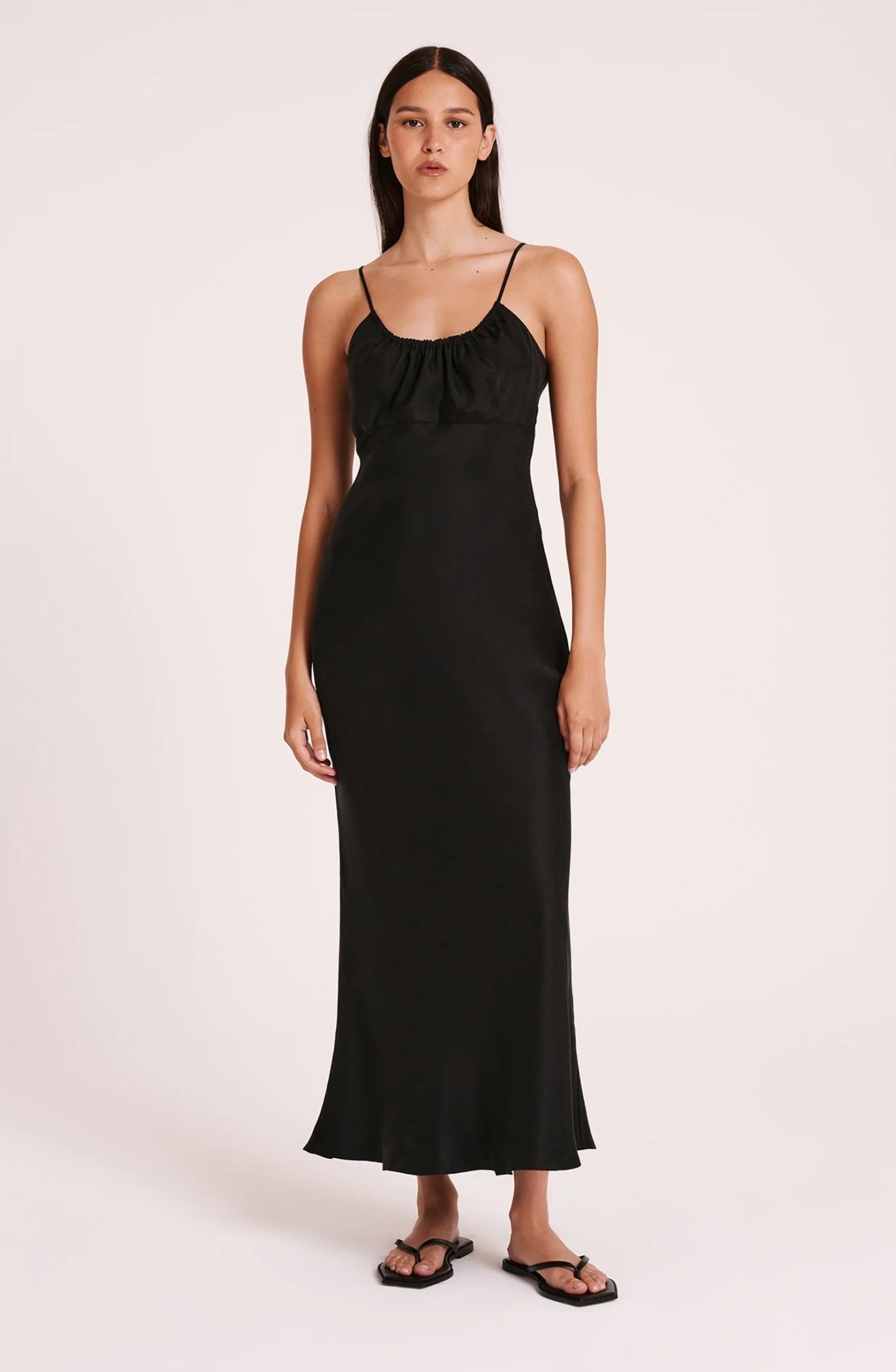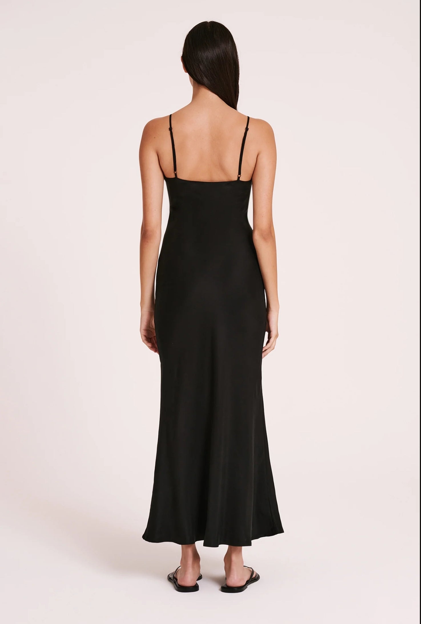 The Sol Cupro Dress is made in our signature cupro fabric which has a soft, velvety hand feel. The bias cut silhouette skims over the body and finishes at ankle length. Features include a gathered neckline, an under bust seam and thin straps that channel through neckline with adjusters.