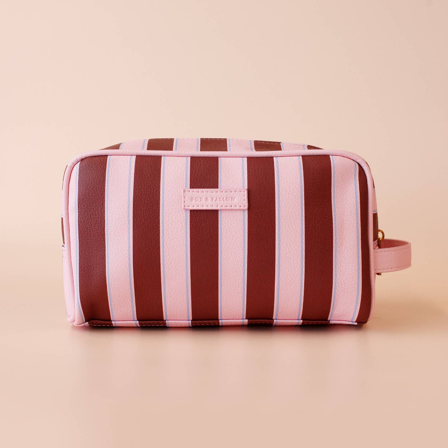 Introducing the coolest toiletry bags you've ever seen! Crafted from super soft, yet durable luxury pebble vegan leather it's easy to keep clean - simply wipe down with a damp cloth. Medium: 25 x 10.5 x 14.5cm. Pebble vegan leather with a tan lining. Internal zip pocket. Gold hardware. Two outer pouch pockets. Handle. Gold zipper. Packaged with a diecut gold foiled swing tag. Designed in Australia, made ethically in China.
