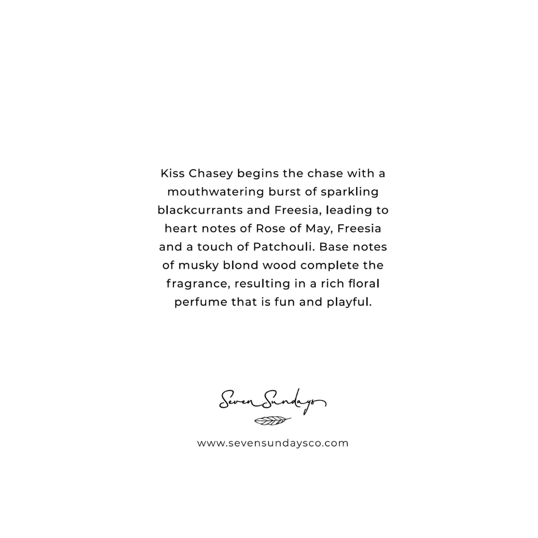 Kiss Chasey begins the chase with a mouthwatering burst of sparkling blackcurrants and Freesia, leading to heart notes of Rose of May, Freesia and a touch of Patchouli. Base notes of musky blond wood complete the fragrance, resulting in a rich floral perfume that is fun and playful.
