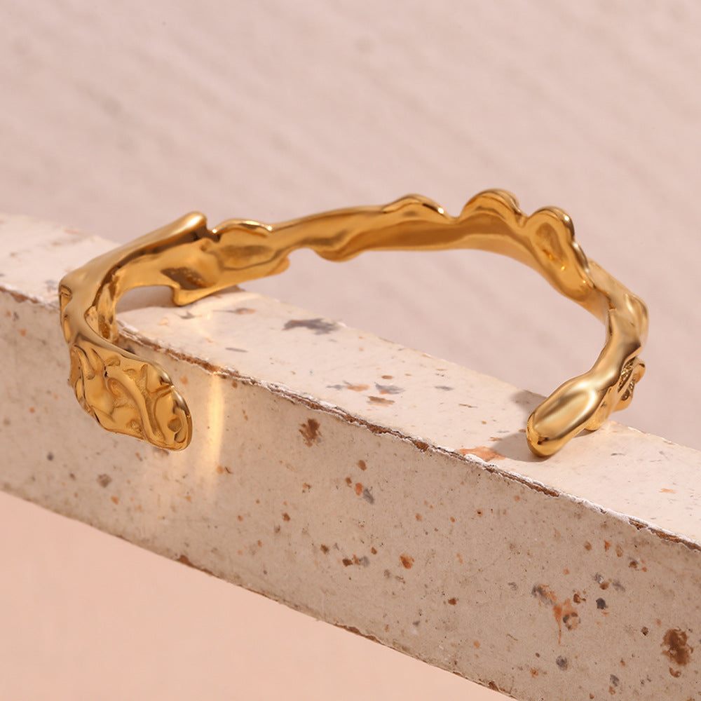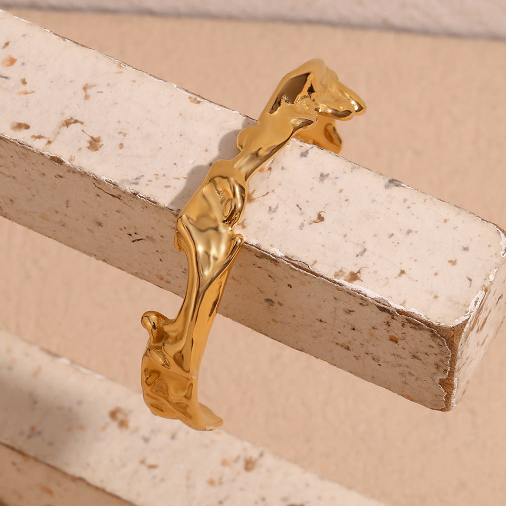 Crafted from durable stainless steel and finished in luminous 18k gold plating, this open cuff is designed to be worn daily — waterproof, tarnish-resistant and endlessly versatile.