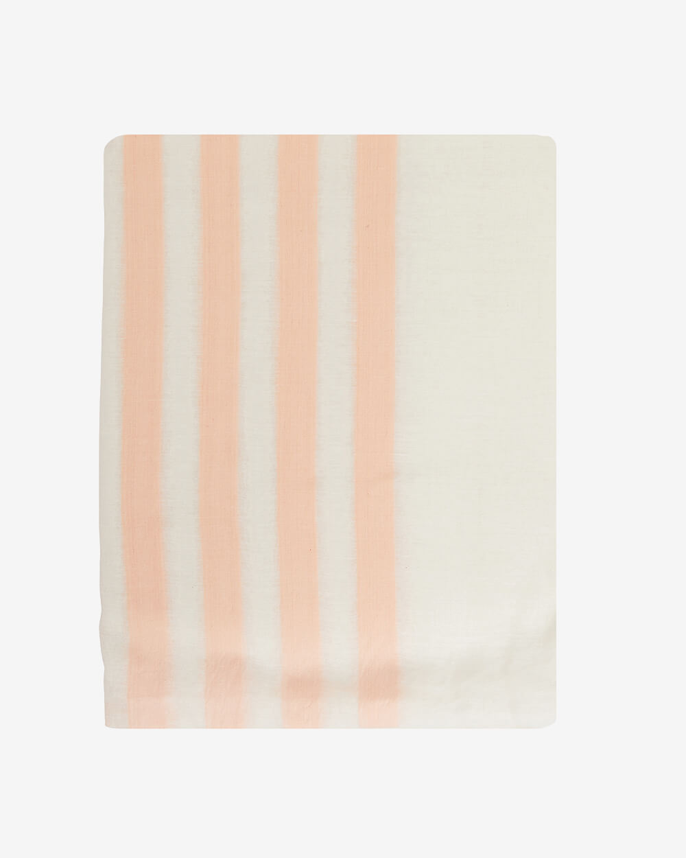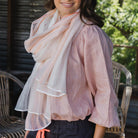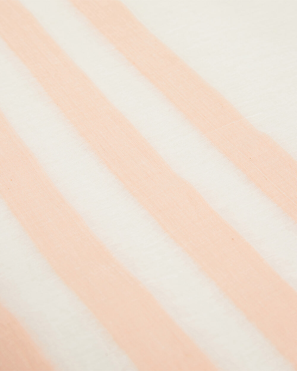 The Elms and King Silk Cotton scarves are crafted from a hand loomed silk cotton blend (30% silk, 70% cotton). The fabric has a beautiful soft, dry hand feel. We produce our designs working directly with a small supplier in India, and all scarves are hand loomed to order. Blush stripe with fluoro peach stripe.