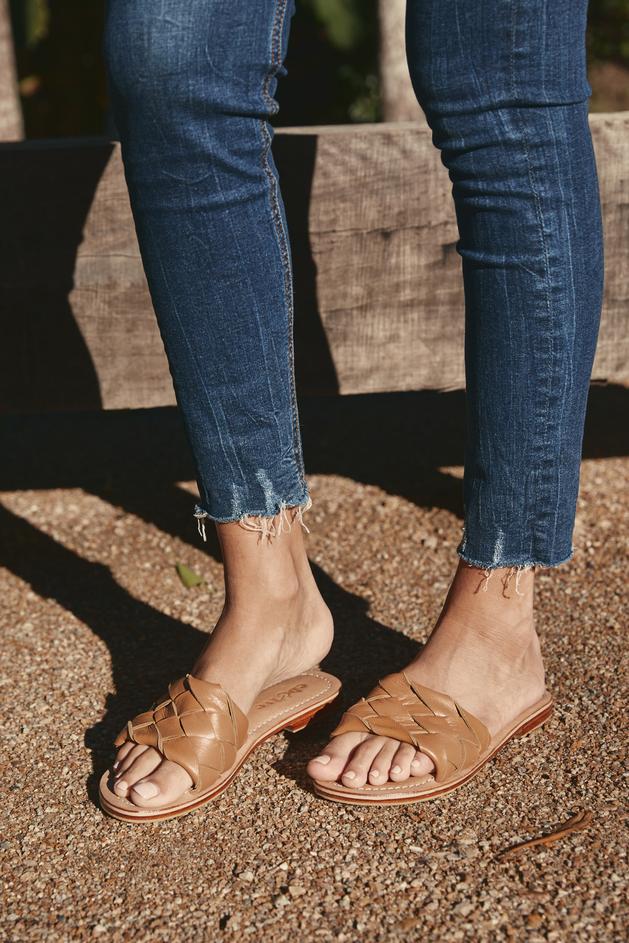 Opt for easy summer footwear with the Tribal Slider, featuring a flat sole, an open-toe sandal with beautifully woven leather. Gorgeous and understated, this lovely women's slide will add a relaxed finish to your outfit.