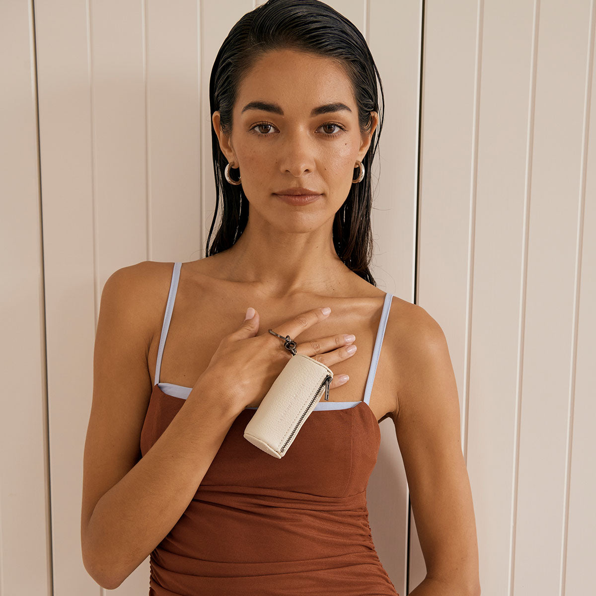 A nifty little tubular pouch, 'Escape' is made to clip onto our 'Thin Web Strap' or onto a D ring on the side of your bag to keep all your small stuff together (notes, coins, lip gloss etc), plus has a keyring for easy access to your keys.