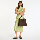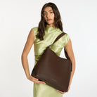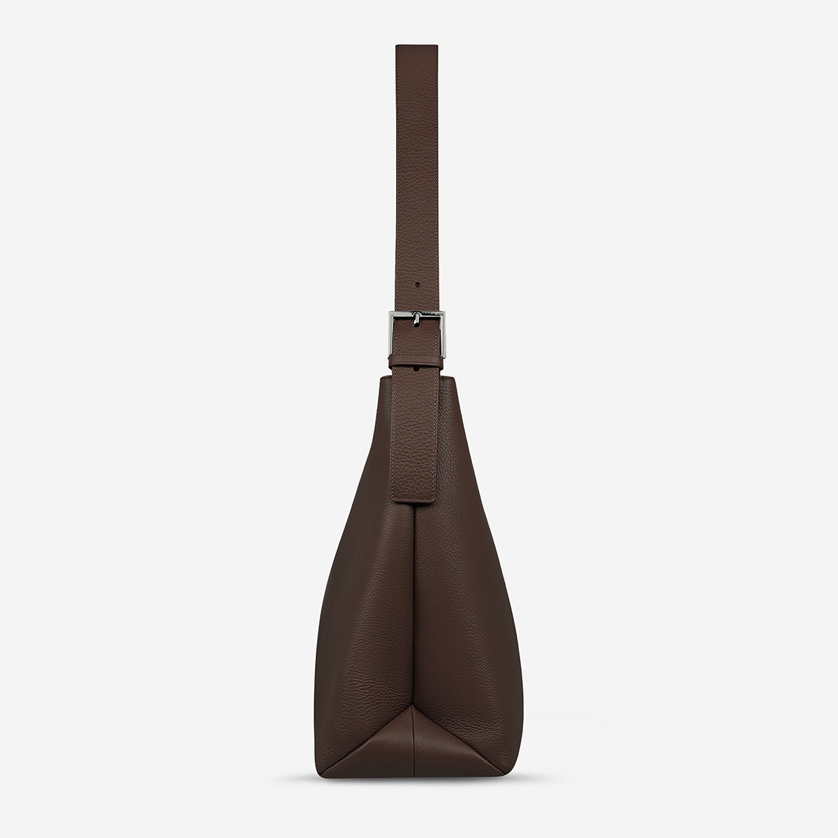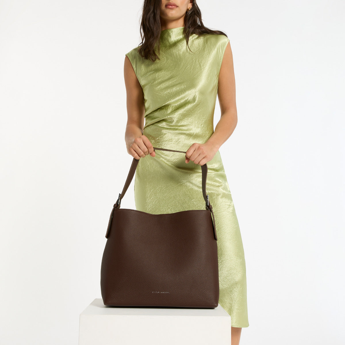 Built to handle almost any size impulse purchase, the 'Forget About It' bag has a magnet close top, an edgy angular silhouette, and branded strap buckles.