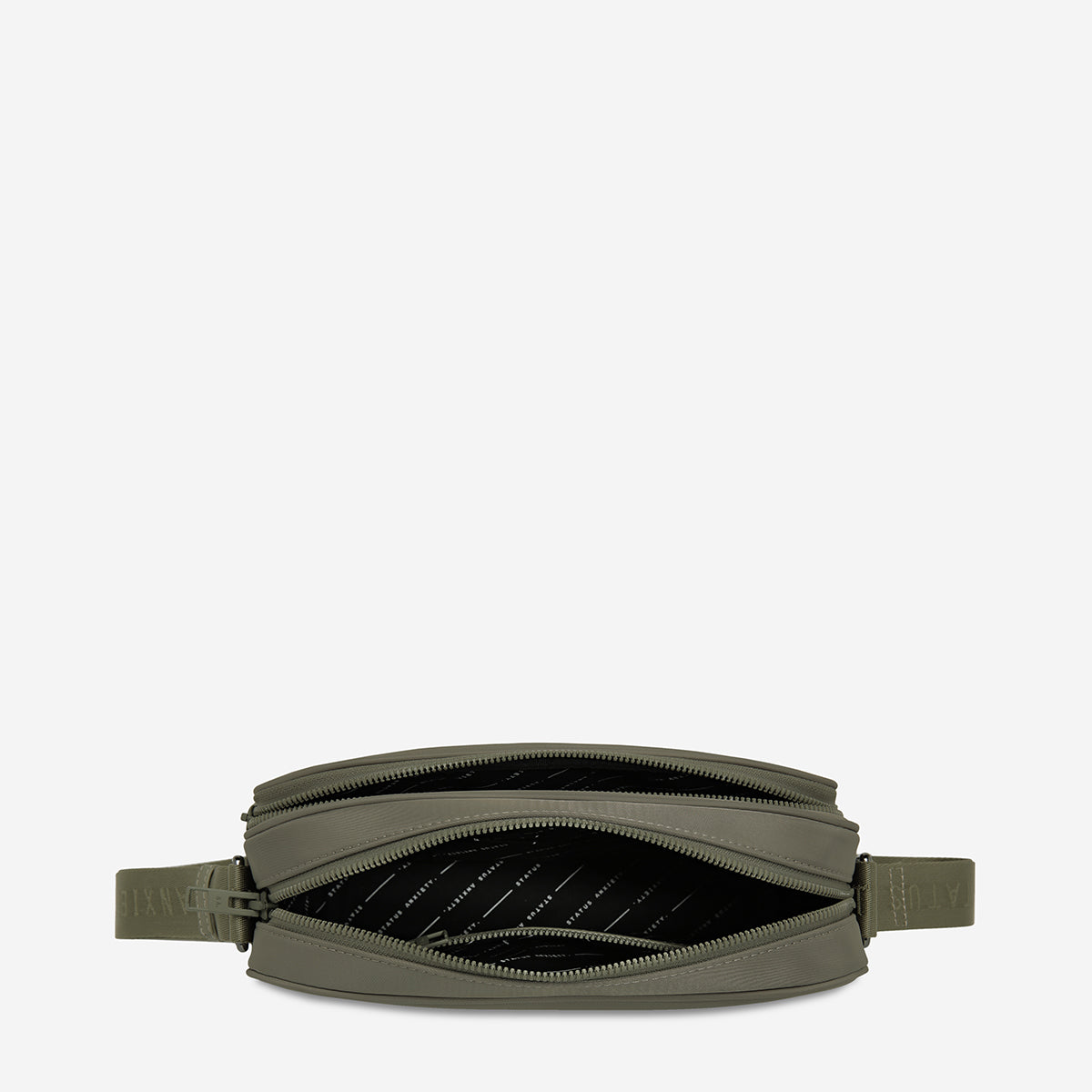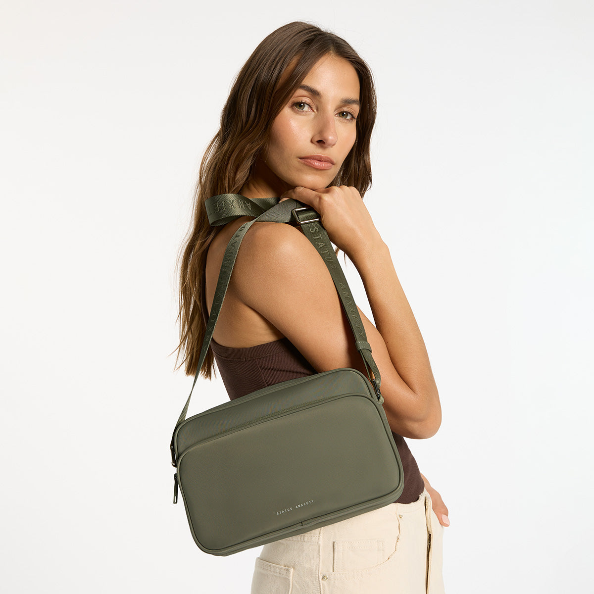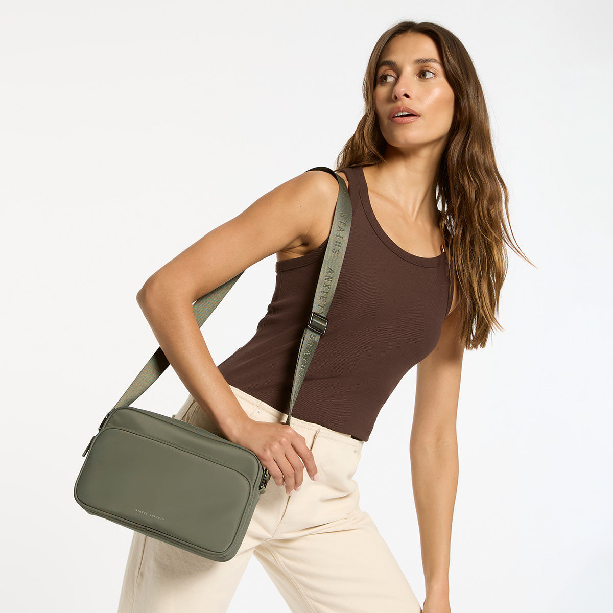 Rani is made of premium reinforced recycled polyester to give it superior structure, and is finished with our branded zippers and gunmetal hardware. Featuring a long adjustable webbed strap, dual zip compartments, and internal zip pocket and card slots.
