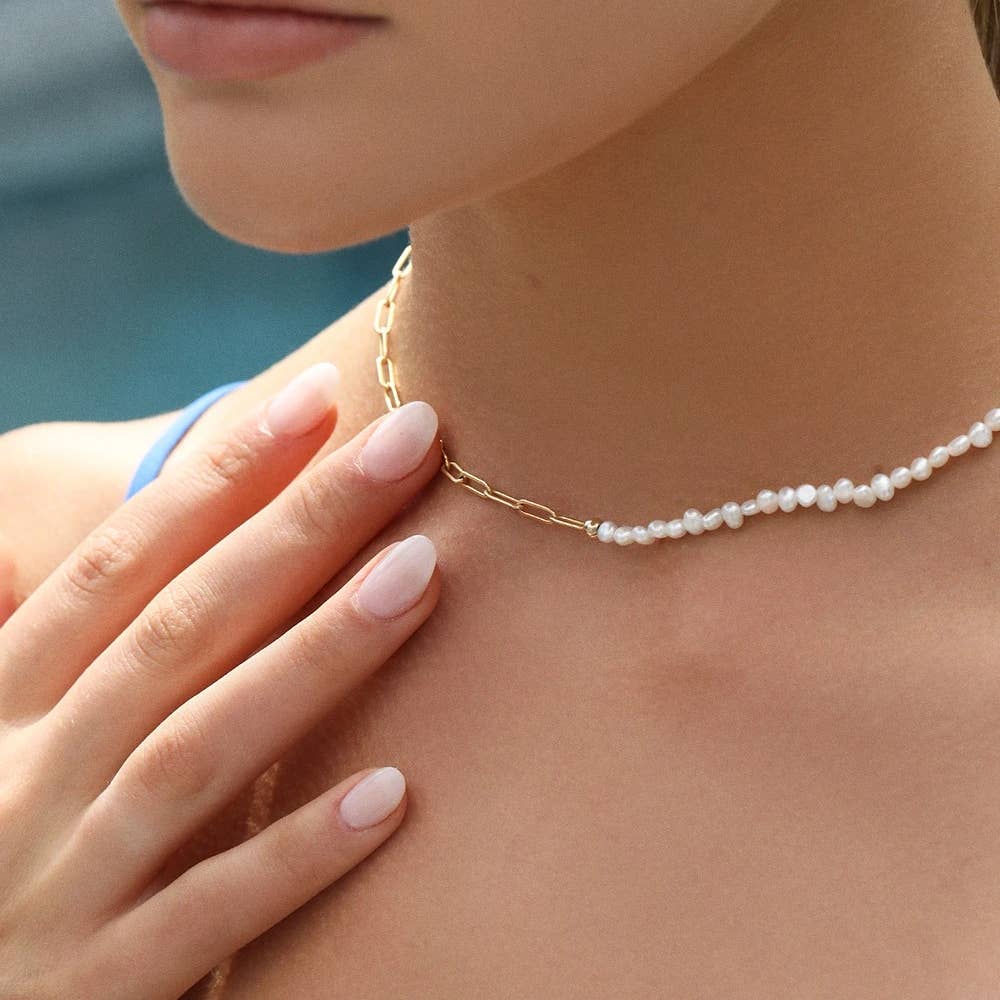 The Half Freshwater Pearl Beaded Necklace is the necklace of the season! Made from our thickest and most luxurious chain and beautiful freshwater pearls, this is a necklace you can take from day to night, that you'll never want to take off. - Chain dimensions: 3 x 8.8mm.