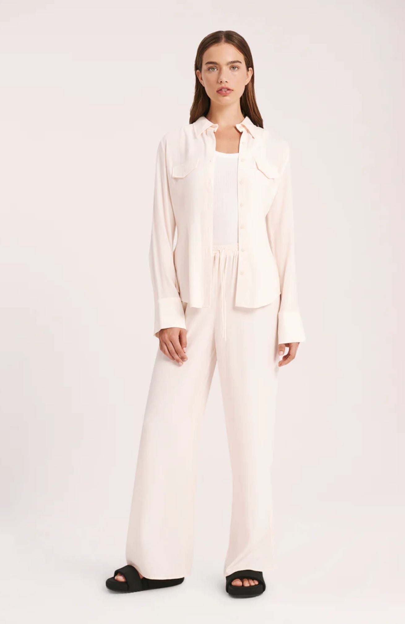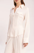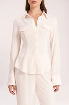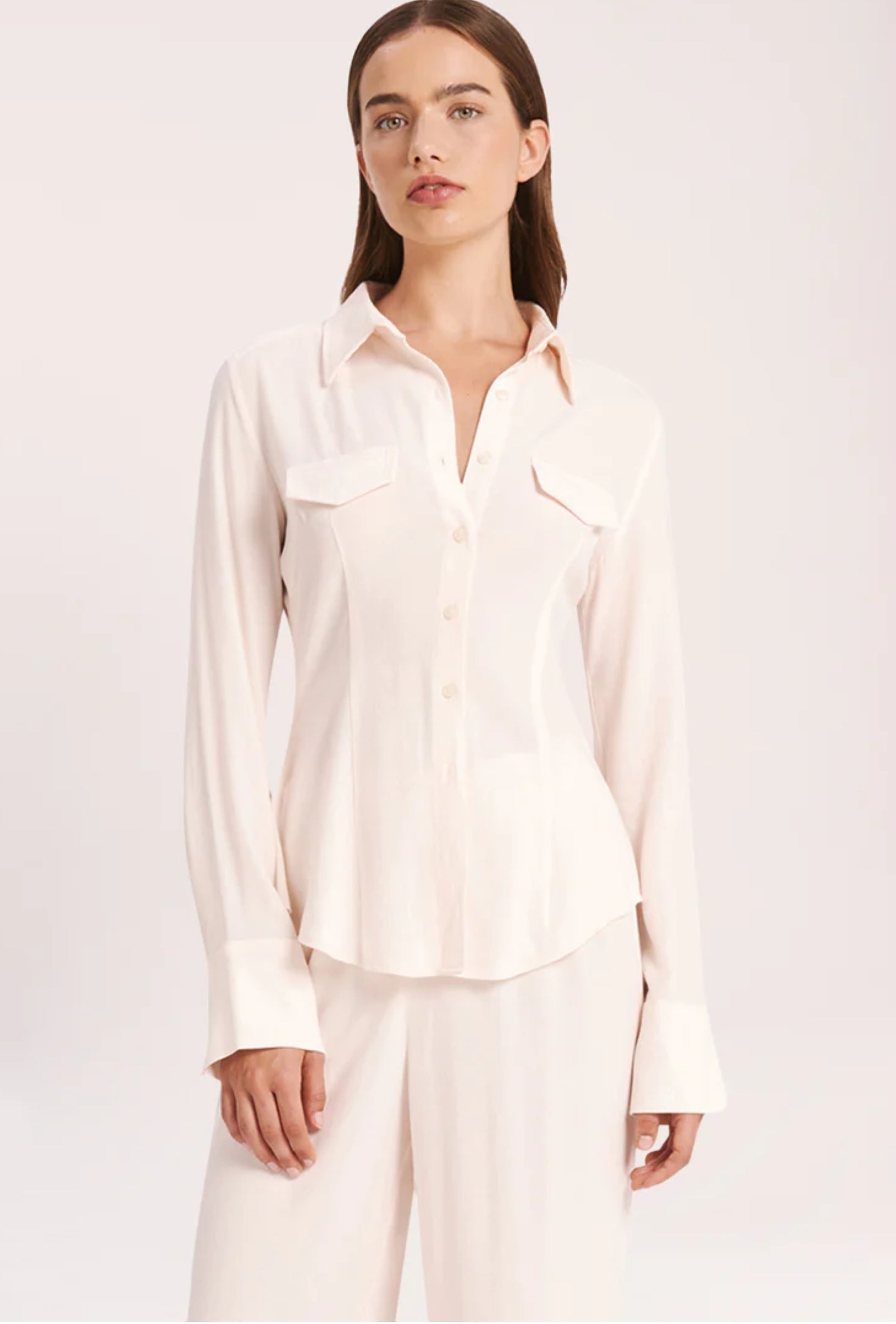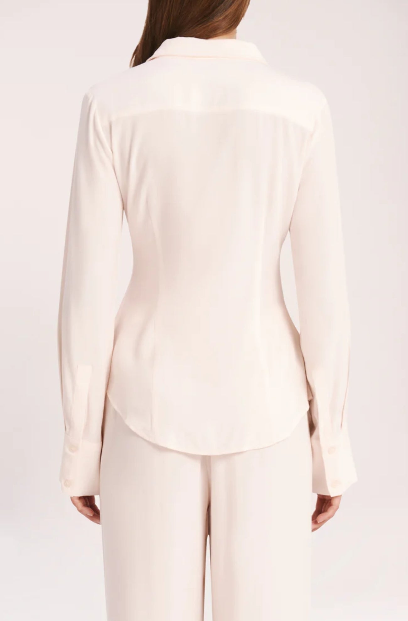 The Mira Shirt is made from lightweight fabrication which has a silky, smooth hand feel. Silhouette is fitted throughout, with long wide sleeves. Classic shirting features include a wider pointed collar, and front button opening, and a curved hem shape.