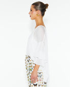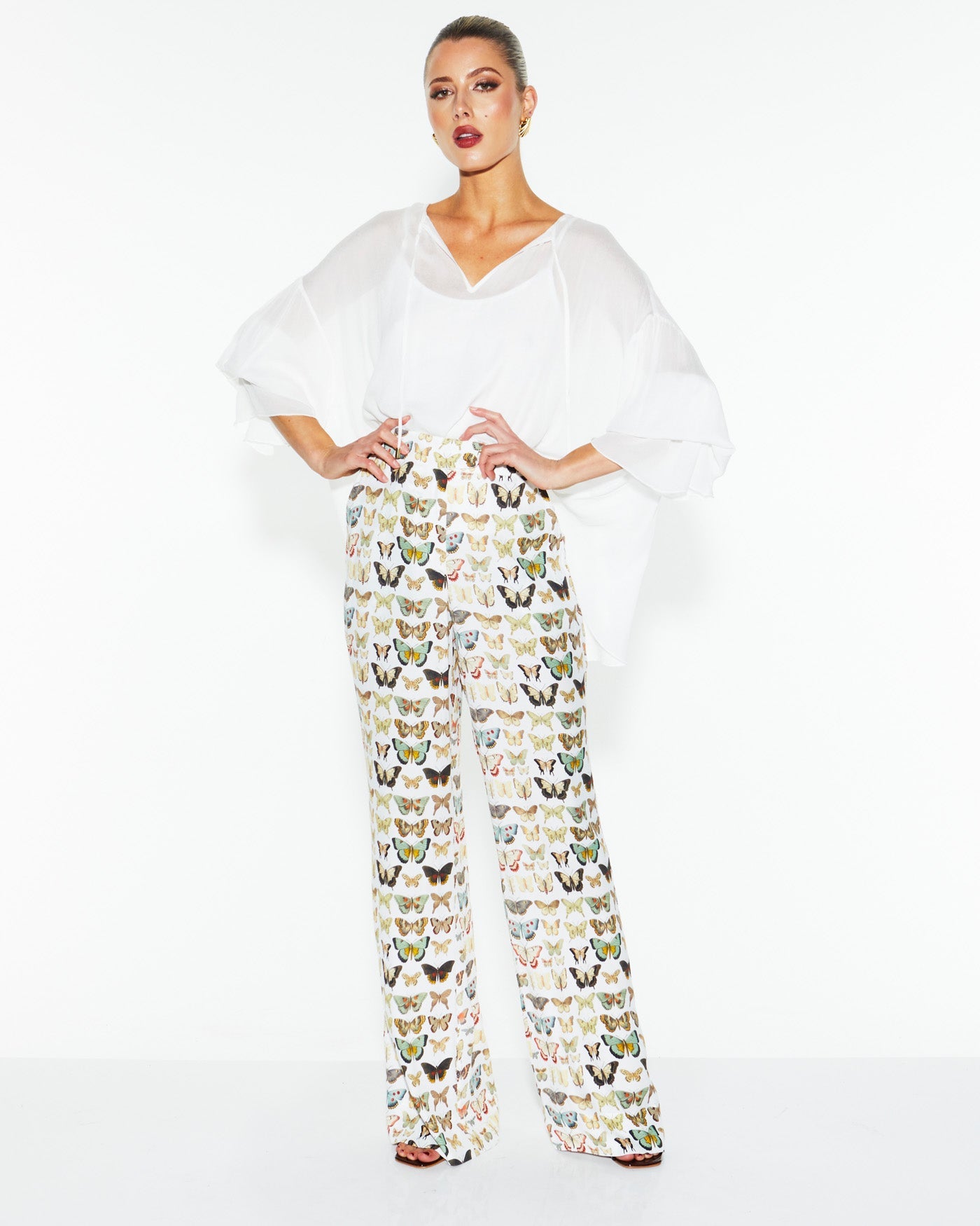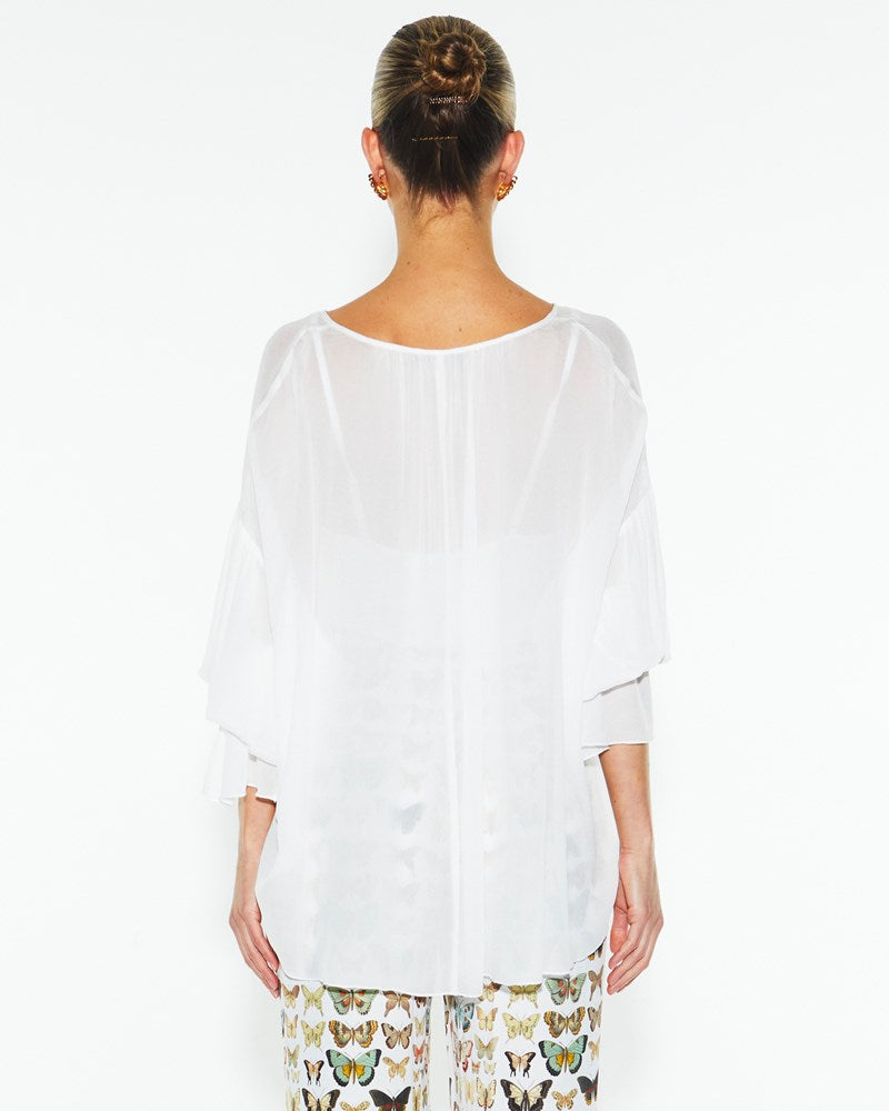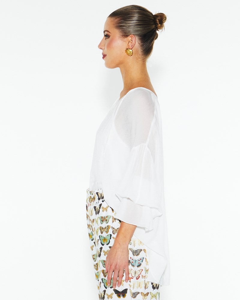 The Glasshouse Top offers a refined, springtime look with its elastic frill sleeves and self-fabric neck tie with gold ends. The soft drapey fabric and removable slip ensure both comfort and elegance.