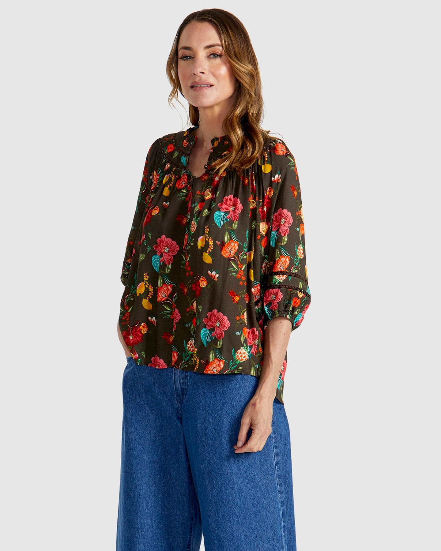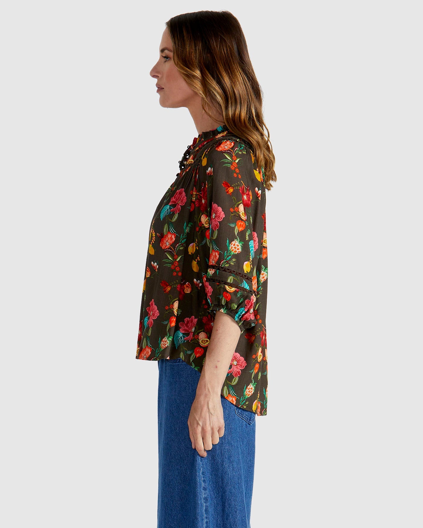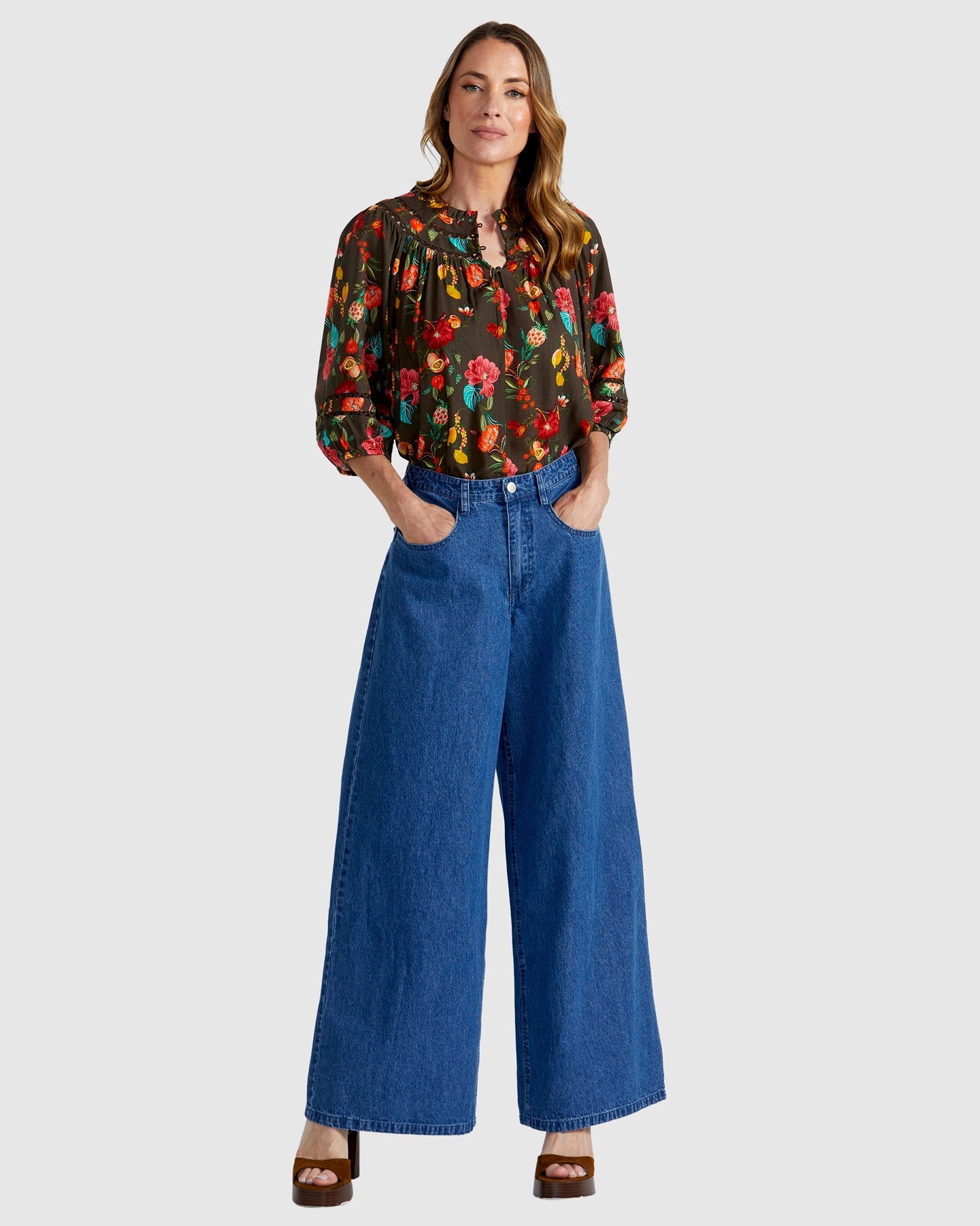 Featuring oversized puff sleeves with ladder trim detail, the Guadalupe Top is a sophisticated, winter-ready piece. A front keyhole opening with button closures and frill detail at the collar elevate its classic design, offering a polished, relaxed fit for the discerning woman.