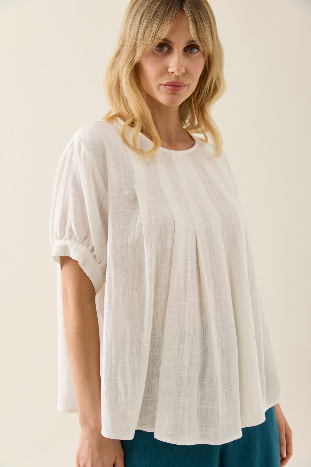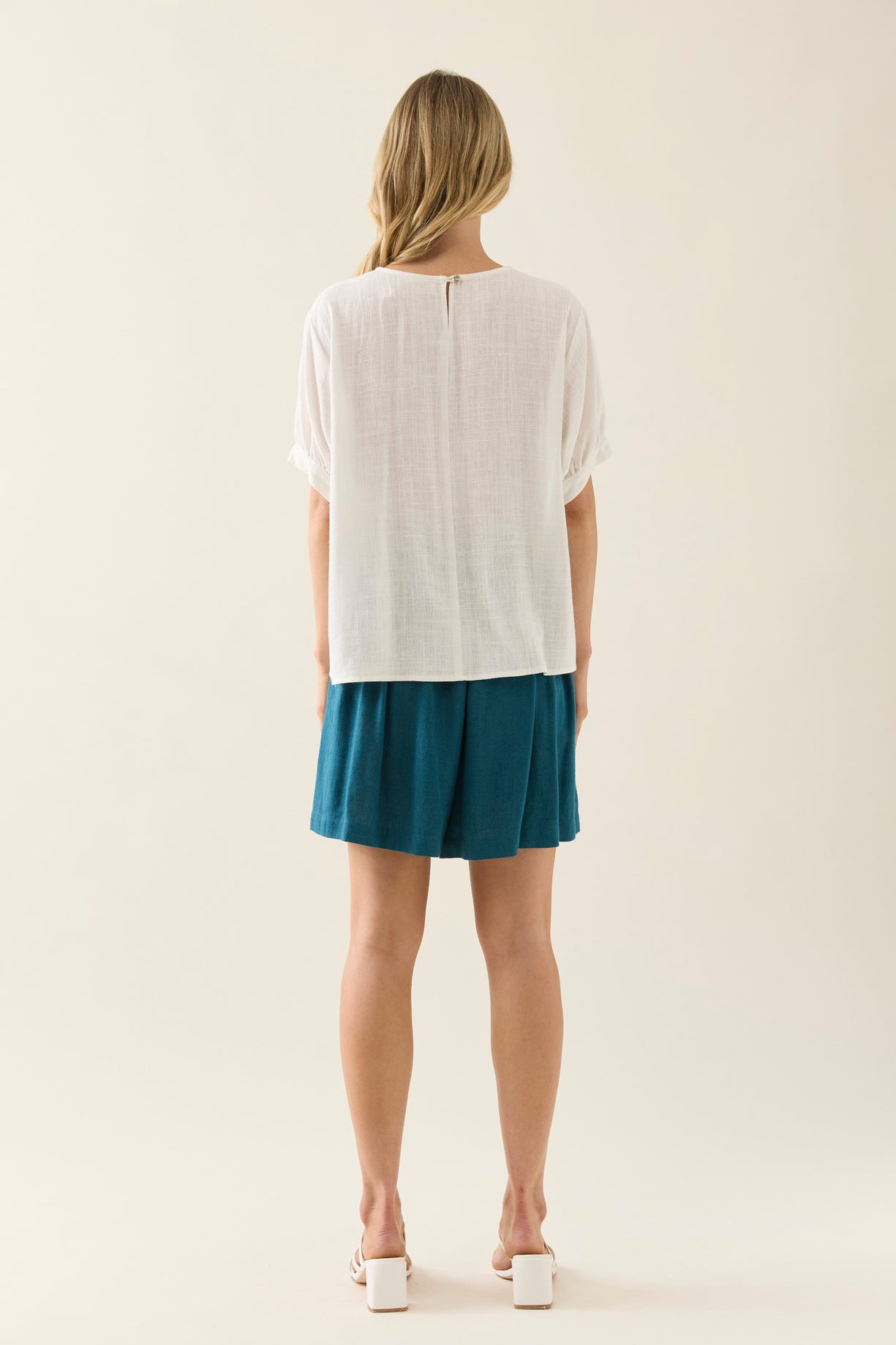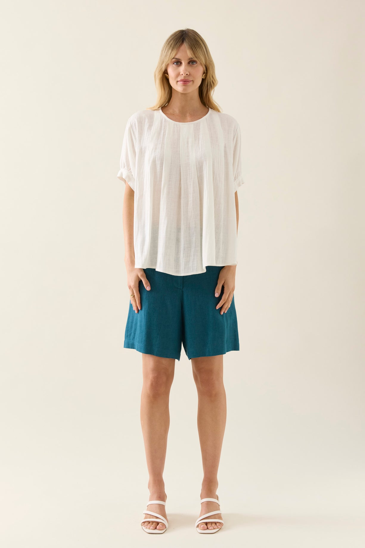 A relaxed linen-blend top with soft front pleats that bring subtle texture to the neckline. Finished with a round neck, keyhole button closure at the back, and cuffed short sleeves for laid-back comfort.