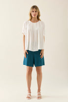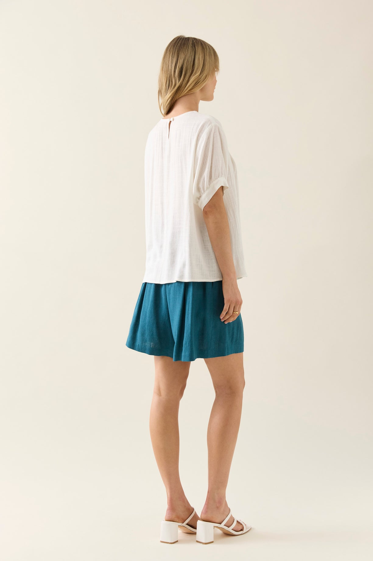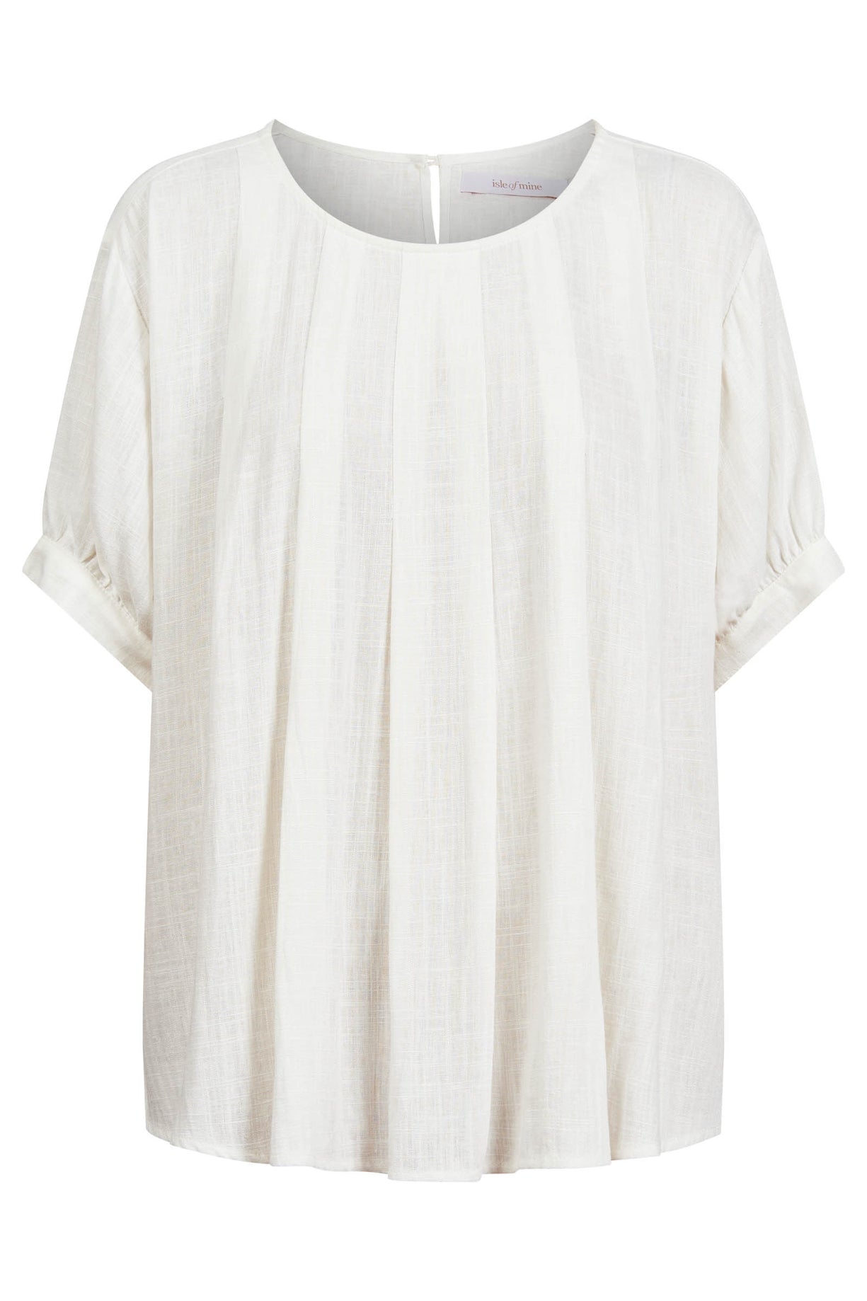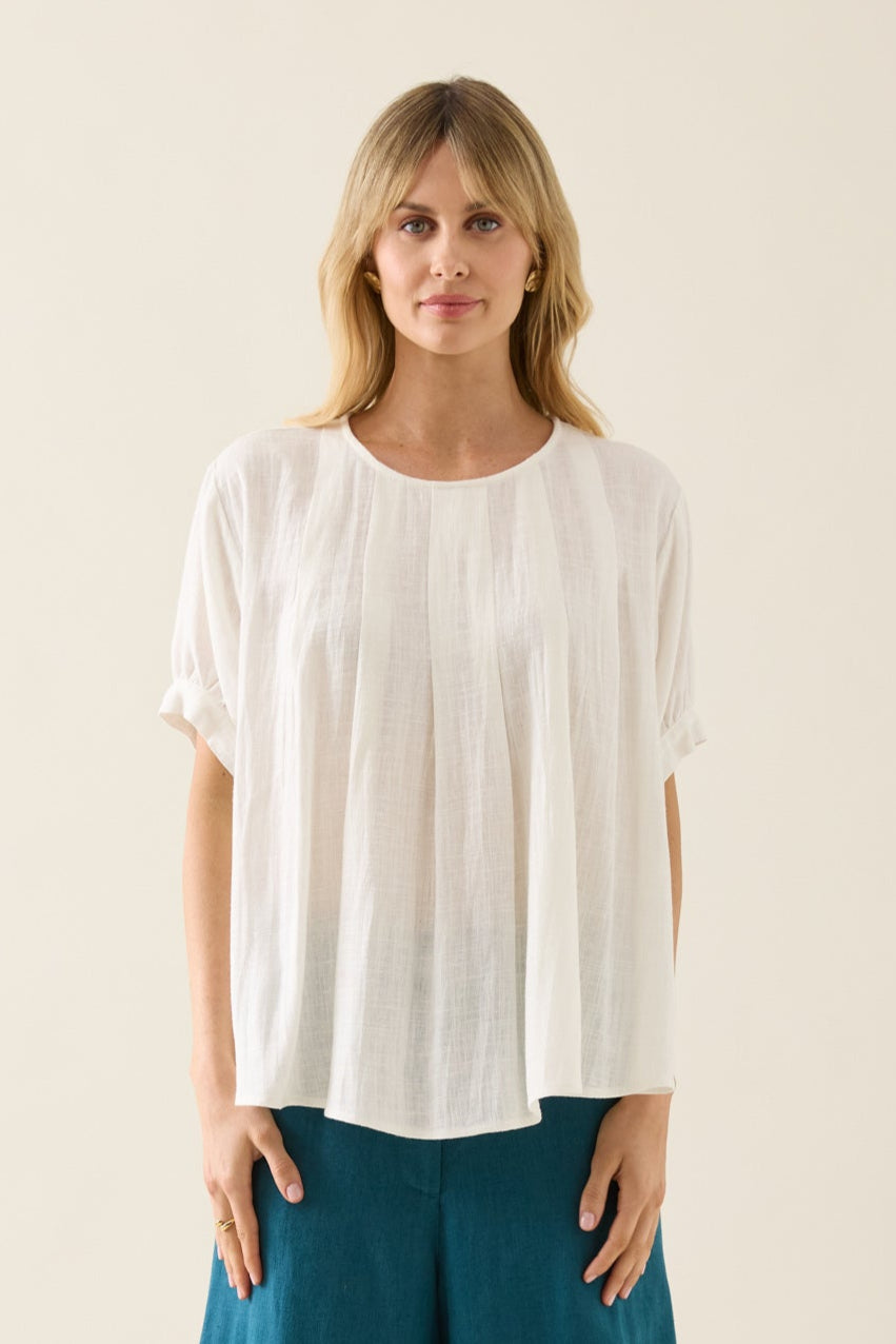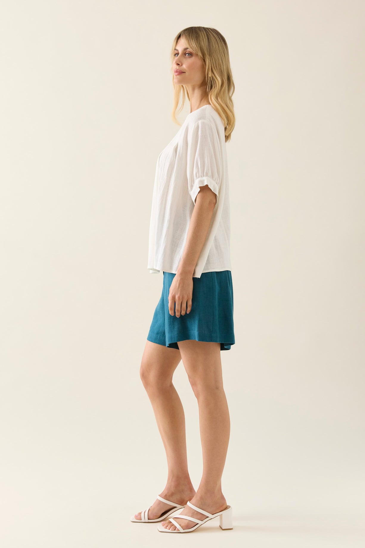 A relaxed linen-blend top with soft front pleats that bring subtle texture to the neckline. Finished with a round neck, keyhole button closure at the back, and cuffed short sleeves for laid-back comfort.