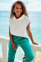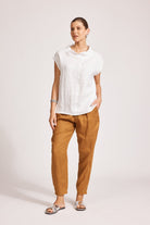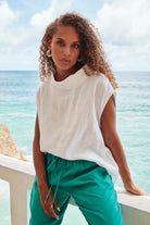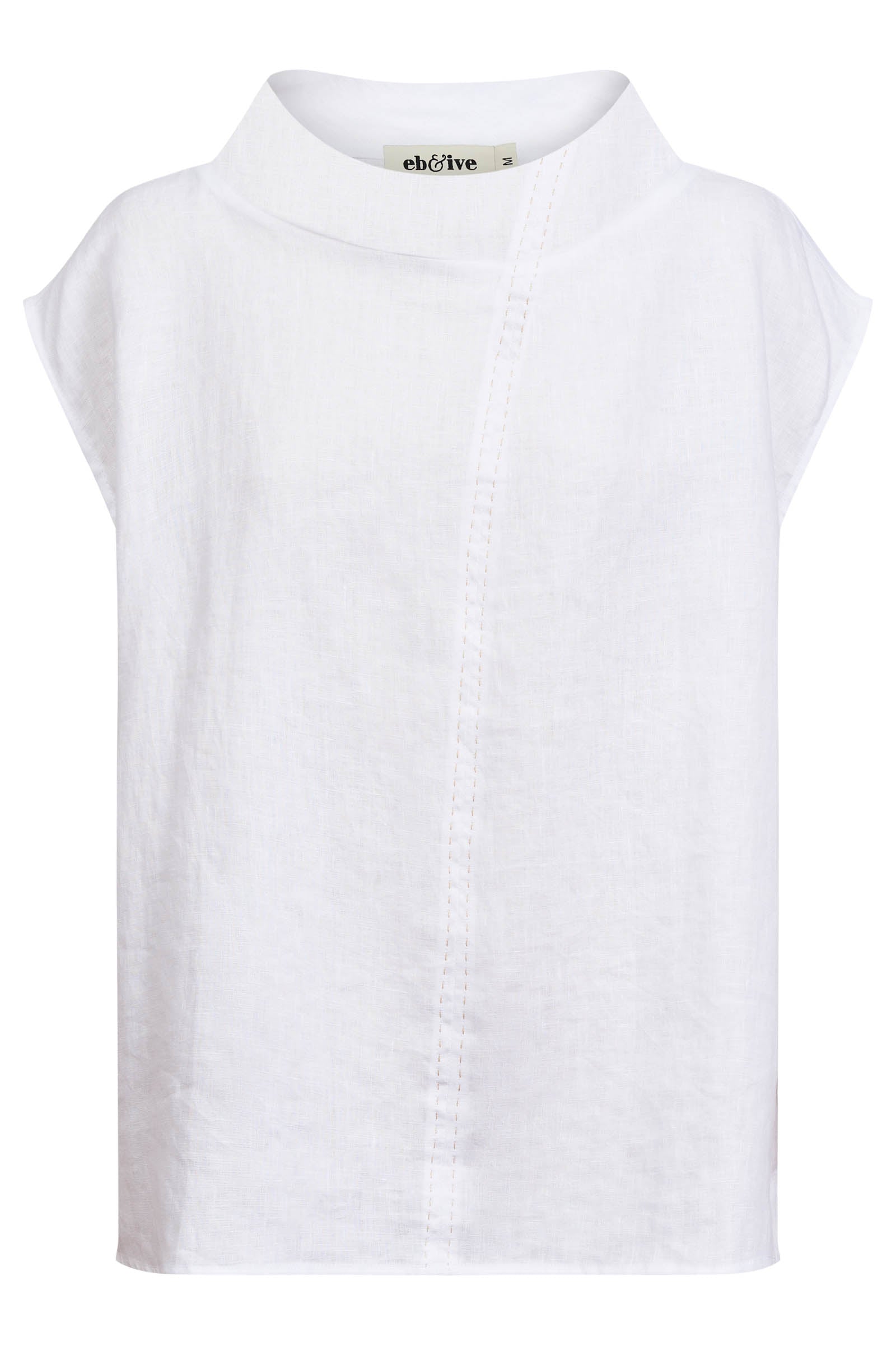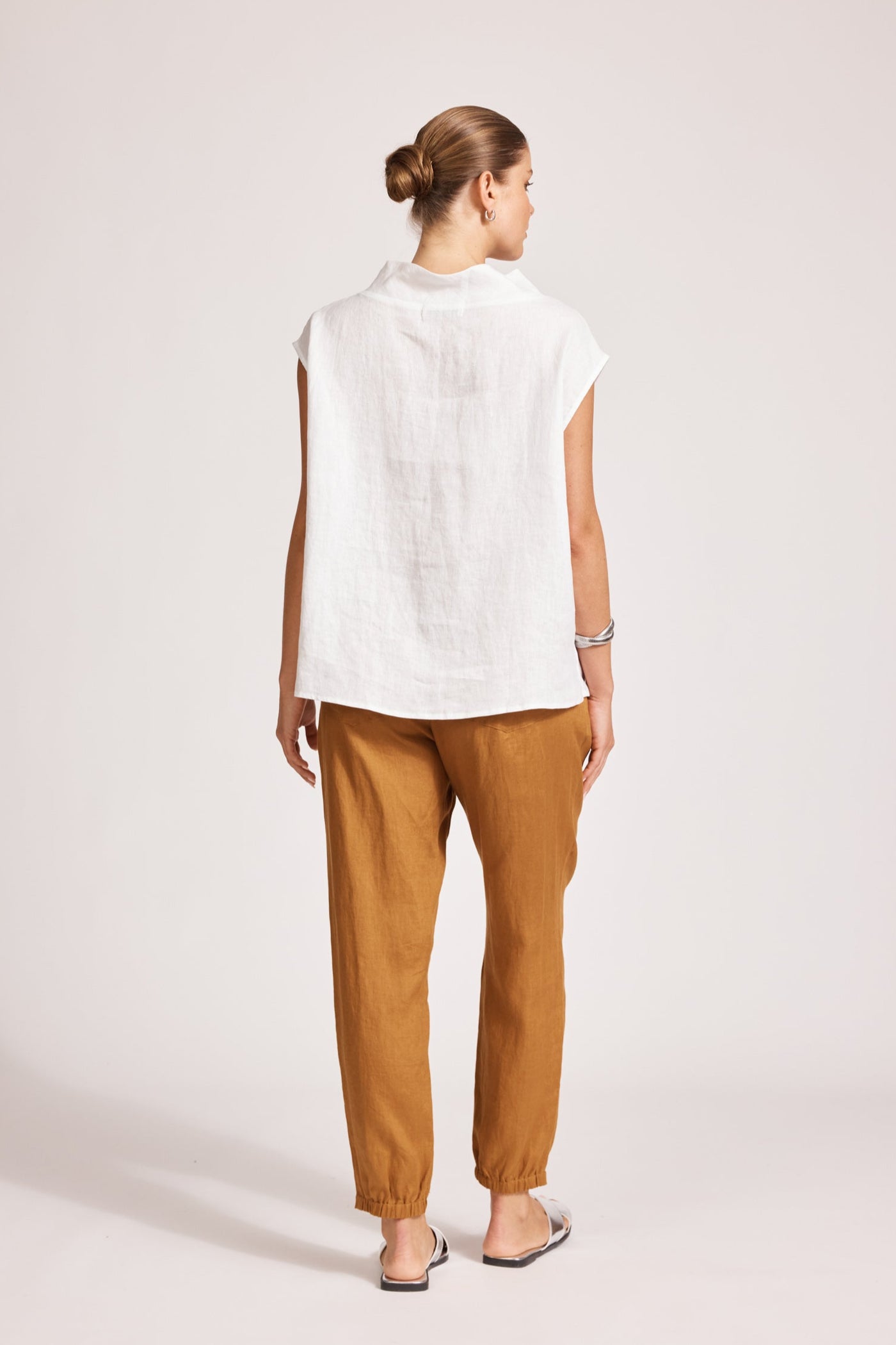 A best-selling linen top with sophisticated ease. Crafted from 100% linen for natural breathability. Features a relaxed high collar, cap sleeves, diagonal decorative topstitching, and soft, loose fit.