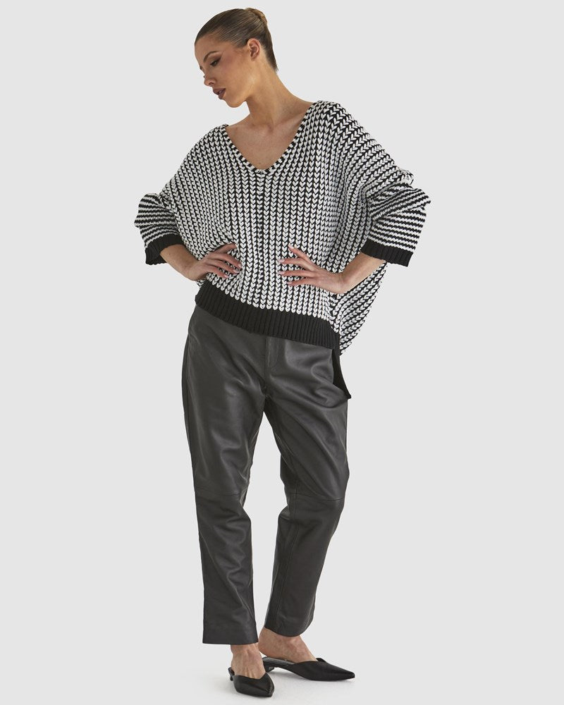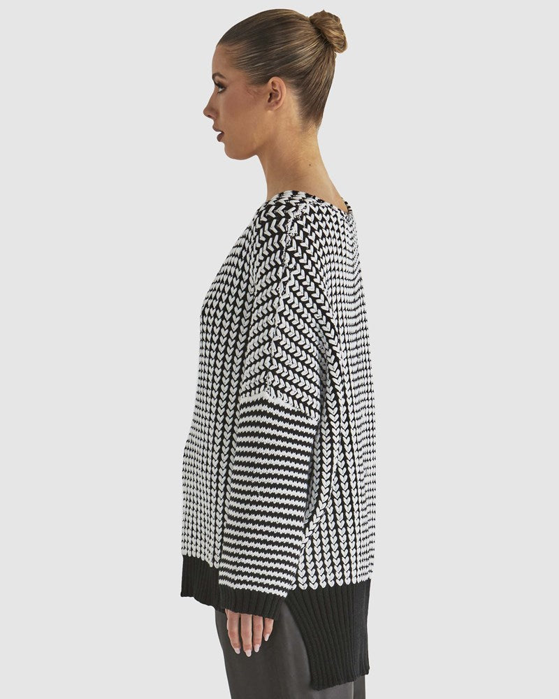 The Mosaic Knit is the perfect blend of comfort and elevated style, featuring a chunky knit texture and batwing sleeves. A V-neckline adds a feminine touch, while the split hem creates a relaxed, oversized fit. Designed for effortless layering, this piece is a refined take on cozy-chic dressing. A must-have for autumnal styling.