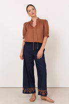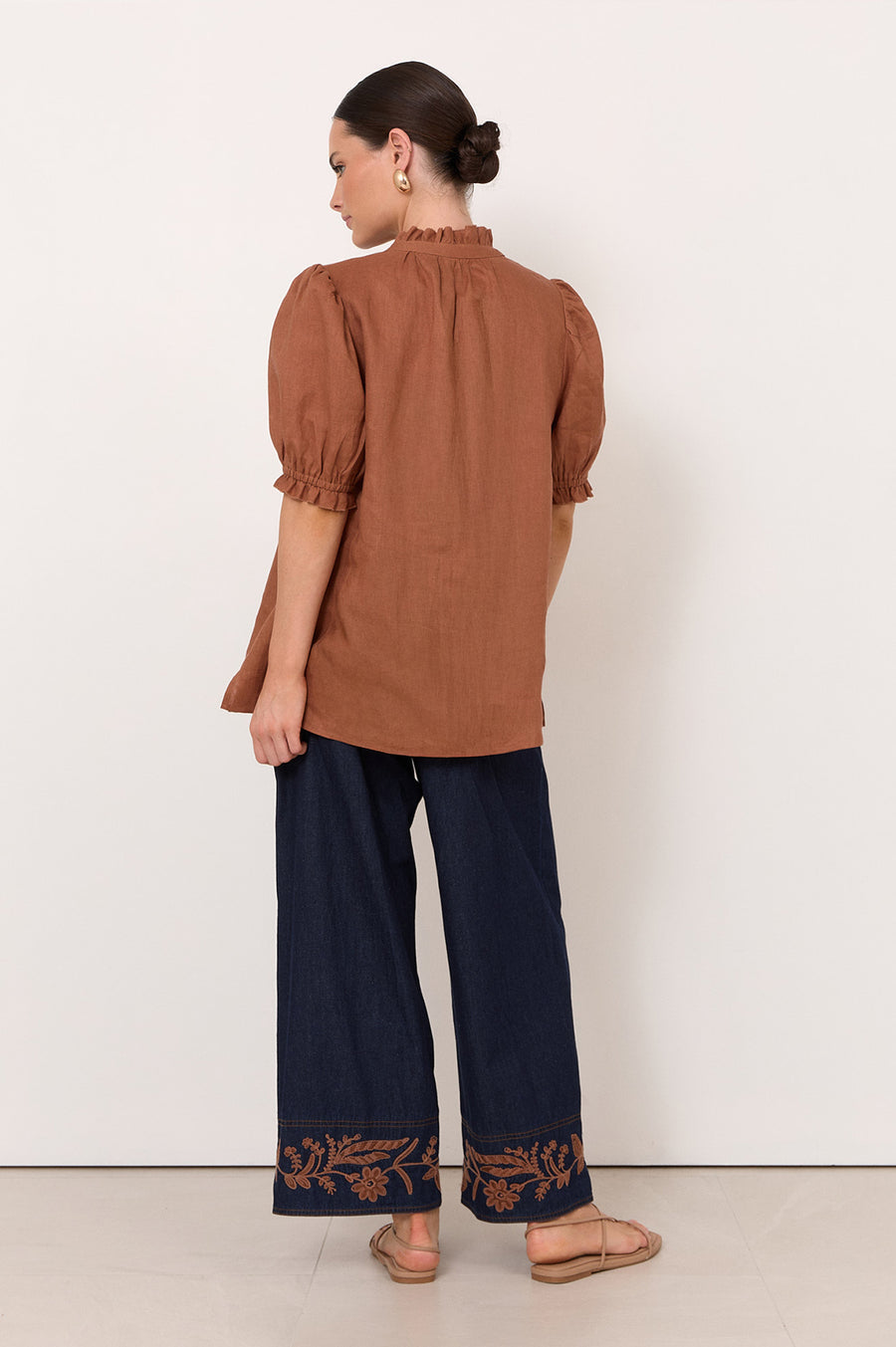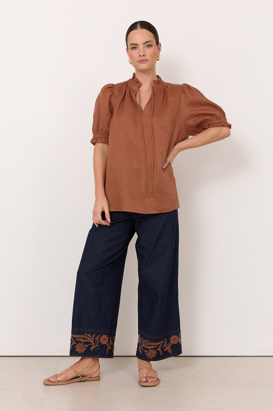 The Sandra Short Sleeve Linen Top is made from 100% linen and features a V-neckline with a tie closure and subtle frill detailing. Designed with short sleeves finished with elasticised cuffs and a straight hem.