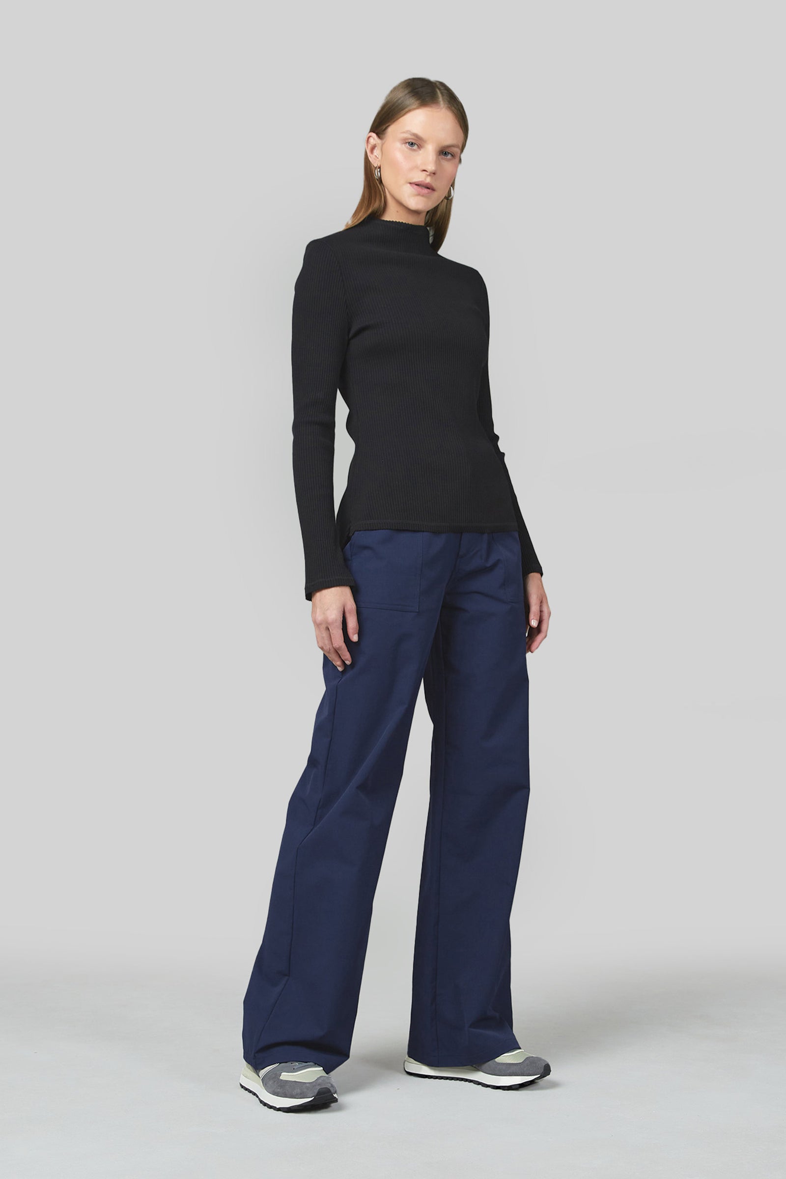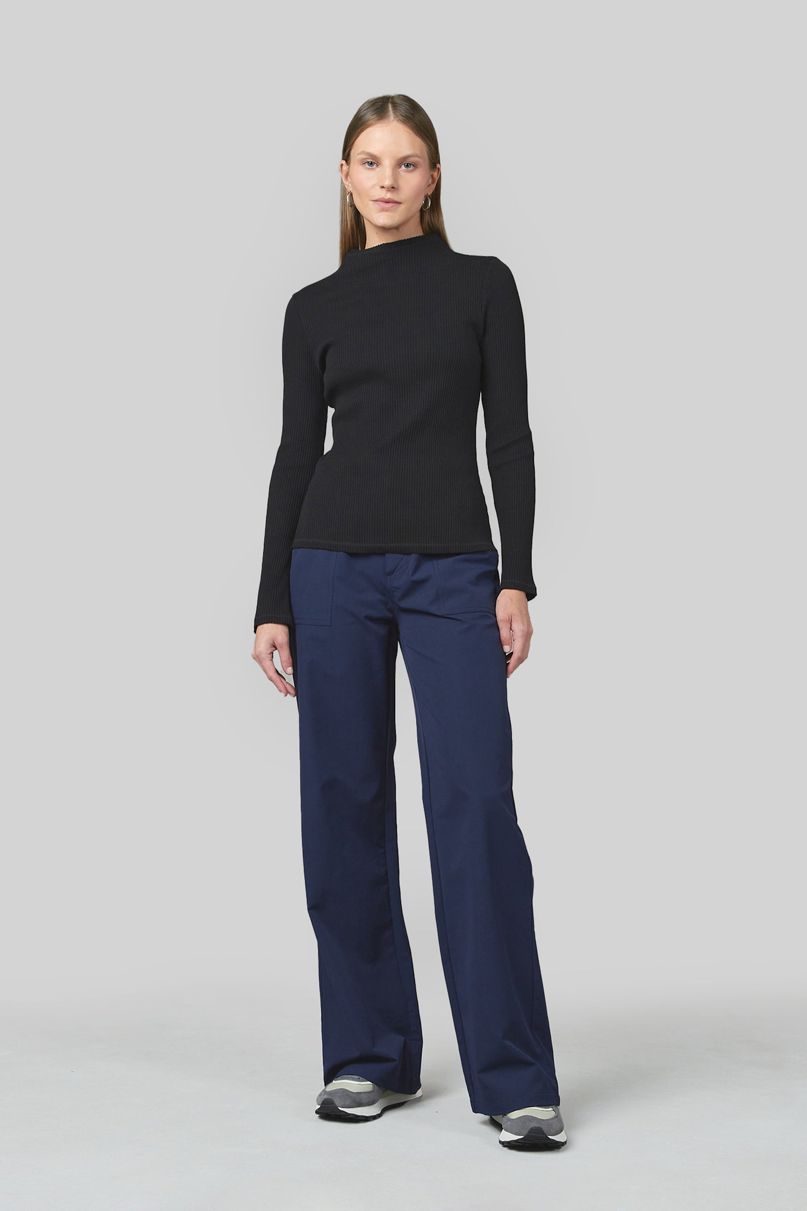 This High Neck Fitted Rib Top, called the Wave High Neck, is made of 95% Cotton Content, making it soft and comfortable. Its unique design features a slightly longer back length and a side seam slit.