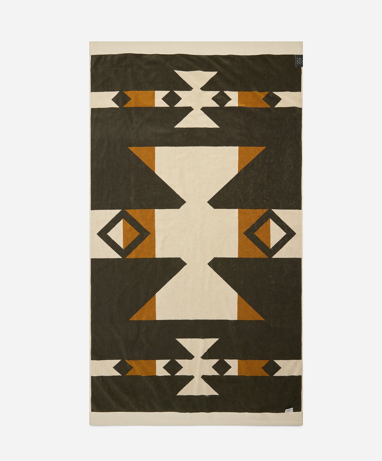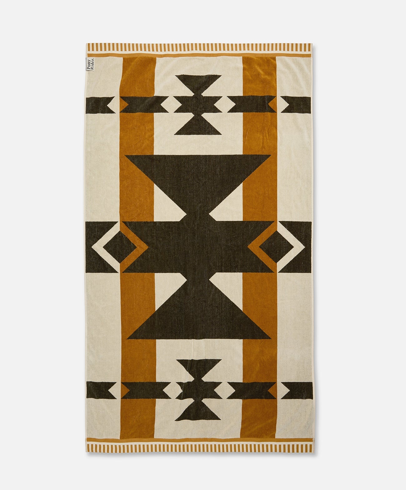 Crafted in a striking blend of deep blue, warm cream, and earthy spice tones, this towel captures the essence of sunbaked canyons, endless skies, and quiet desert sands. The design walks the line between geometric structure and organic movement, echoing the contours of nature’s finest terrain.