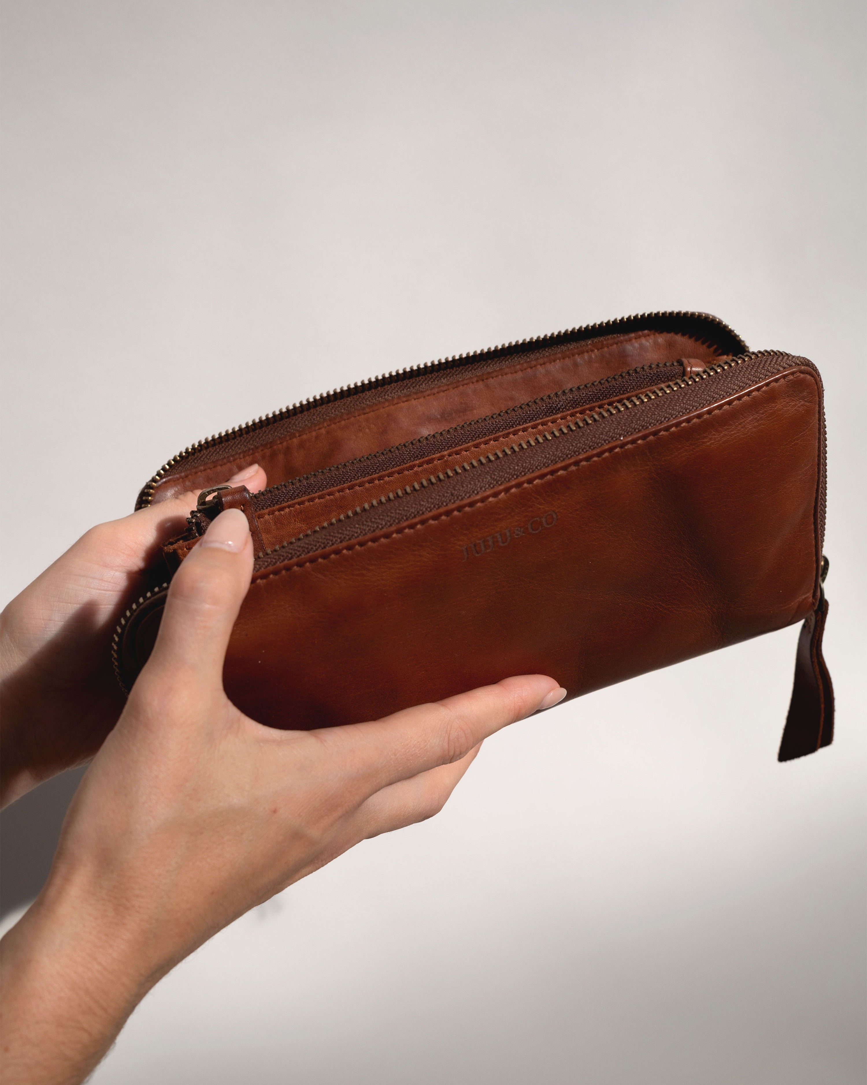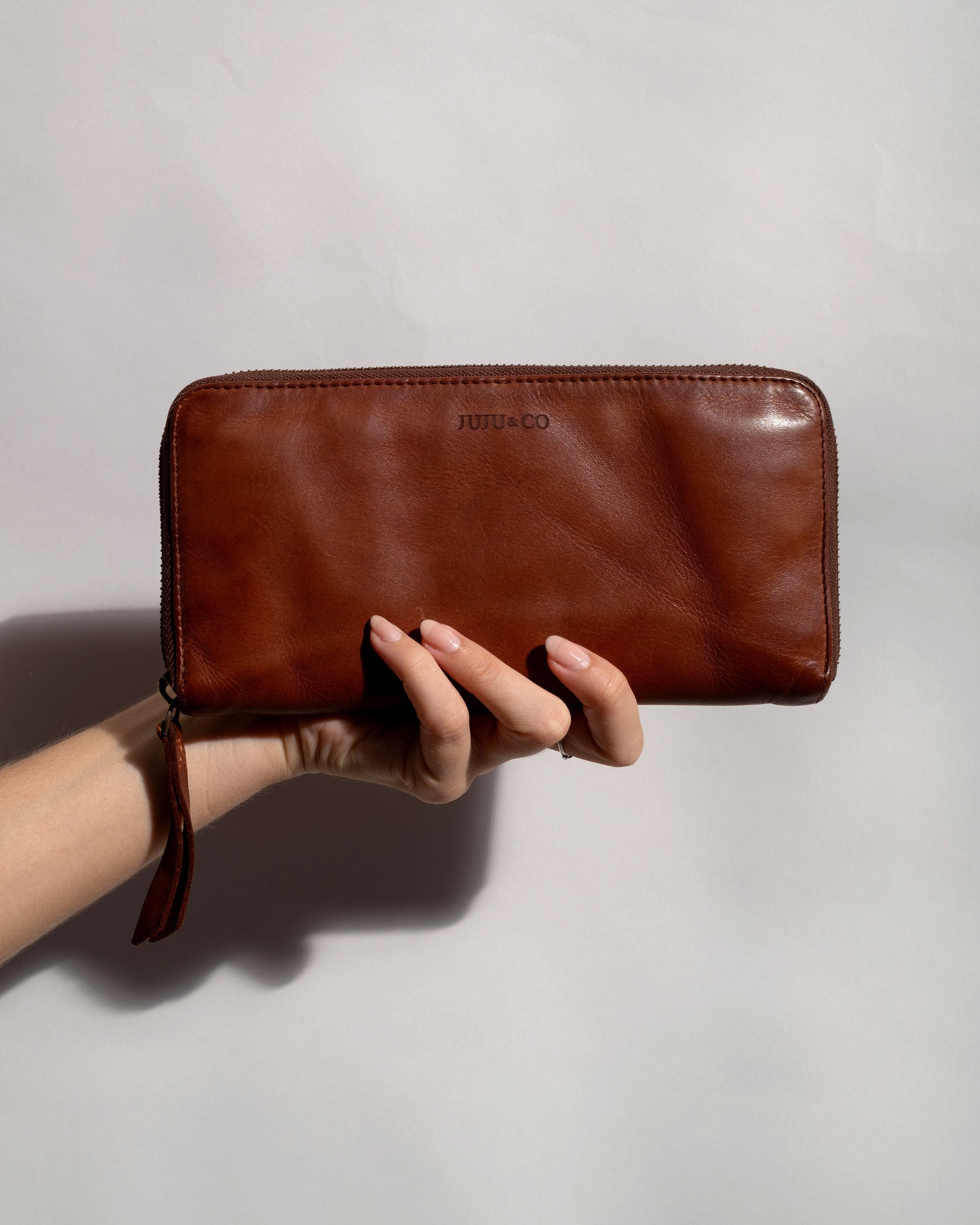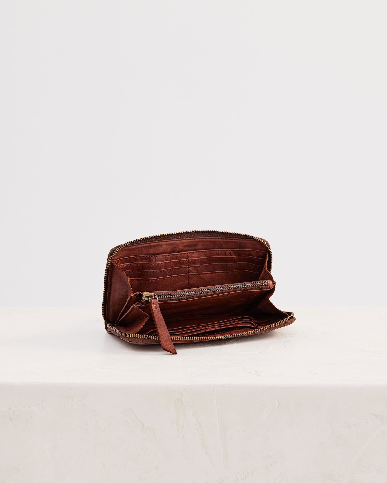 The Slim Wallet made from washed leather. Though light and compact, this wallet has a zip for security and can fit a standard phone. Can be used as a wallet or clutch.