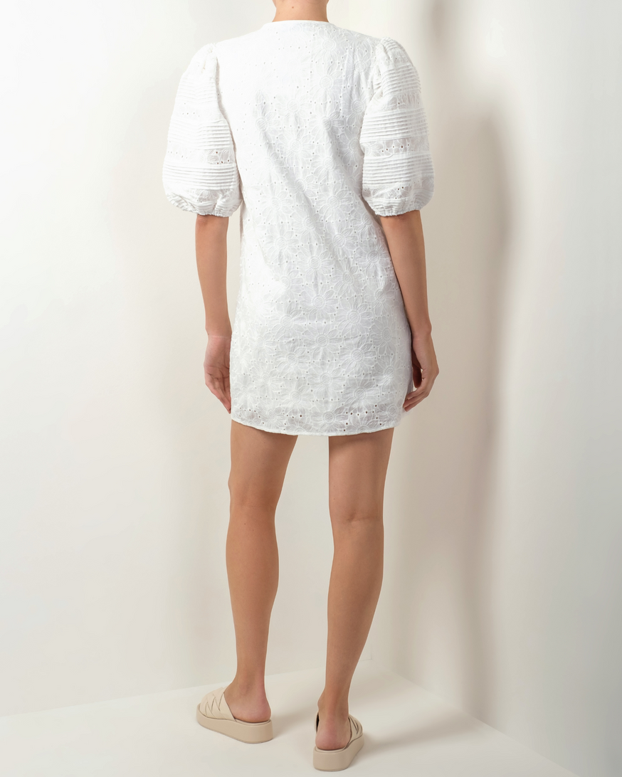The Lillie Lace shirt in White boasts an elegant high neckline with a mandarin collar, stunning puff sleeves adorned with striped lace detail, a button-up front closure, relaxed fit with elastic cuff sleeves, and a lightweight fabric perfect for summer weather.