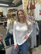 A long sleeved version of the Charlotte Tee - the Clé Layla Long Sleeve Tee features a simple, round neckline and a longer length front & back hem with flattering scooped sides.