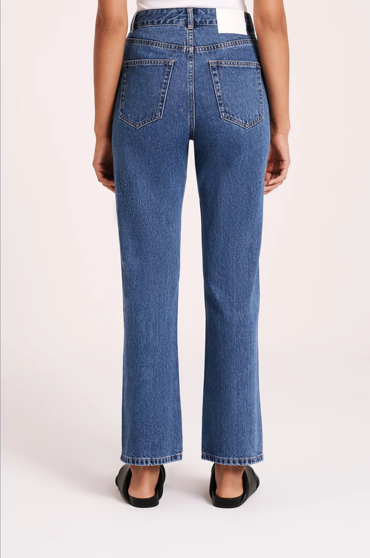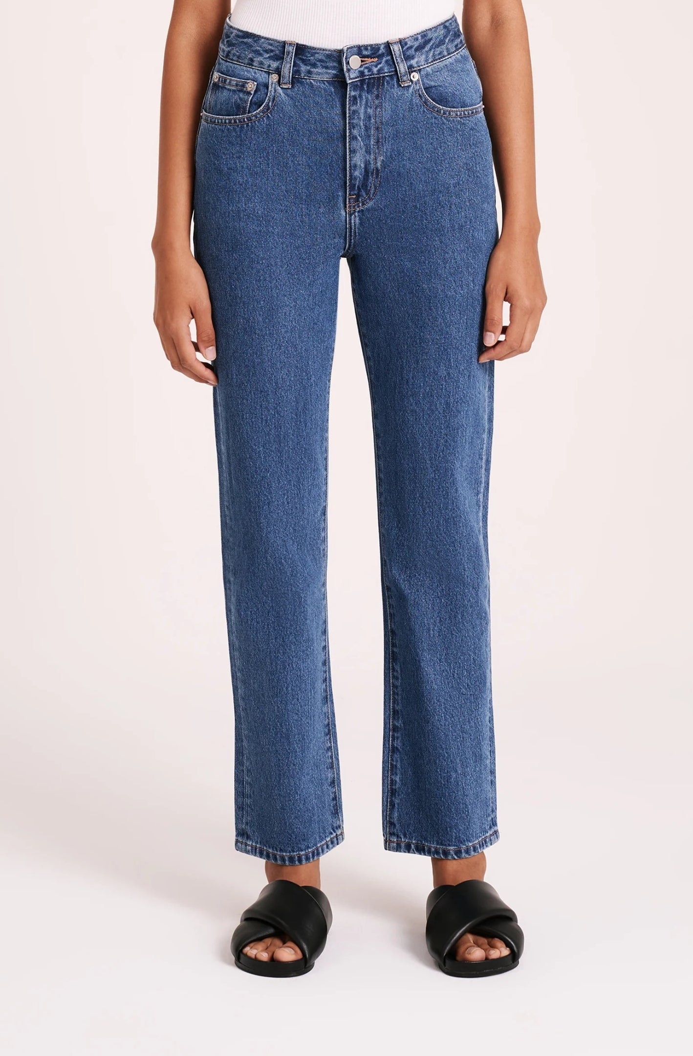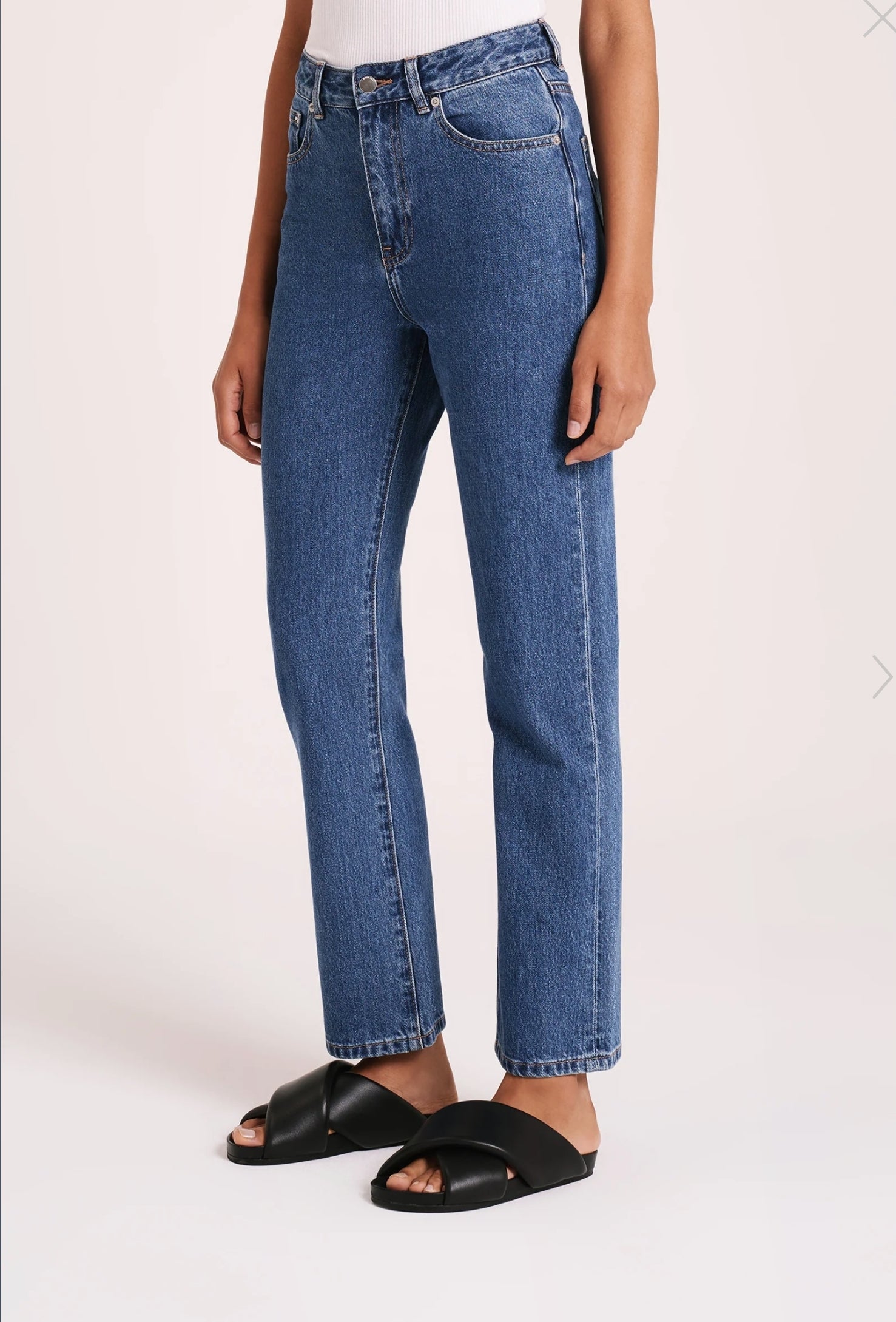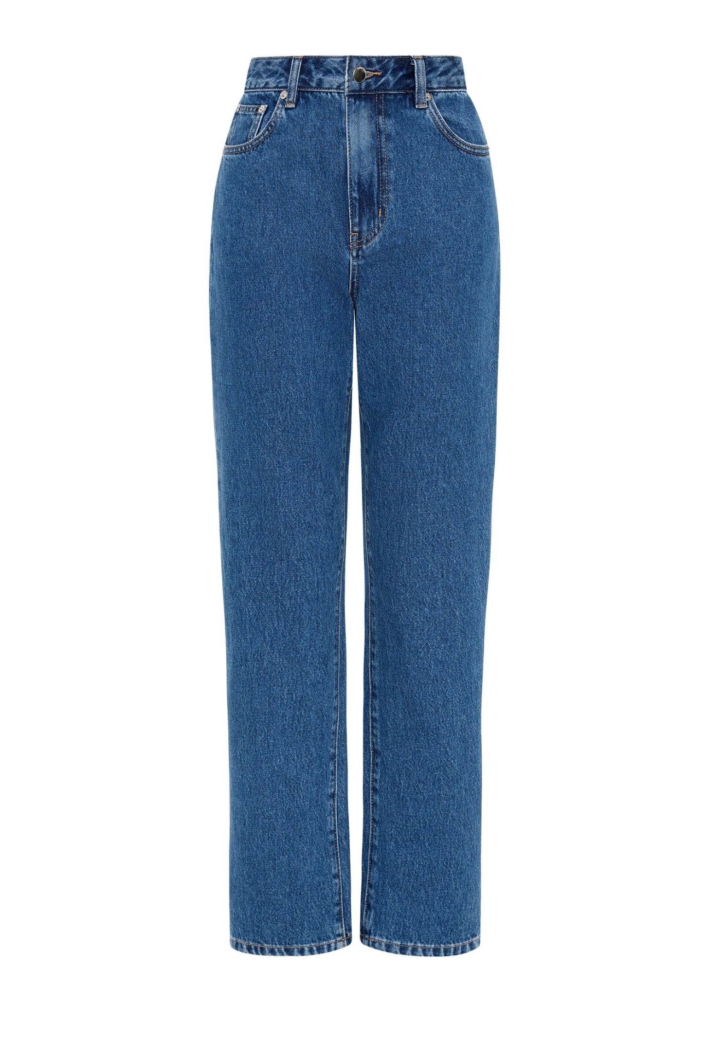 A classic straight leg jean made from 12 oz 100% organic cotton denim, stone washed to an authentic stone wash blue. Shape is a slim straight leg with high rise & fitted waist. Features include branded shank button, rivets & Jacron Back patch. Fits true to size, size up for a more relaxed fit.