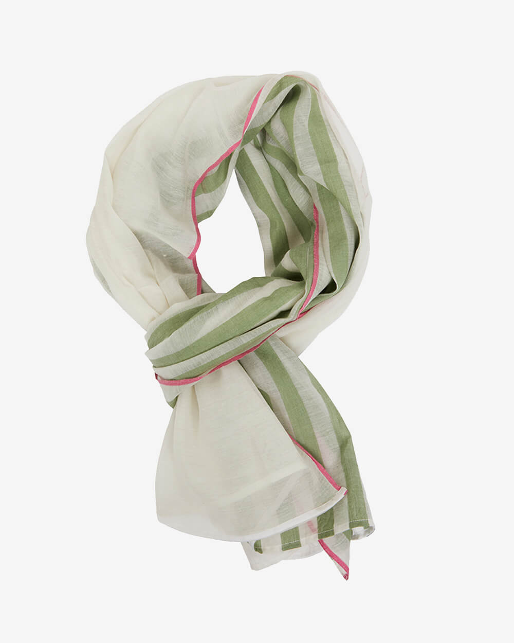 The Elms and King Silk Cotton scarves are crafted from a hand loomed silk cotton blend (30% silk, 70% cotton). The fabric has a beautiful soft, dry hand feel. We produce our designs working directly with a small supplier in India, and all scarves are hand loomed to order. Blush stripe with fluoro peach stripe.