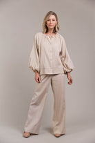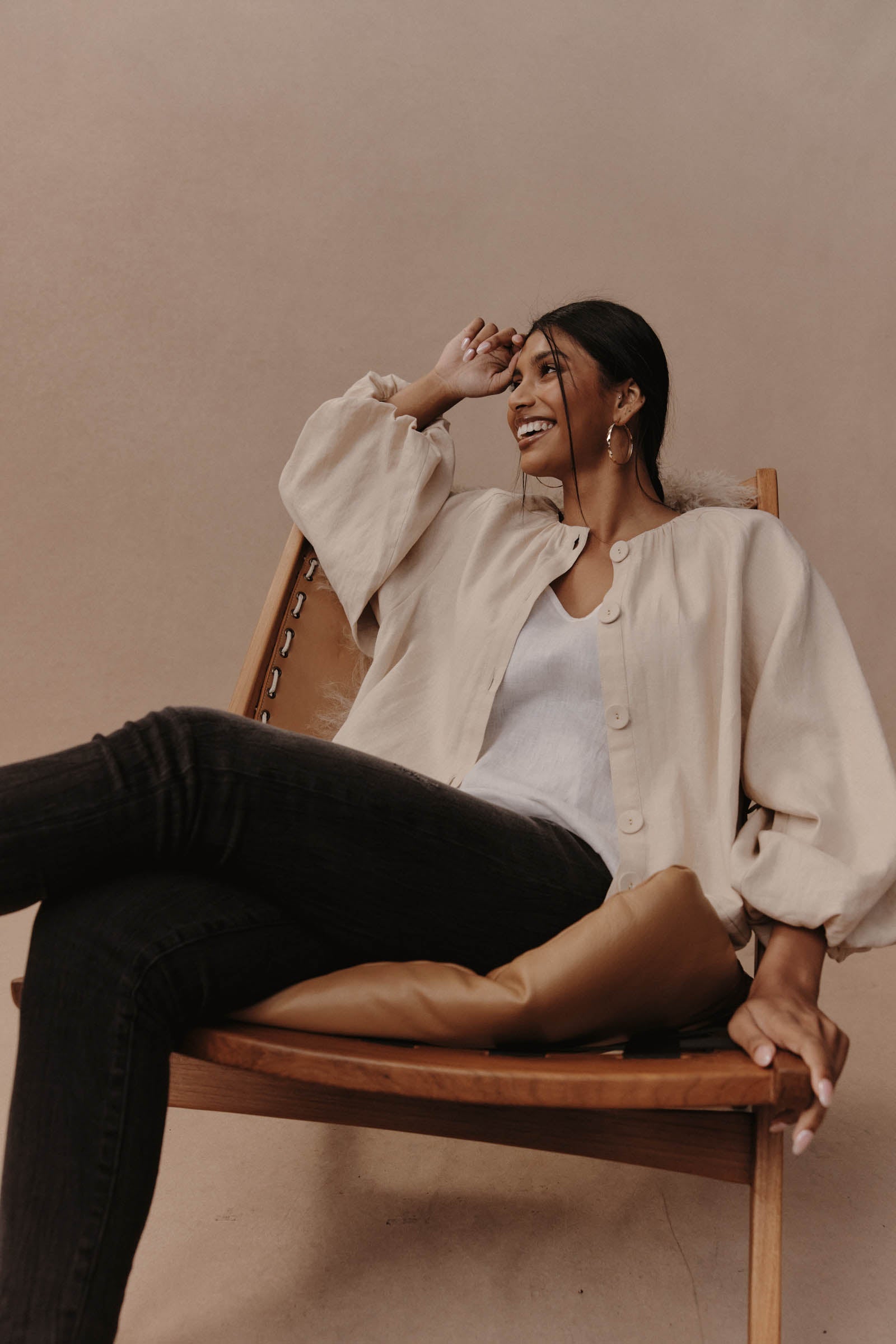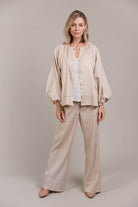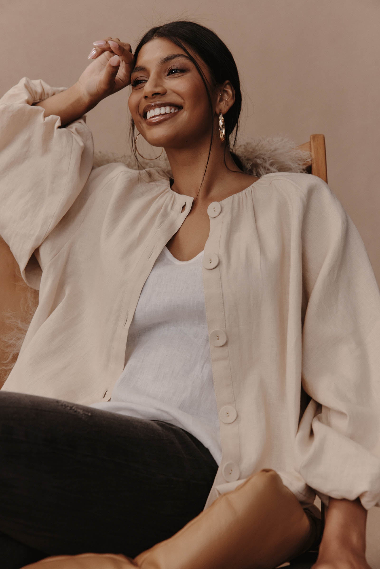 The Laax Button Blouse redefines the classic button-down with a contemporary twist. Crafted from a light linen and cotton blend, it features a collarless neckline, voluminous bishop sleeves, and a relaxed, hip-length silhouette. Wear it fully buttoned for a structured finish, or leave it open over a tank top for a laid-back, undone look.